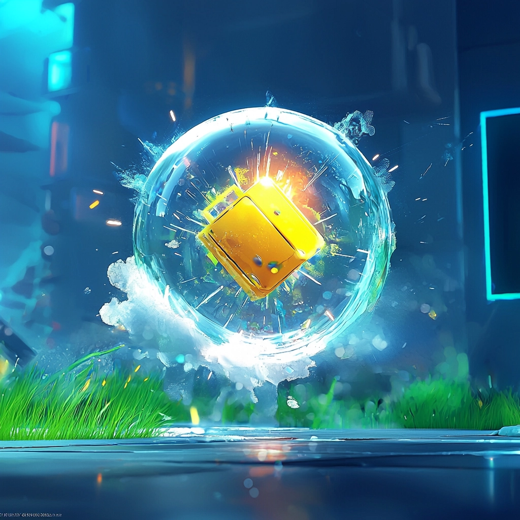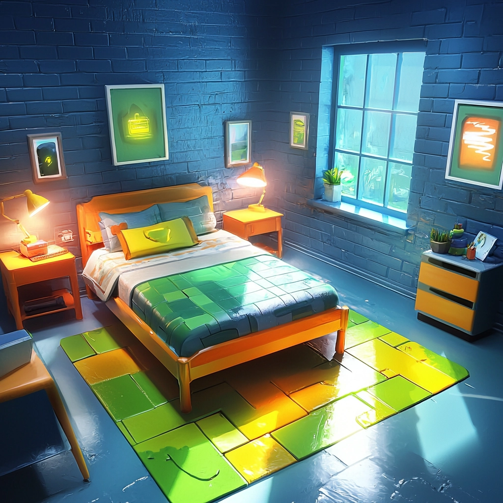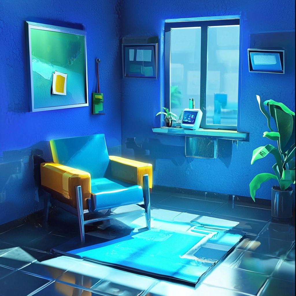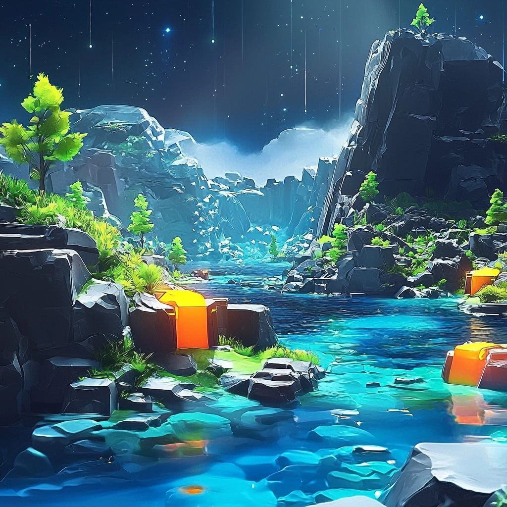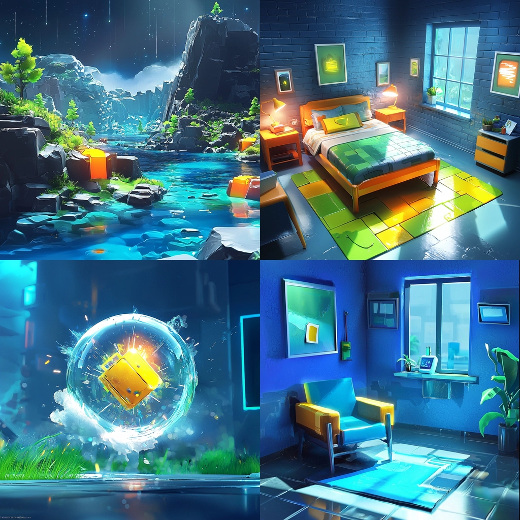 The radiant cyan effectively illuminates various forms, creating a striking contrast against the warm, glowing orange. Light play and reflection subtly define spatial relationships, with the tactility of surfaces accentuated through a soft sheen that animates the scene with an energetic vibrancy.