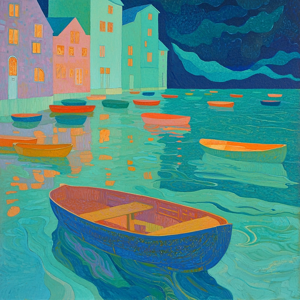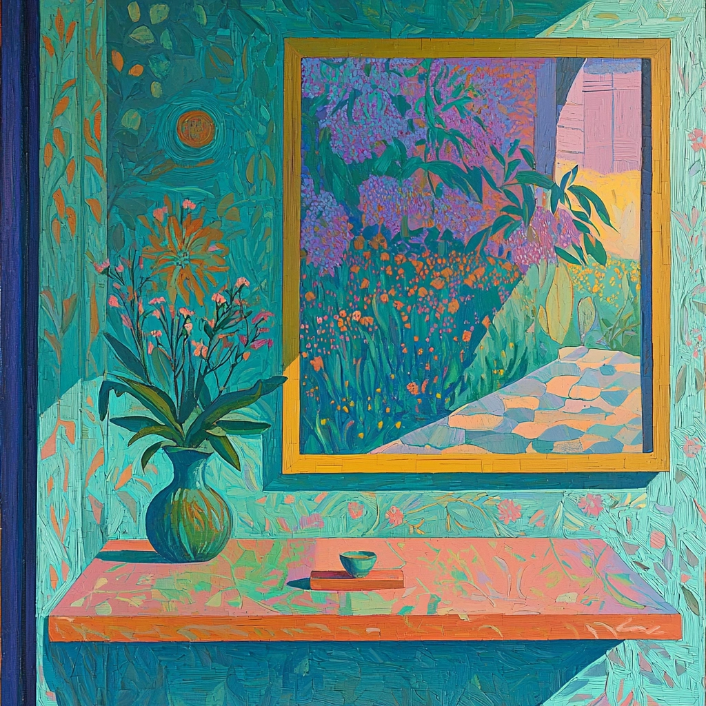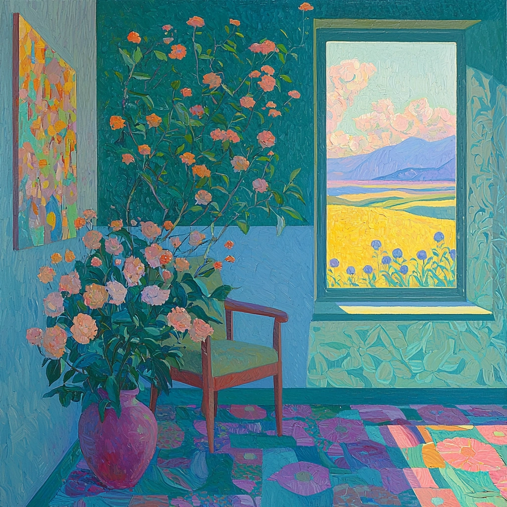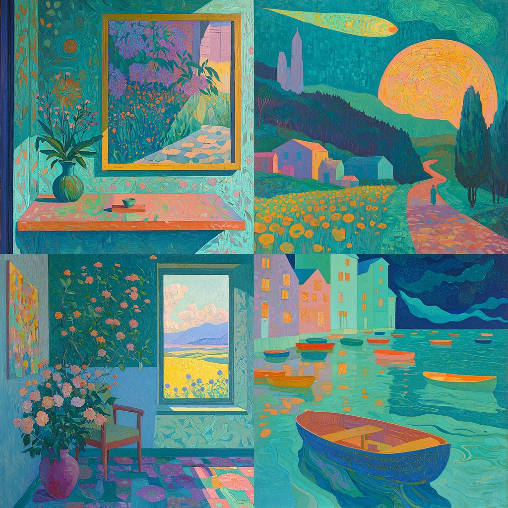 The lighting accentuates vivid, saturated colors, providing a balanced luminosity across the compositions. The texture appears smooth, with a slightly tactile finish, emphasizing spatial harmony and depth.