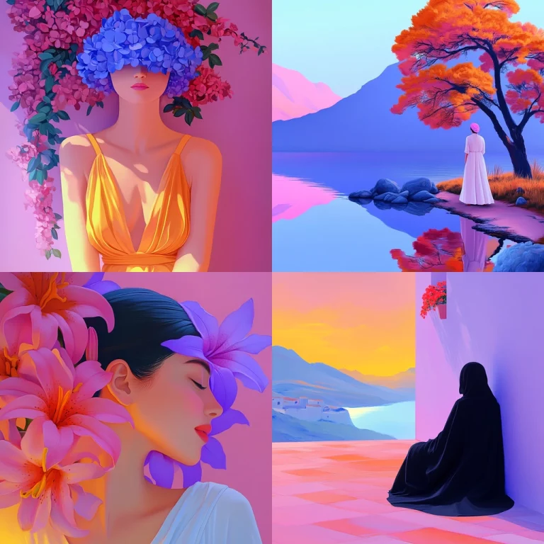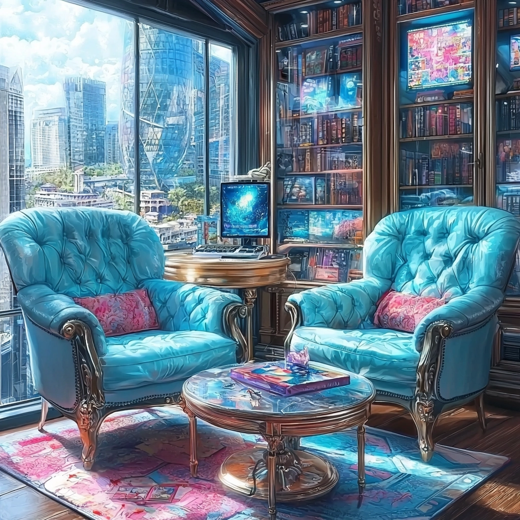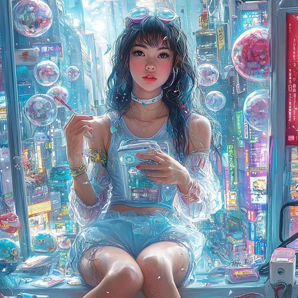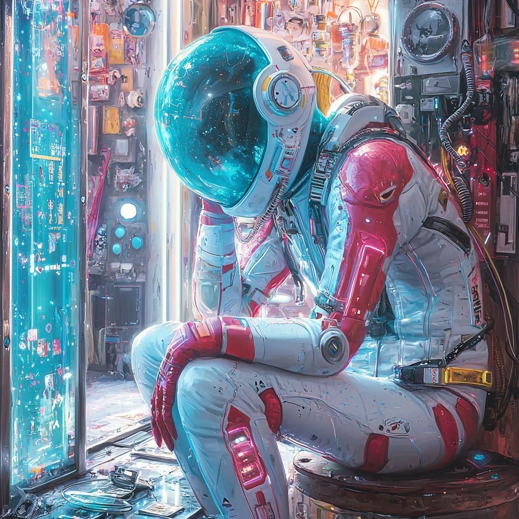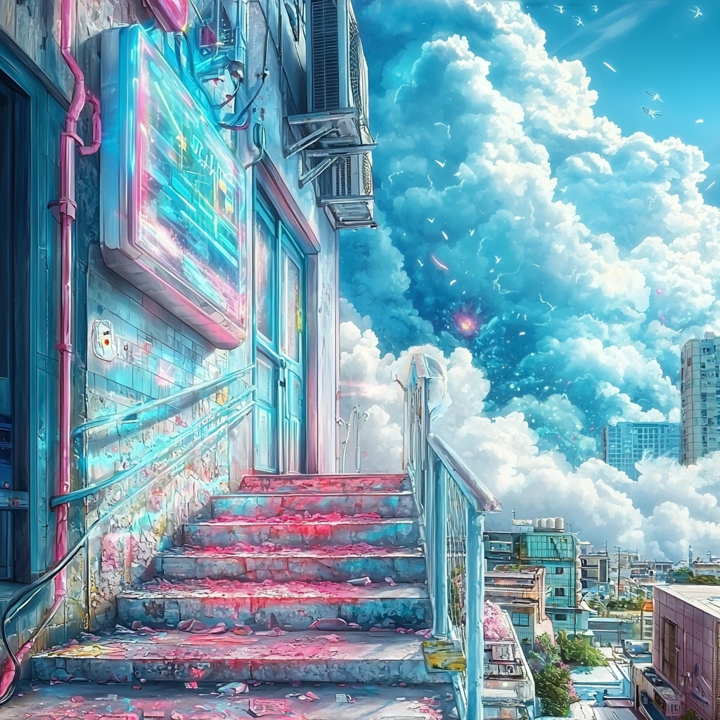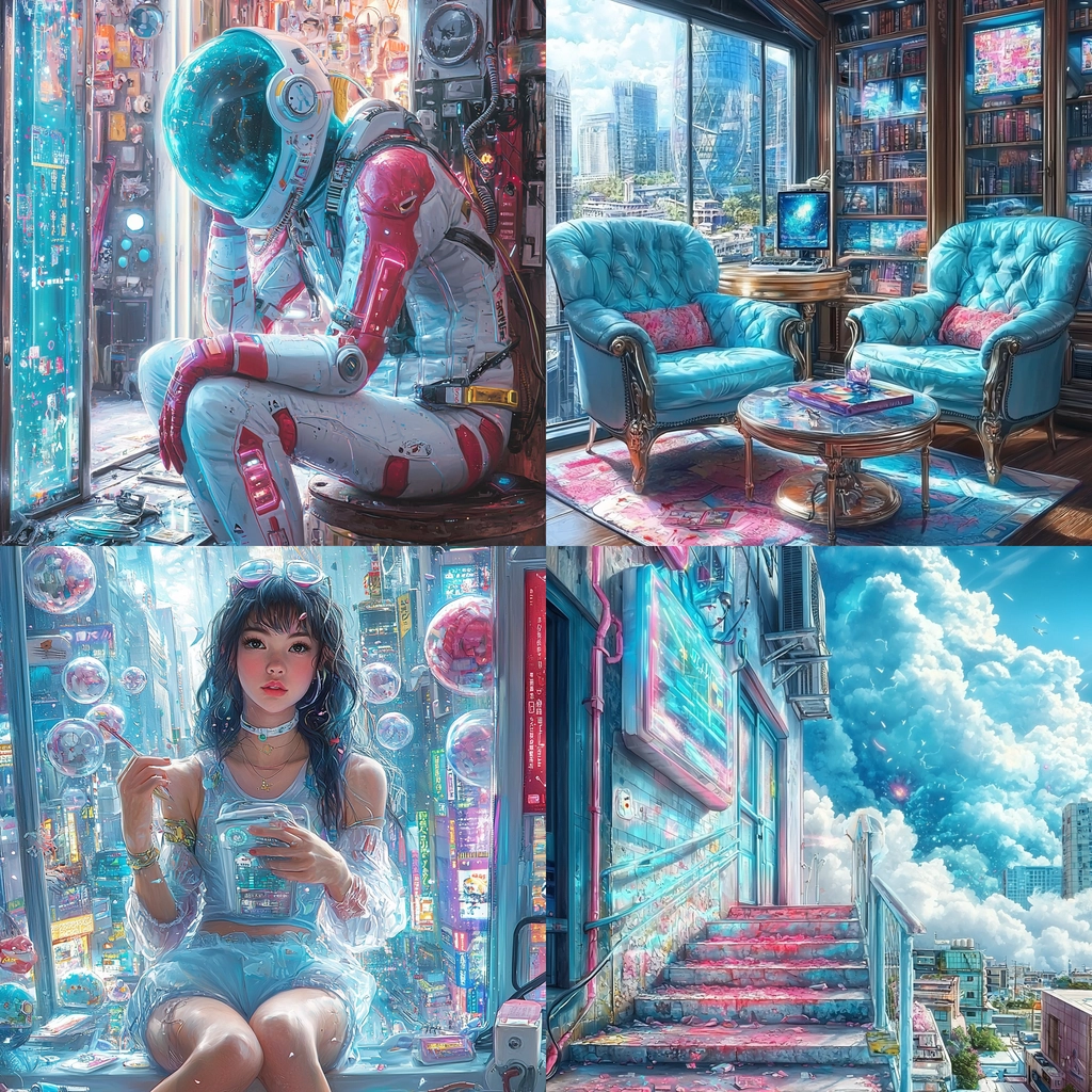 The artwork boasts vivid cyan and pink hues with high contrast, employing intricate lighting that creates a sense of depth and immersion. The textures are finely detailed, enhancing the visual intricacy in each composition, while the spatial arrangement offers a dynamic perspective filled with futuristic elements.