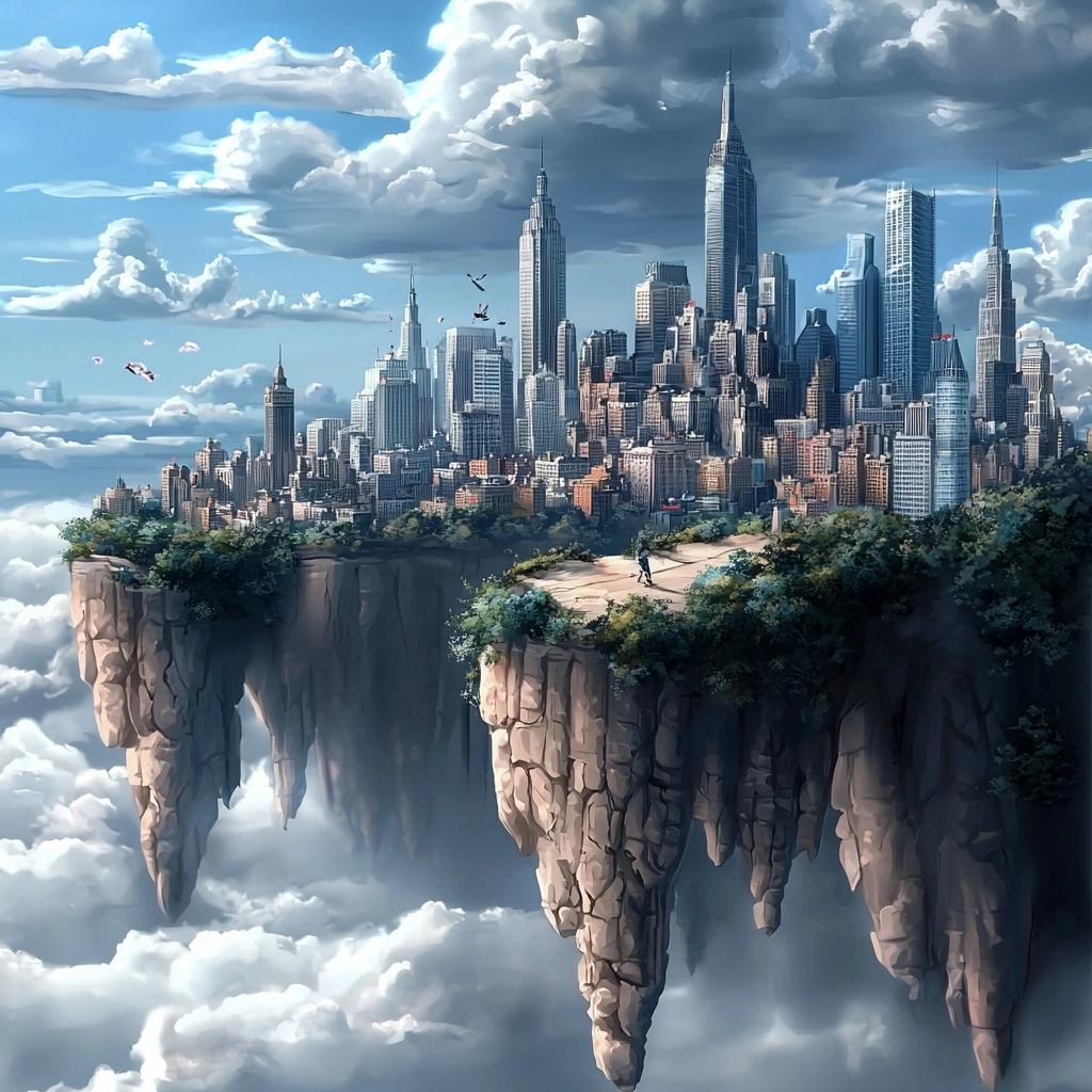 Strong lighting highlights contours, producing a near-tangible texture. Rich blue and gray tones dominate, enhancing depth and creating a sense of three-dimensional space. Surreal elements are finely detailed.