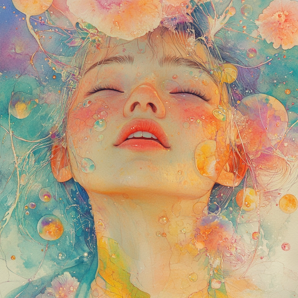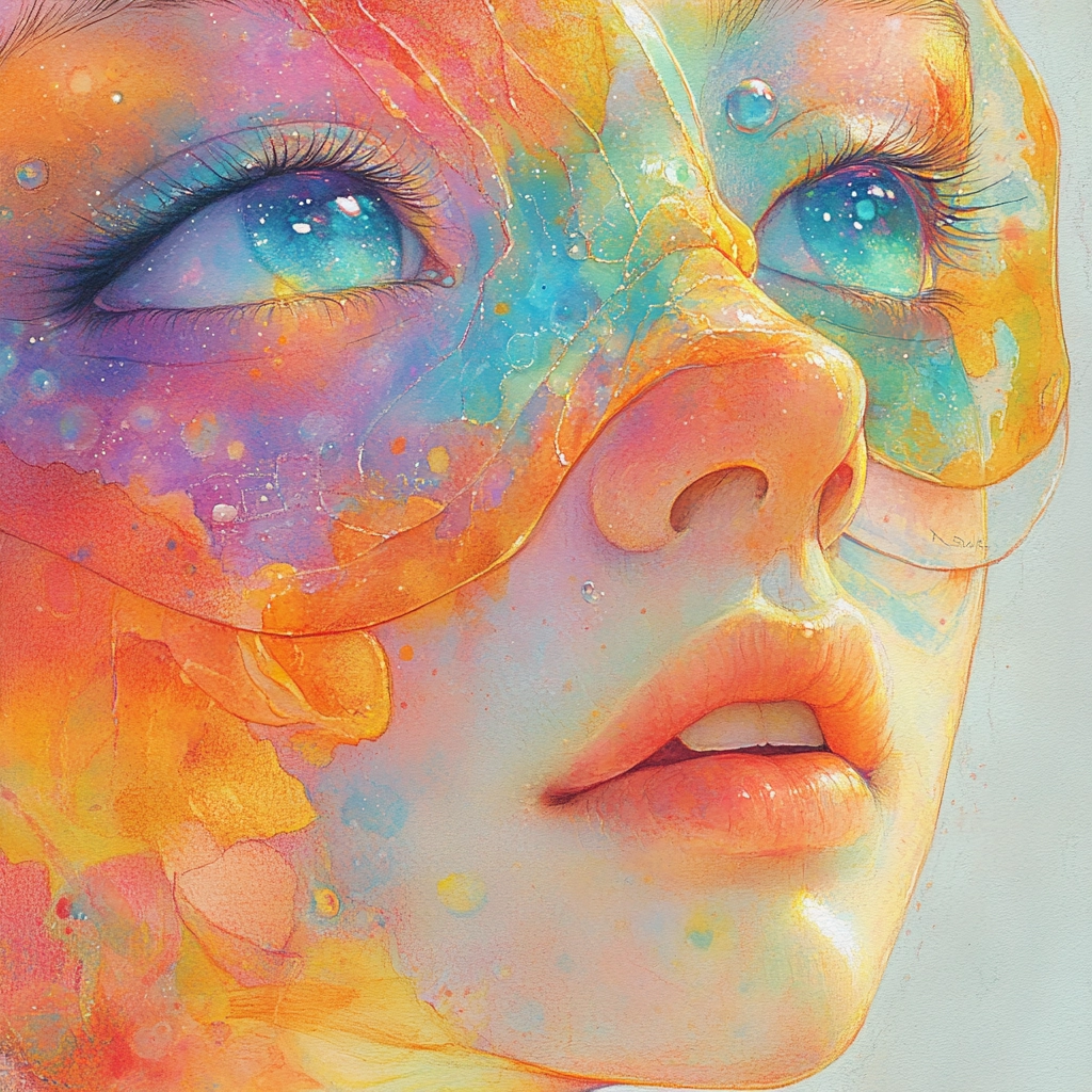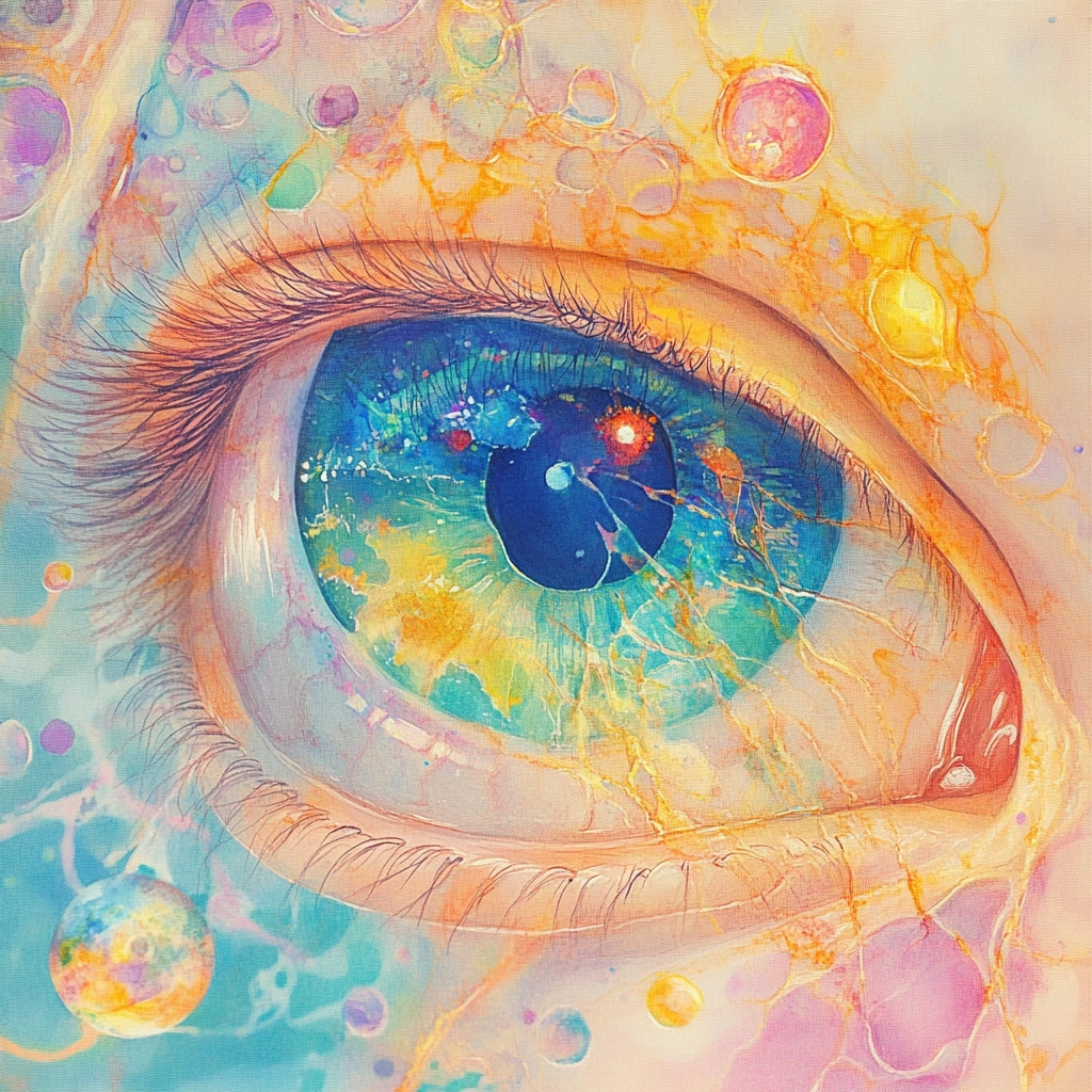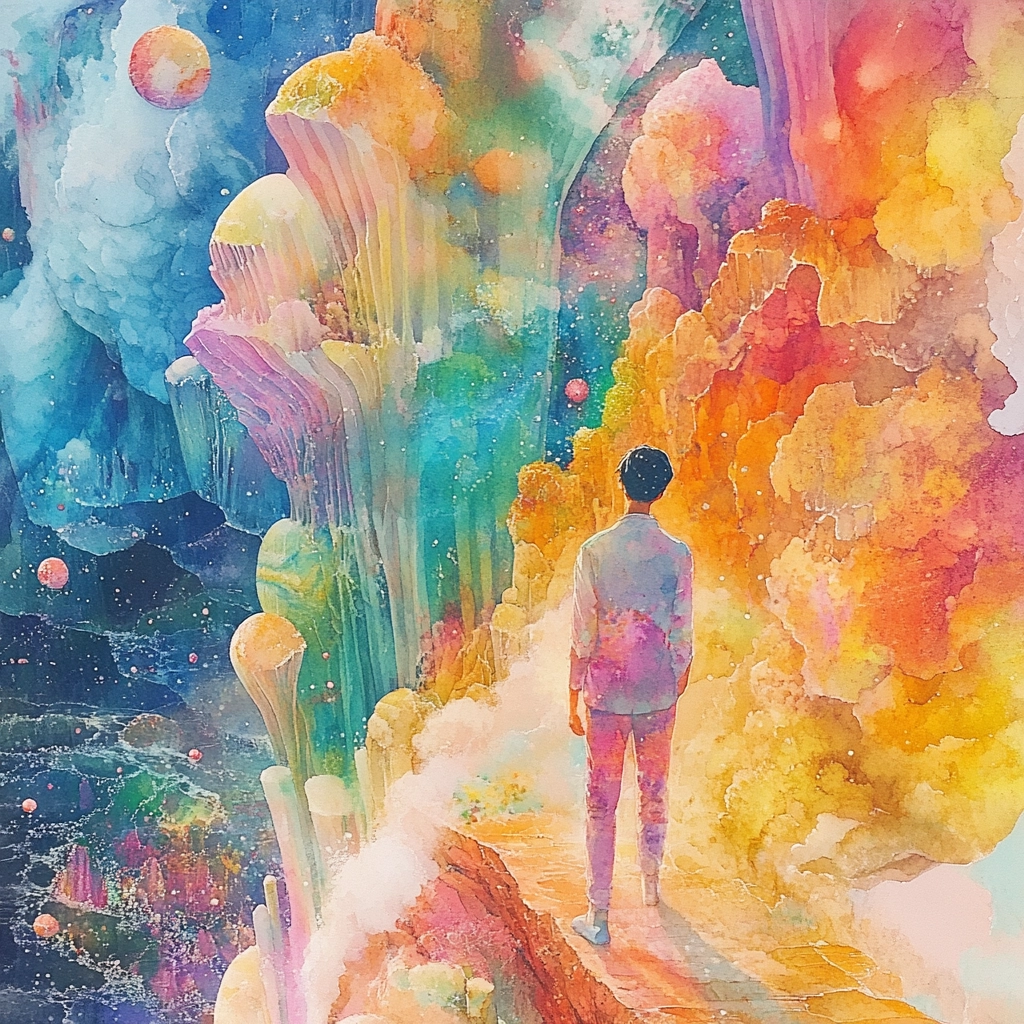 The use of vivid colors like blue and pink, paired with soft lighting, creates a sense of depth and movement. Textures appear layered and dynamic, conveying a swirling spatial dimension enhanced by fluid brushwork.