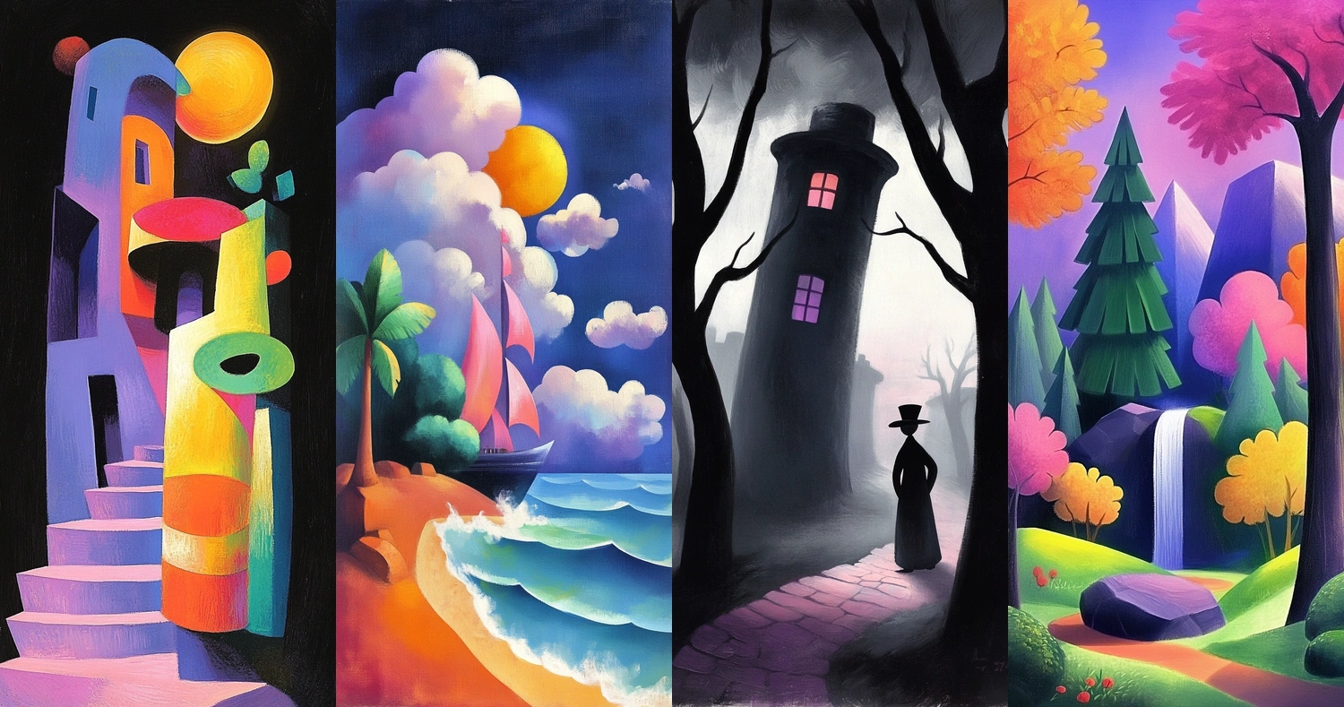 The lighting effects emphasize the vibrant and contrasting colors, creating a sense of depth and dimension. Textures are smooth and polished, while the spatial arrangement feels both expansive and detailed.