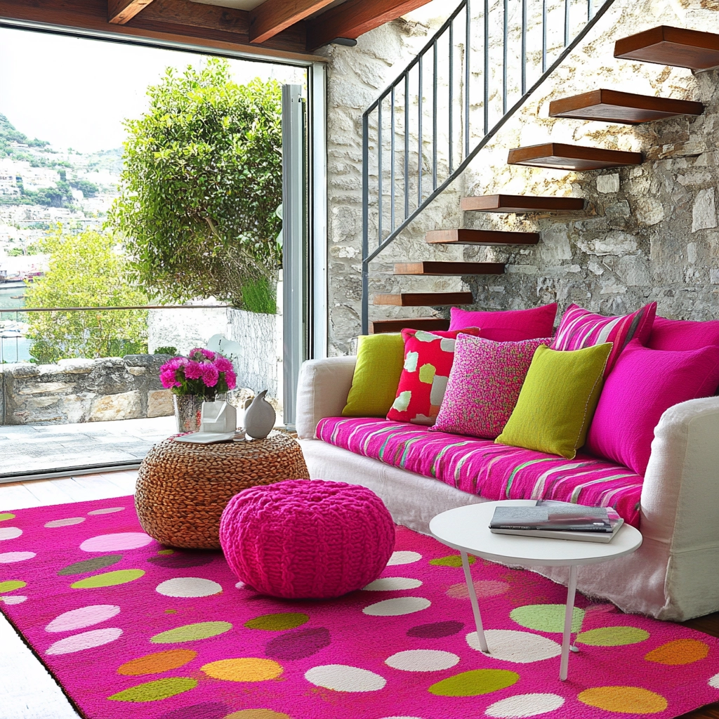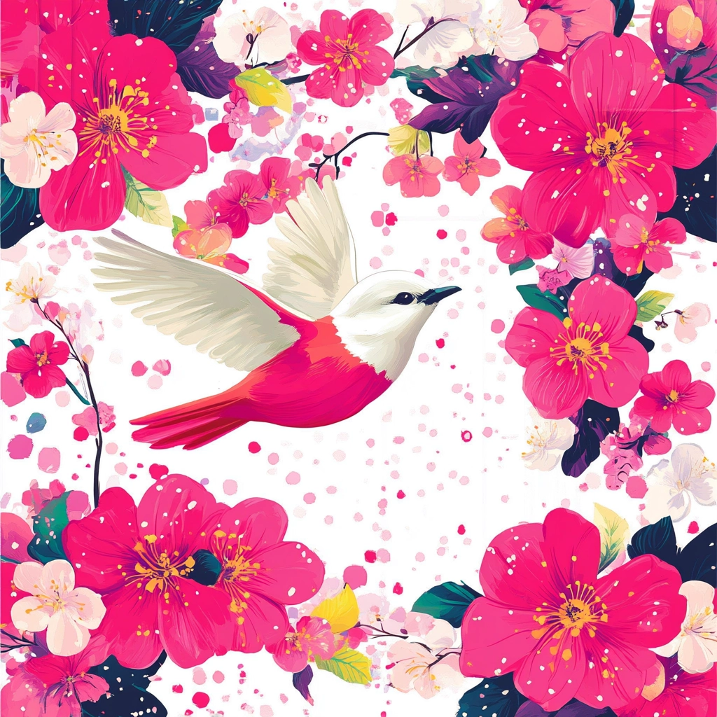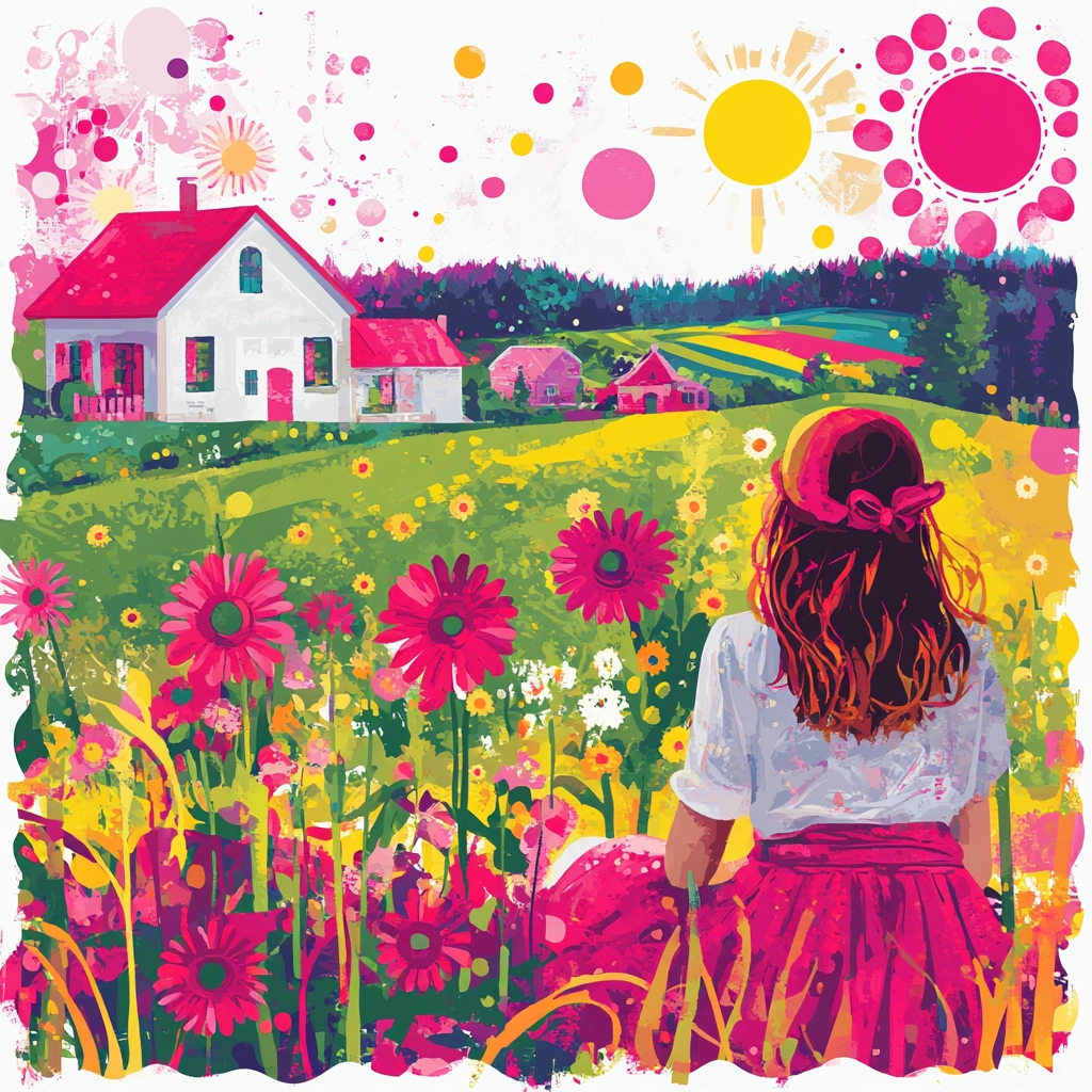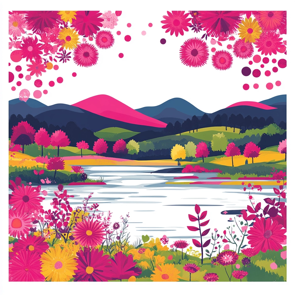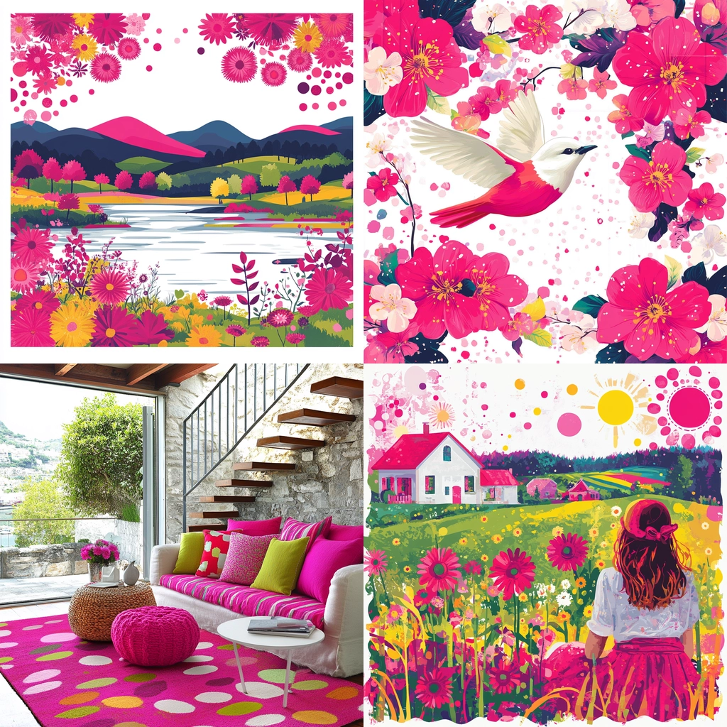 Characterized by vibrant lighting that enhances the saturation of pinks and yellows. Dramatic contrasts create a captivating sense of depth. Textures are smooth yet bold, emphasizing the lively arrangement of hues across the canvas.