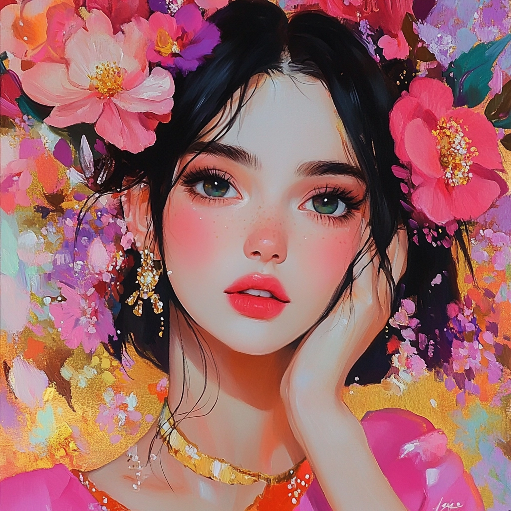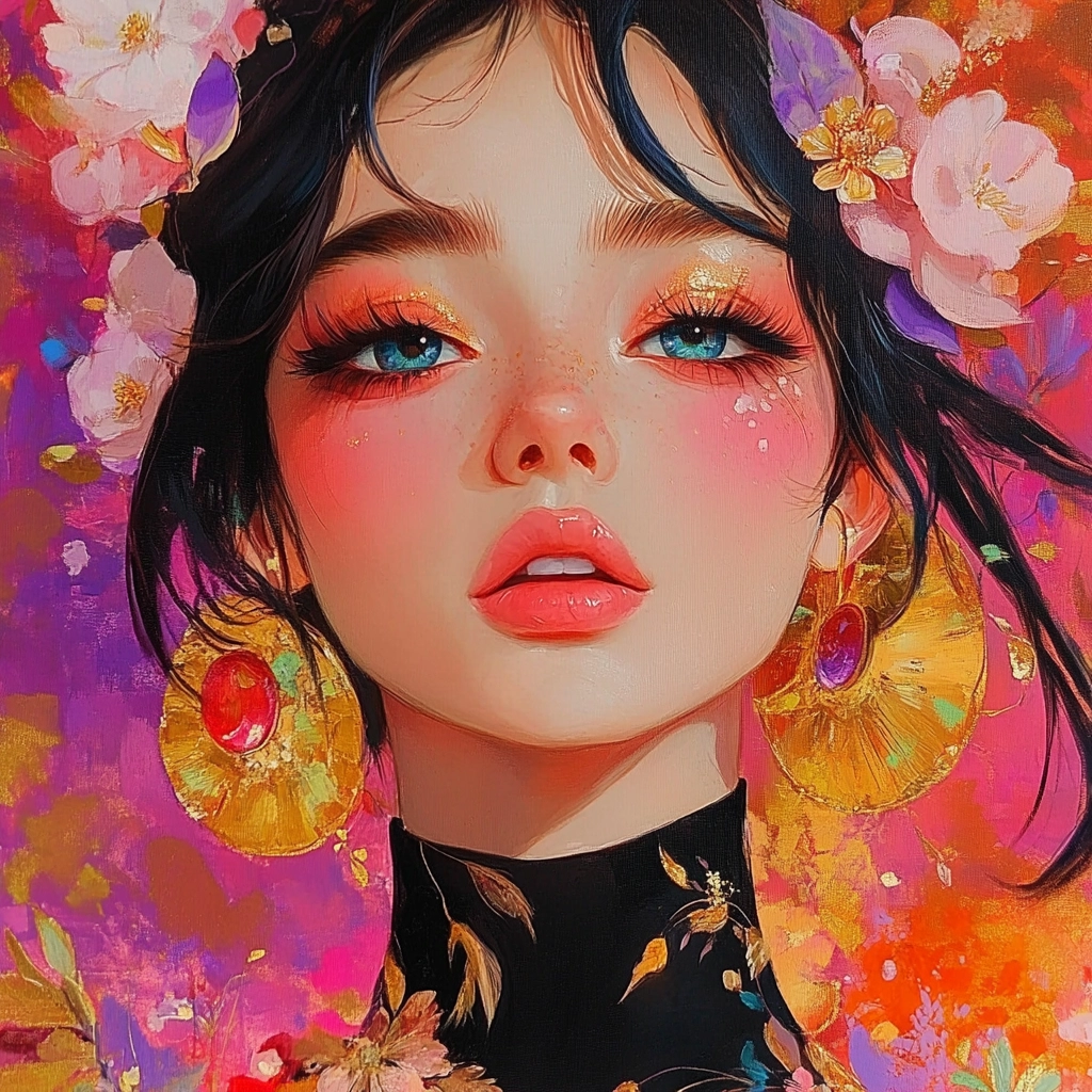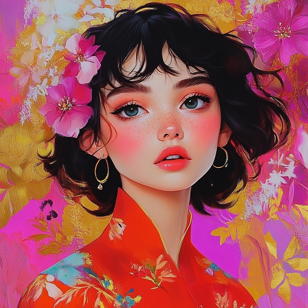 Bright lighting effects accentuate the vivid colors, leading to a lively visual dynamic. The texture is enriched by delicate floral patterns, generating a sense of layered depth. Smooth transitions between foreground and background elements add spatial complexity.