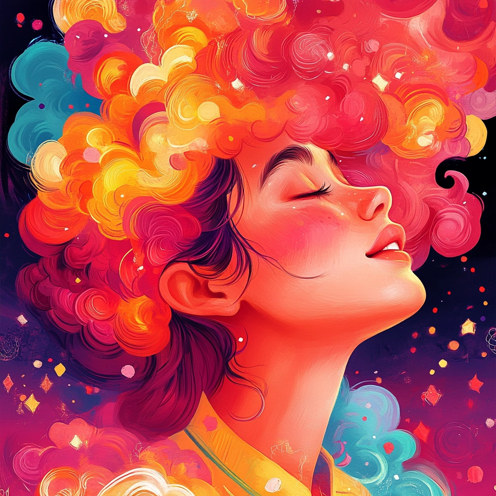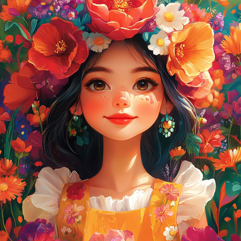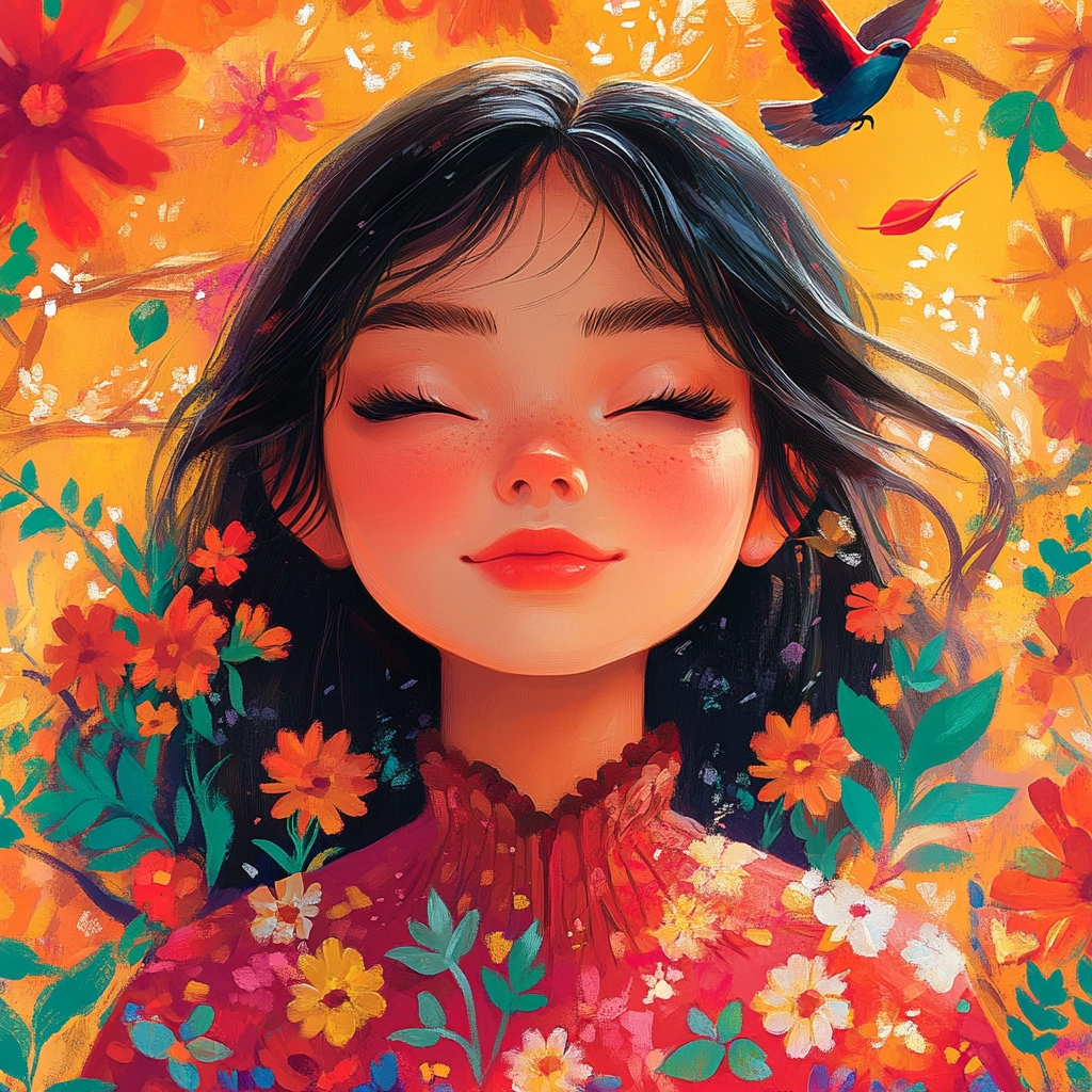The lighting emphasizes warm hues and highlights saturated colors. Vivid textures create a sense of depth and liveliness. The scenes incorporate dynamic floral patterns with bold color contrasts, employing a surreal approach to texture and color interaction.