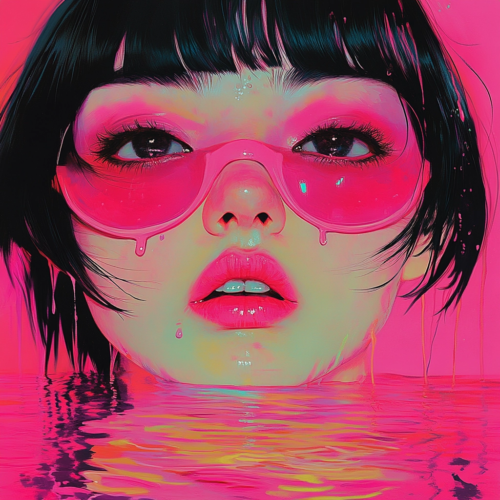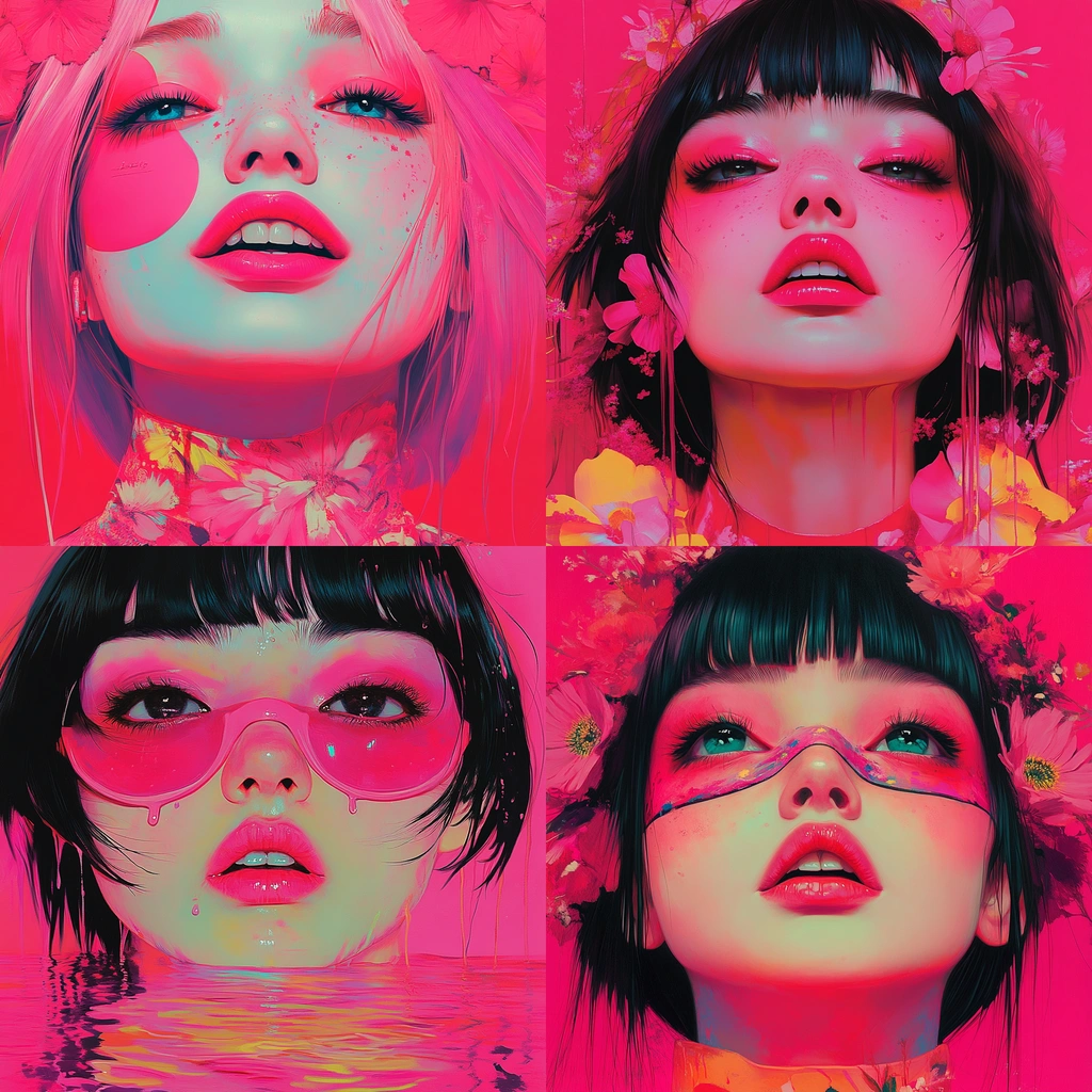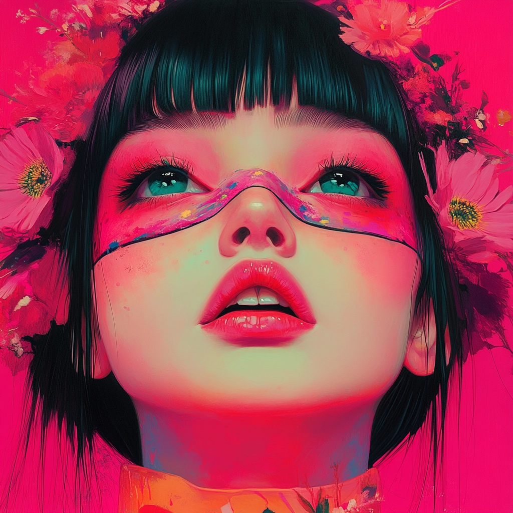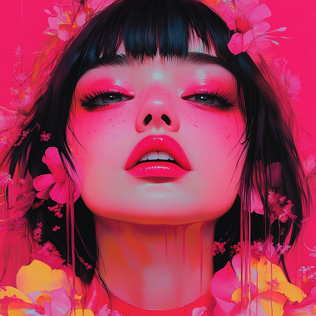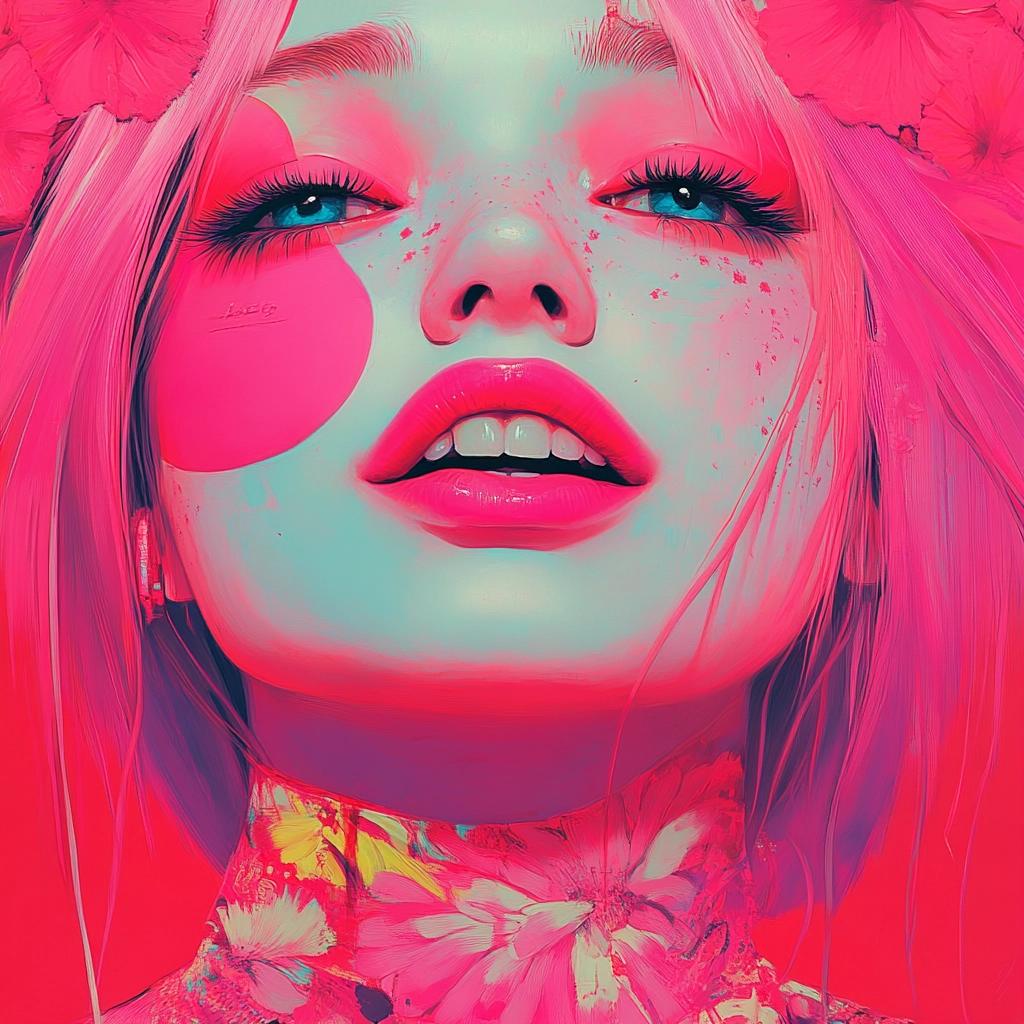 The artwork features vibrant pinks and reds, creating a vivid color explosion. Floral details contribute to a layered texture, while balanced lighting enhances the contrast and depth.