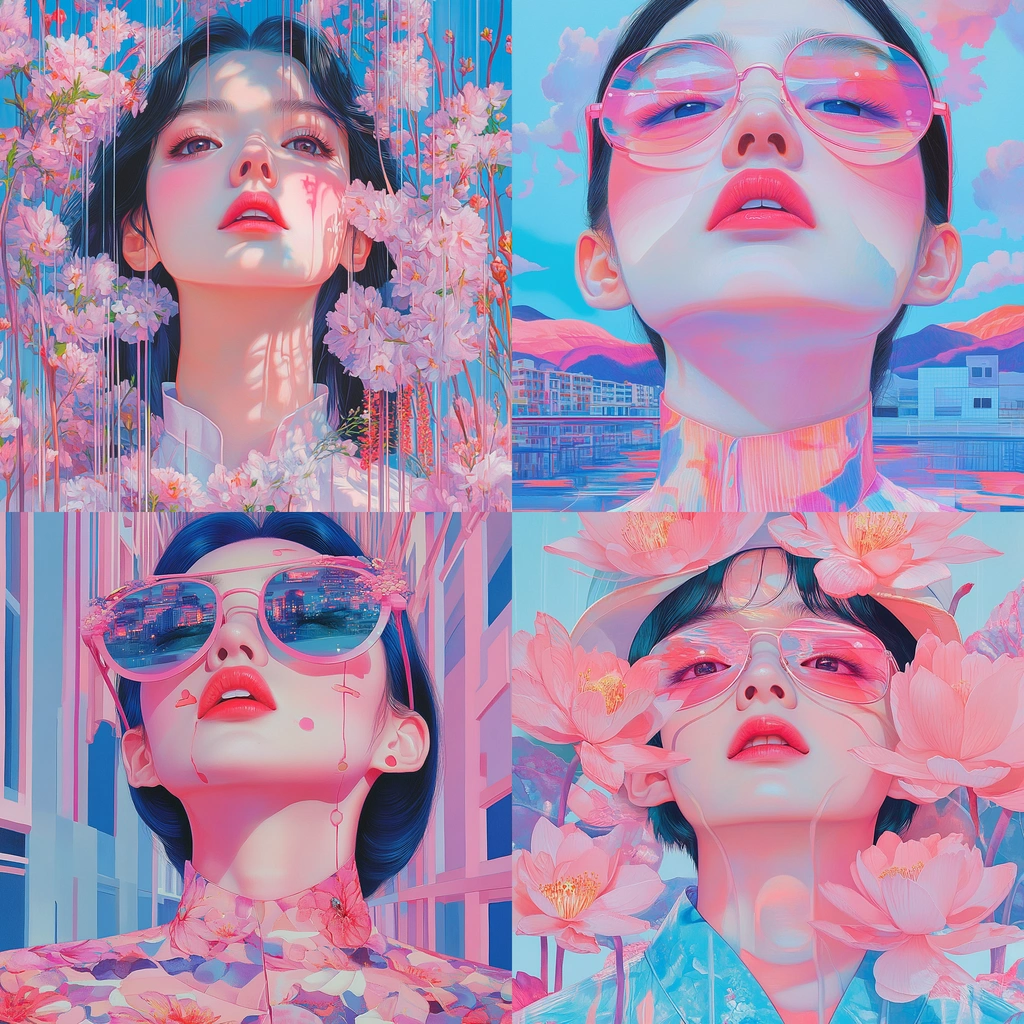 Bright and harmonious use of floral motifs and soft pastel colors characterizes the presentation, with a dynamic interplay between the vibrant and the muted.