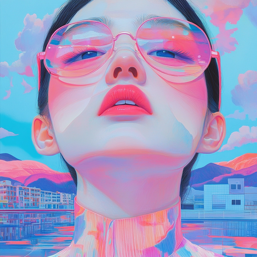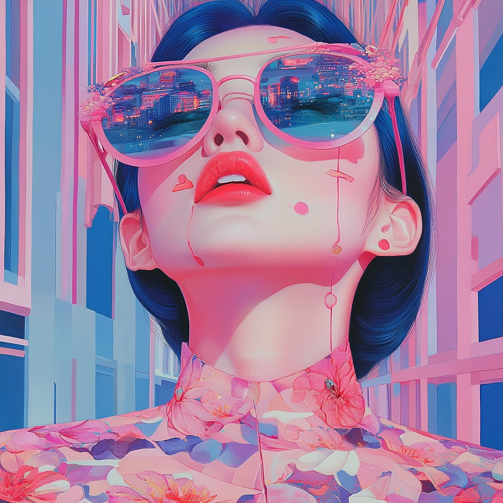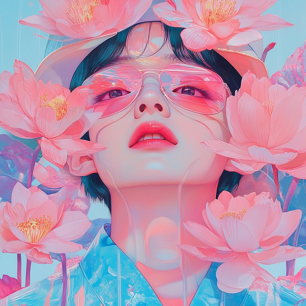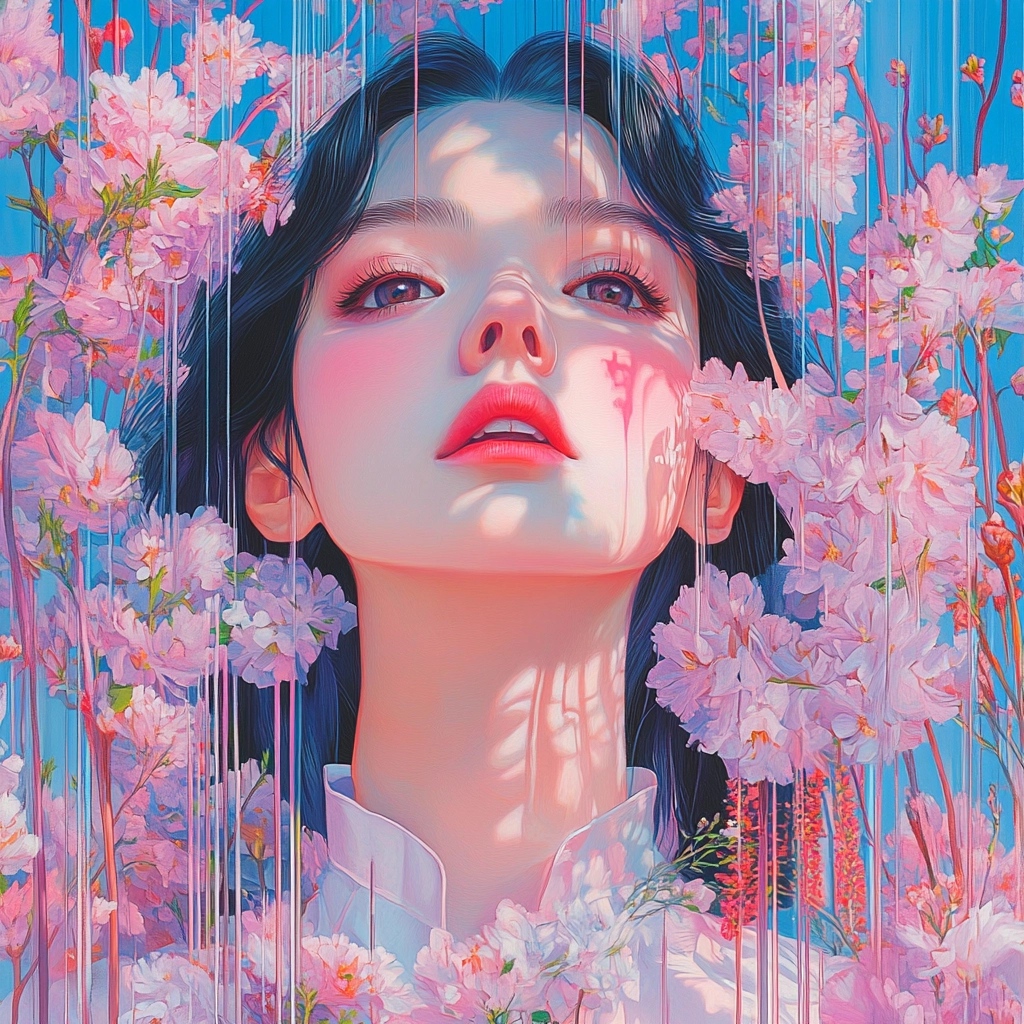 The artwork employs bright light to enhance the vividness of floral elements against a gentle pastel backdrop, creating depth through layered composition and detail-rich textures that amplify the visual impact.