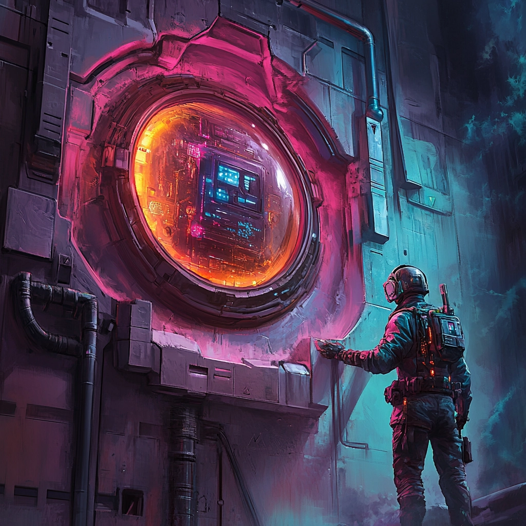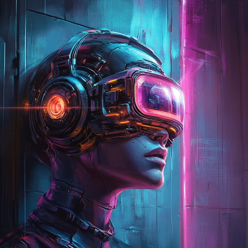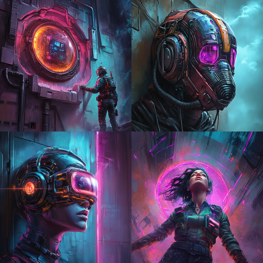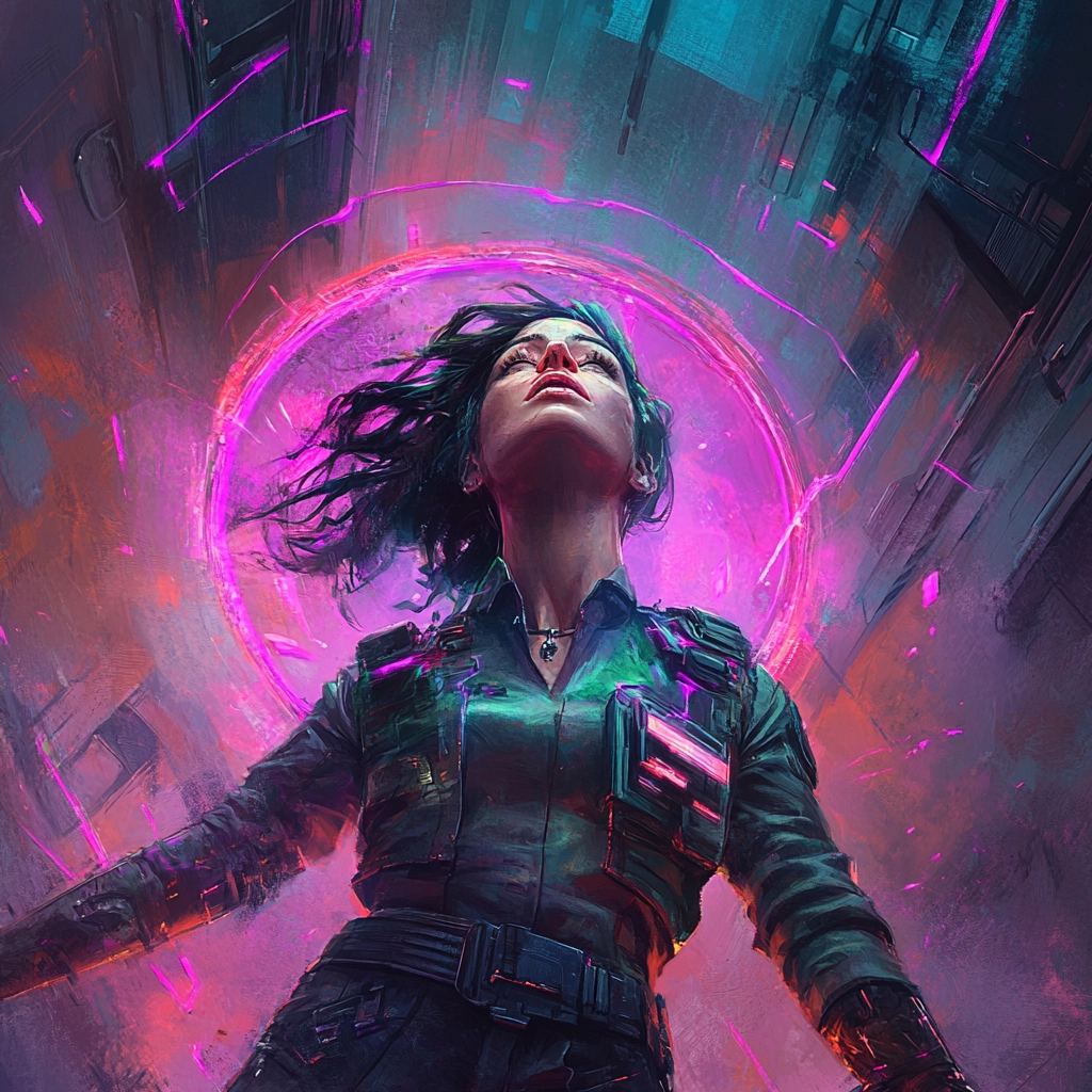 Dynamic use of vibrant colors with high contrast and futuristic elements.