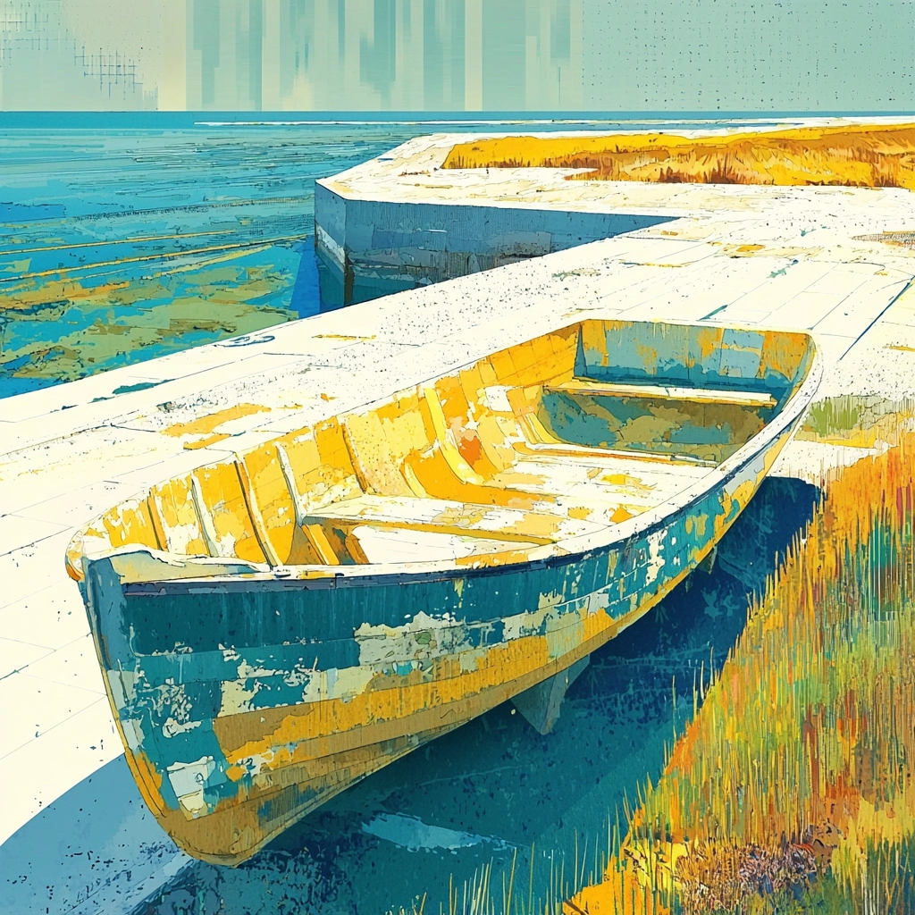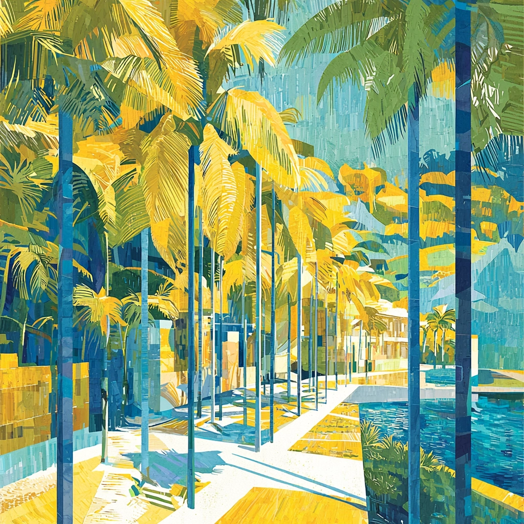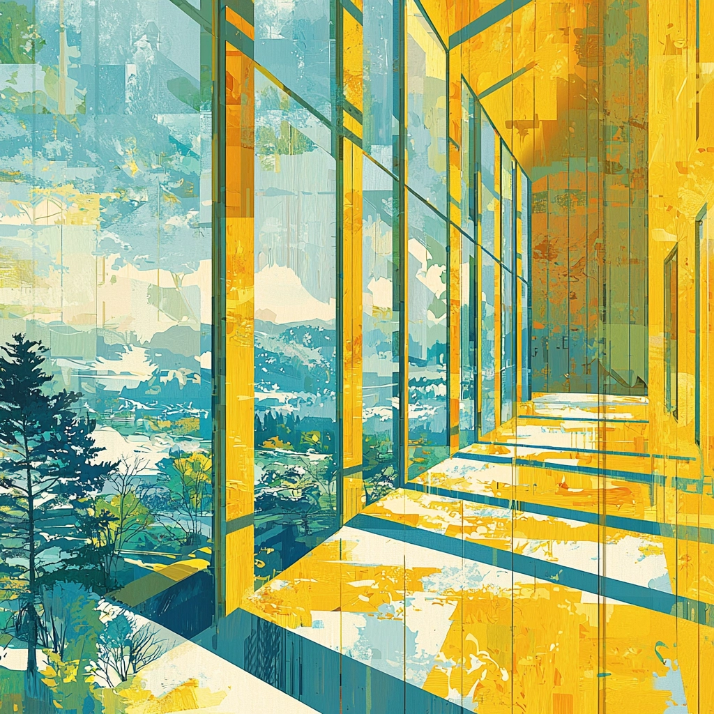 The lighting is bright and highlights the sharp angles of forms, while the colors are vibrant, emphasizing contrasts. The space feels expansive, with a focus on linear perspectives created through structured layering and textured brushwork.