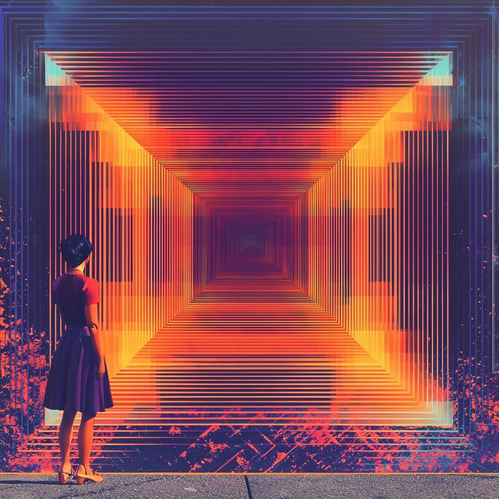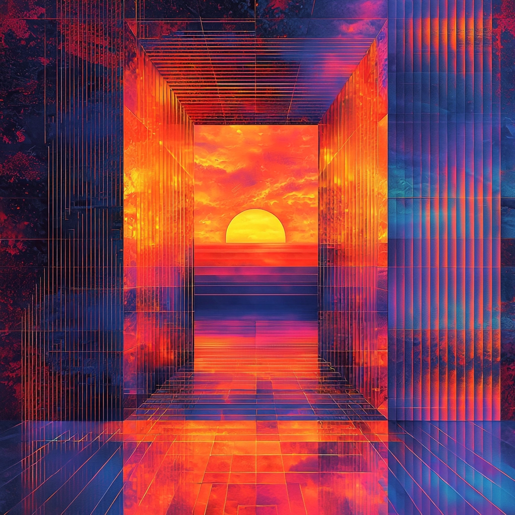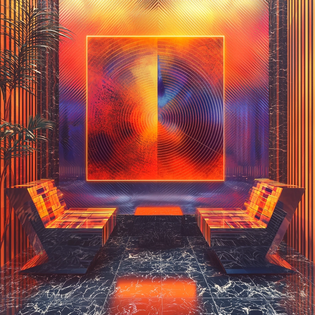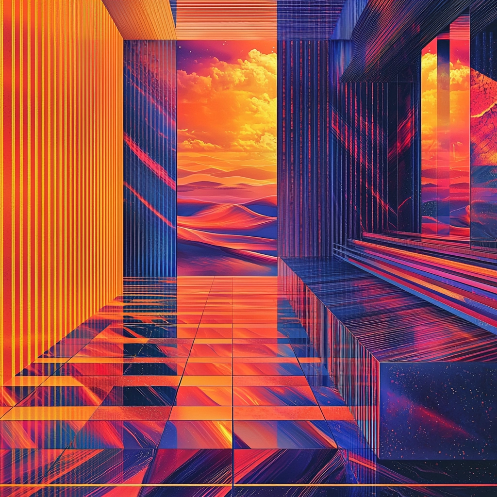 Lighting effects include intense, contrasting hues that amplify the vibrant color palette. The spatial sense is enhanced through precise geometric shapes and lines, creating a structured environment. Textures are smooth and polished, adding to the modernistic appearance.