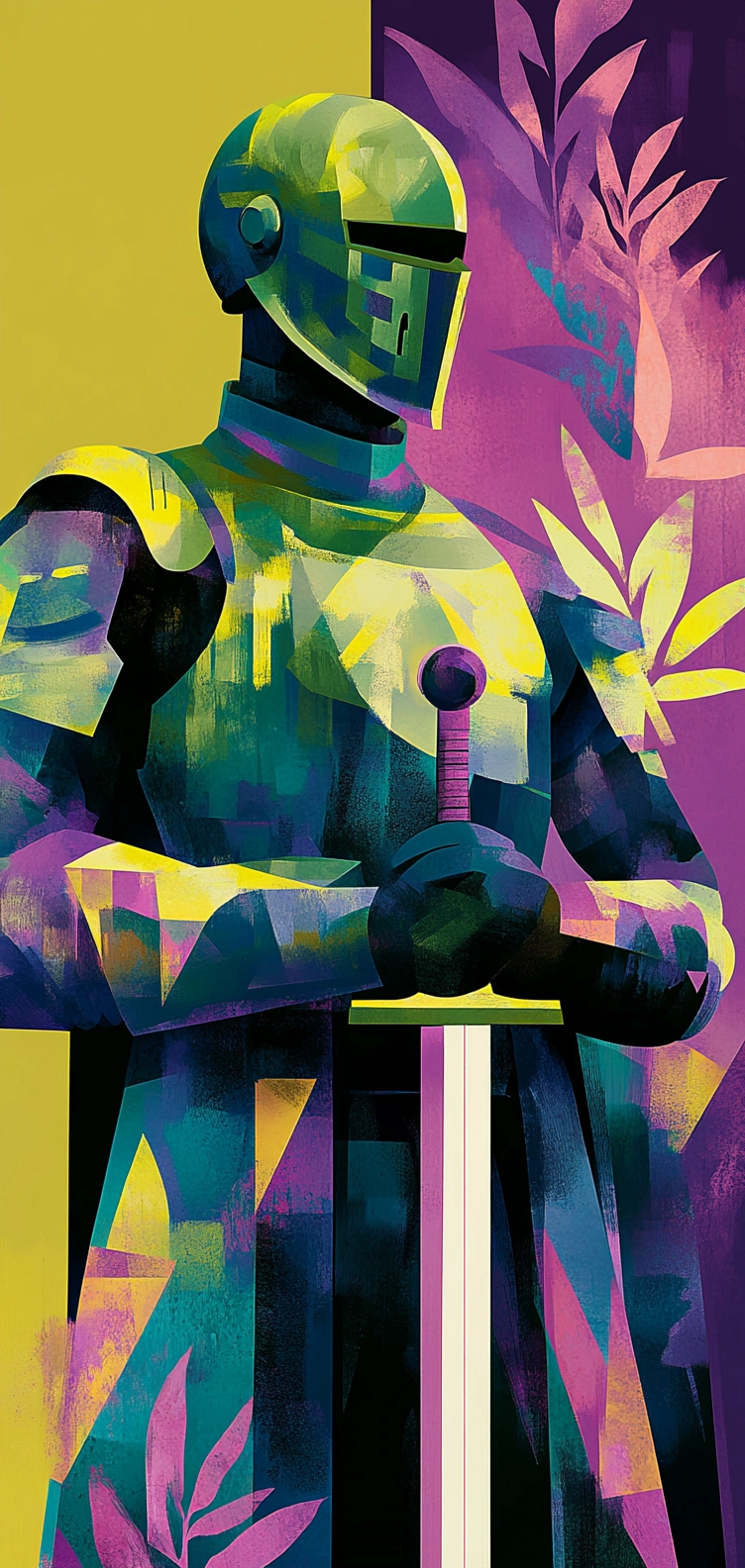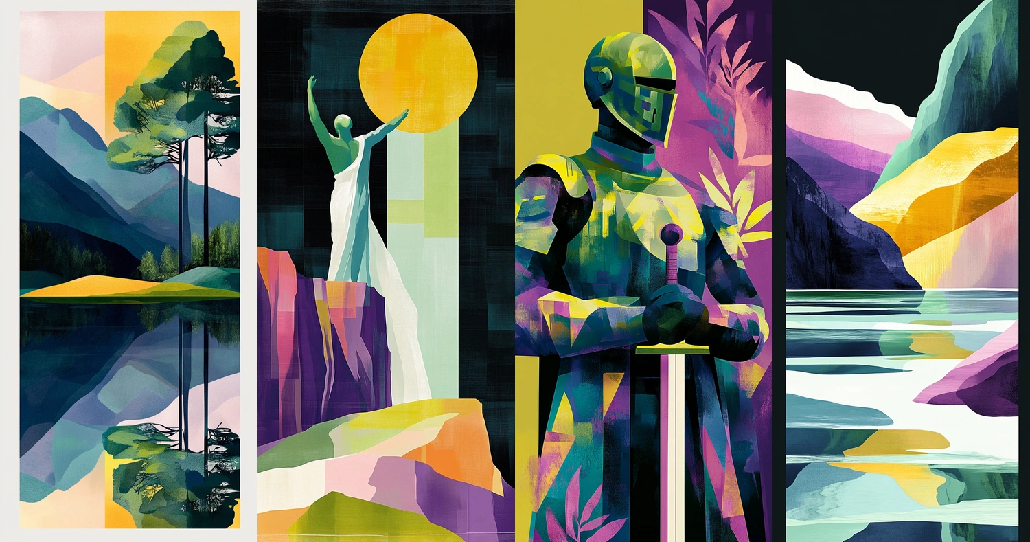 The lighting in this style accentuates sharp contrasts and vibrant hues, creating a dynamic illusion of depth. The combination of geometric shapes with bold, saturated colors enhances the visual texture and spatial ambiguity.