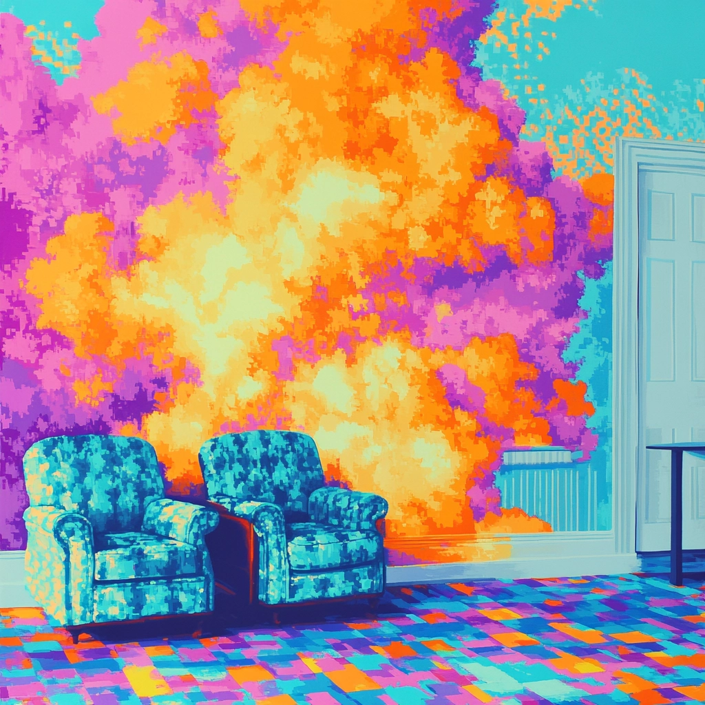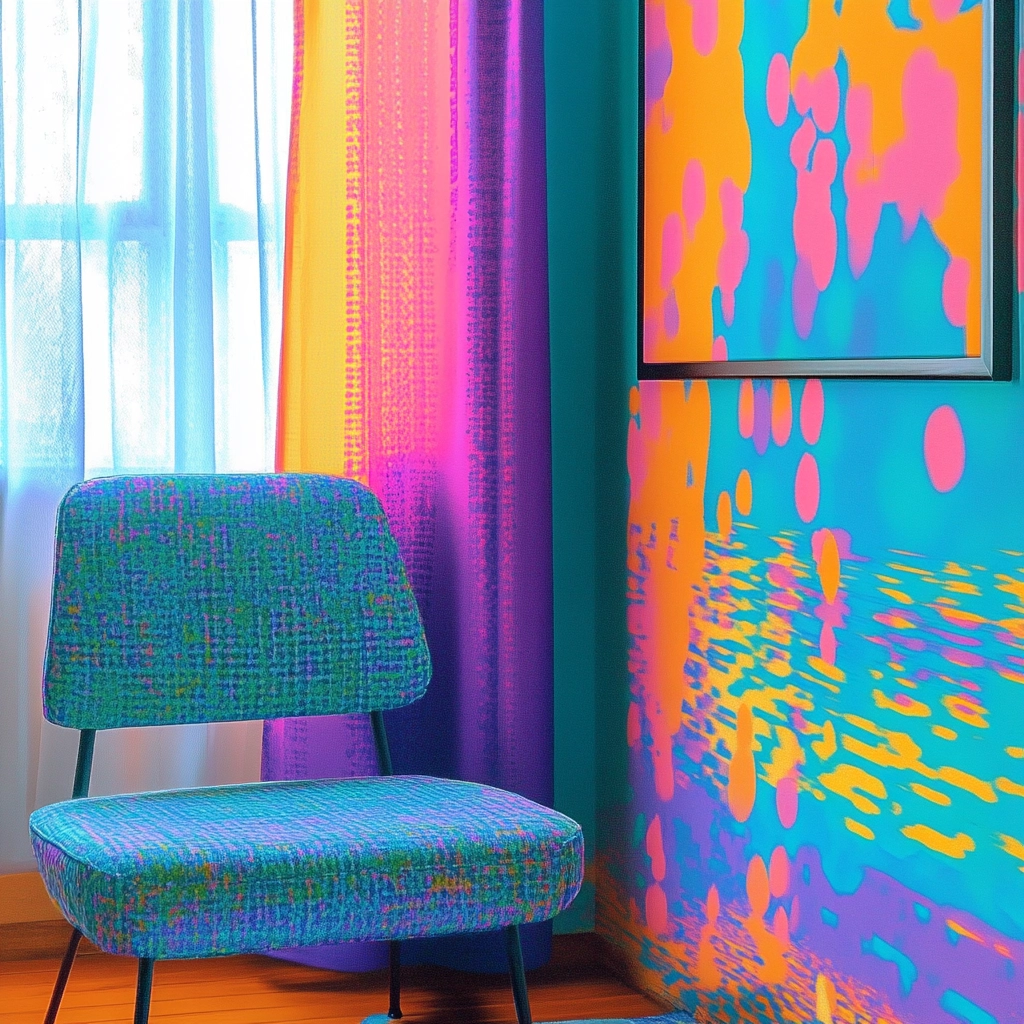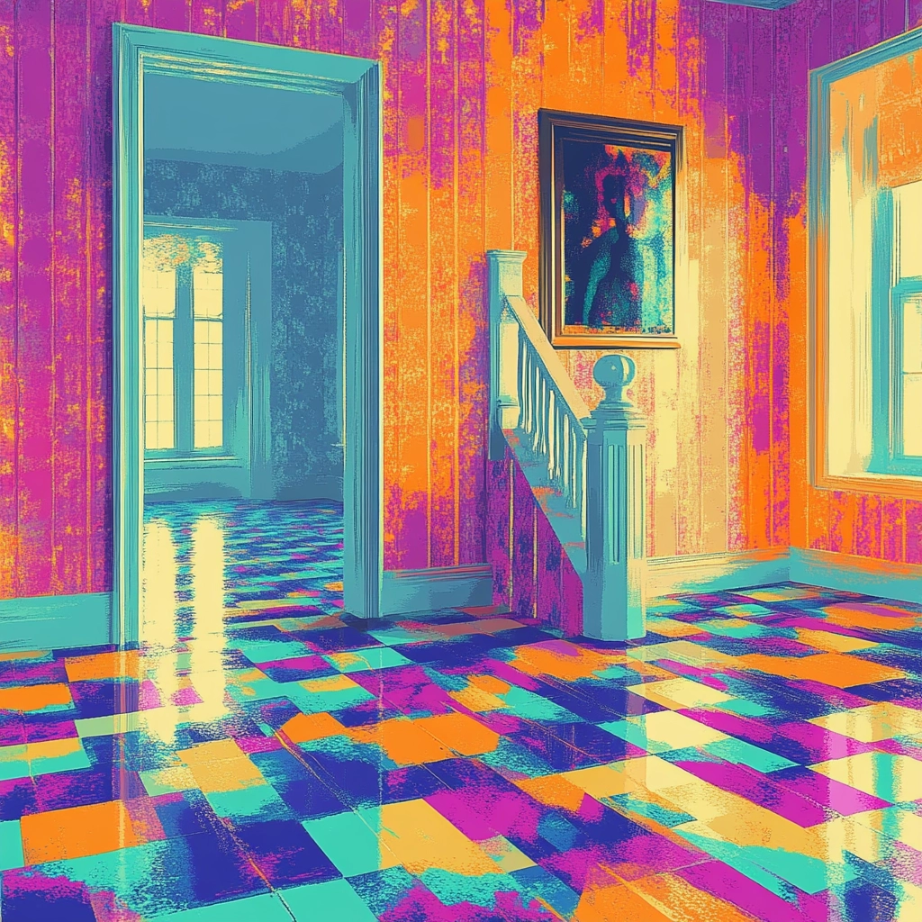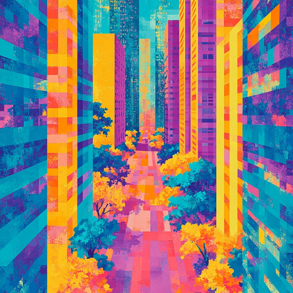 The composition juxtaposes vivid cyan, orange, and purple to create an engaging interplay of light and shadow. Geometric forms furnish the space with a surreal spatial expression while textured patterns convey depth.