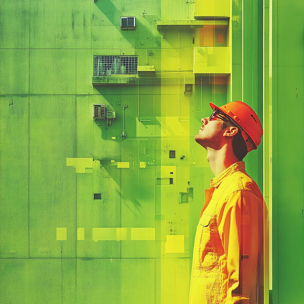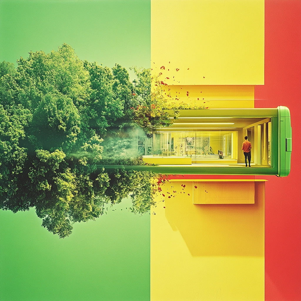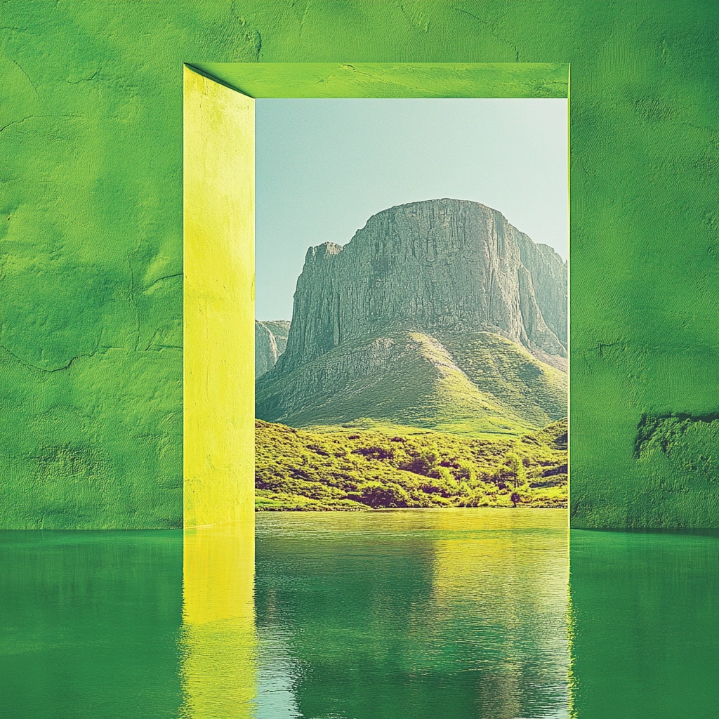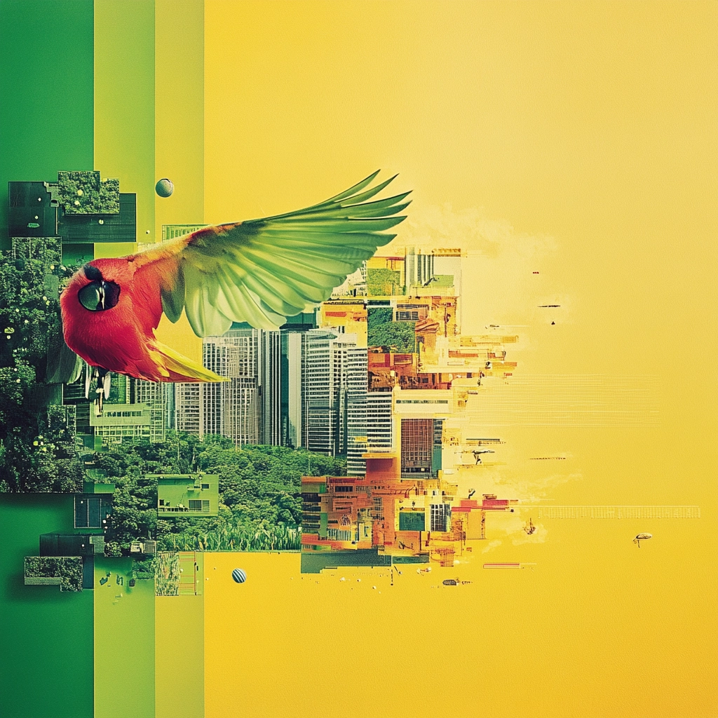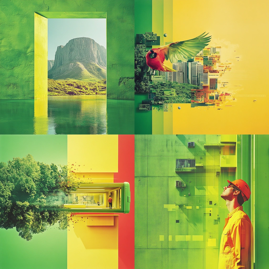 The artwork employs strong geometric shapes interlaced with vibrant natural and urban imagery, creating a layered spatial experience. Textures are crisp and lighting highlights intense color contrasts.