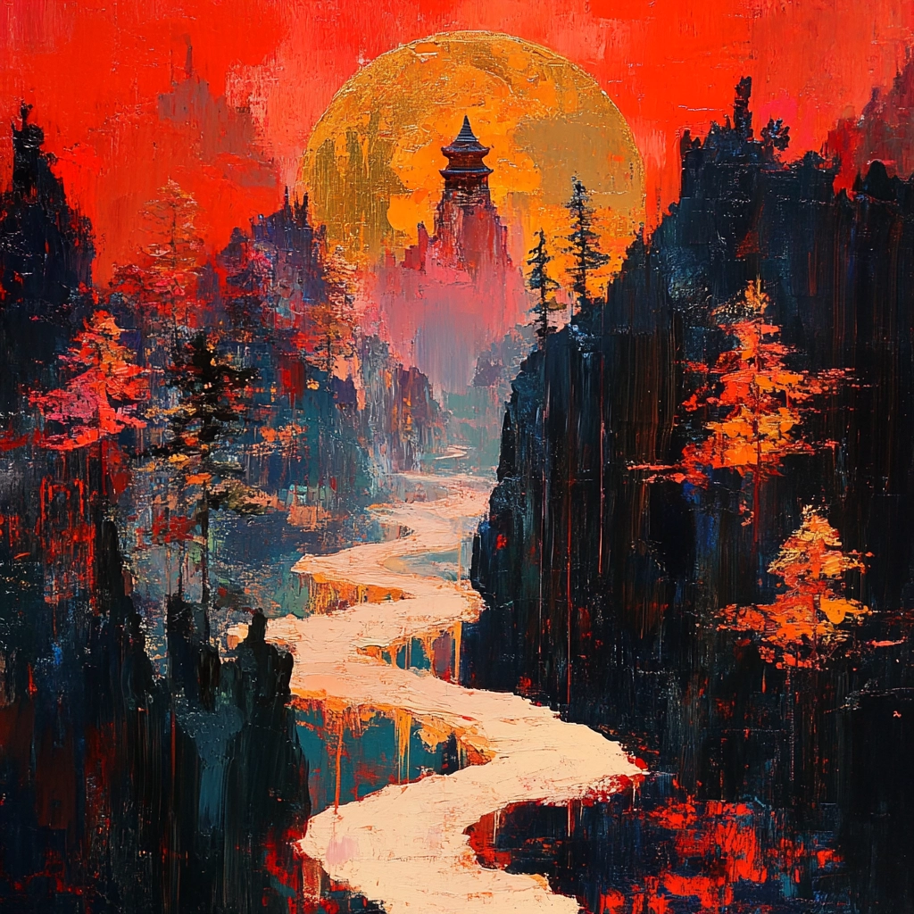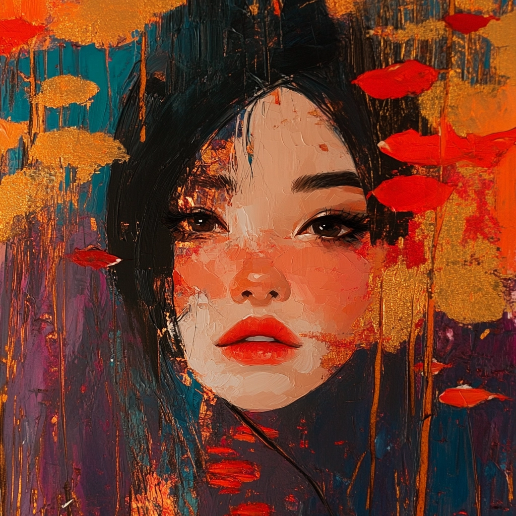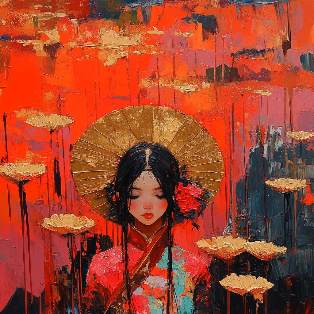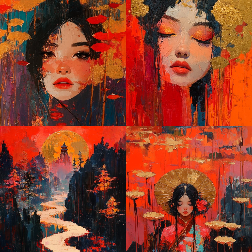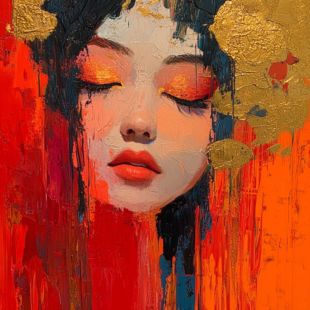 The use of vibrant and intense red hues creates a striking color palette, while the addition of gold leaf adds a textural richness. Shadowed elements provide depth, complementing the evenly distributed vividness across the canvas.