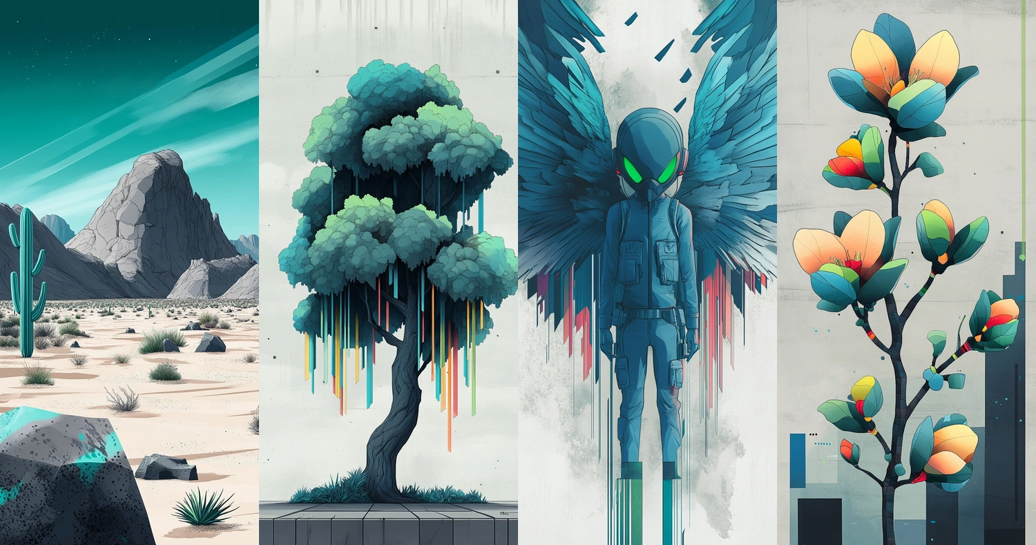 Utilizes bright gradients and shadows to enhance depth and form. Smooth textures contrast sharply with the vibrancy of colors, creating a distinct focus. The interplay of light and shadow defines spatial arrangements, contributing to an engaging visual experience.