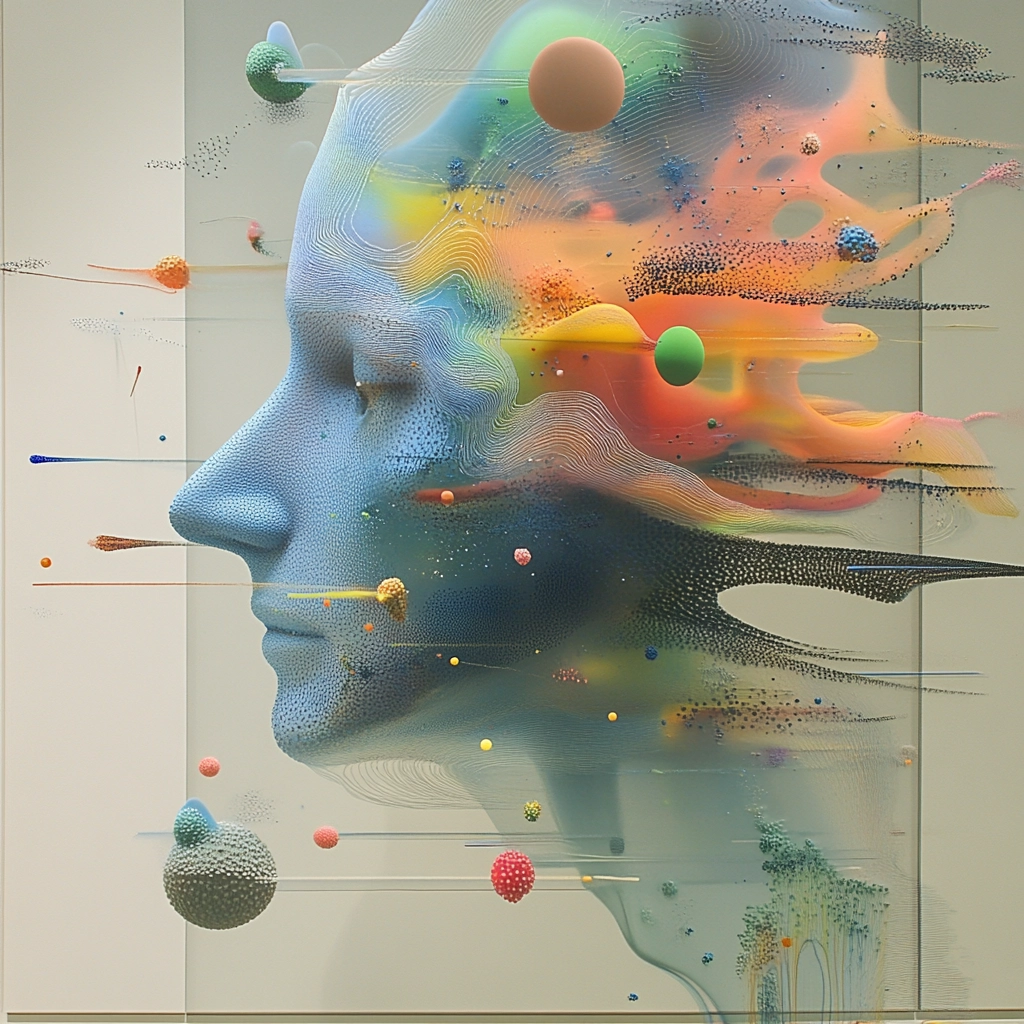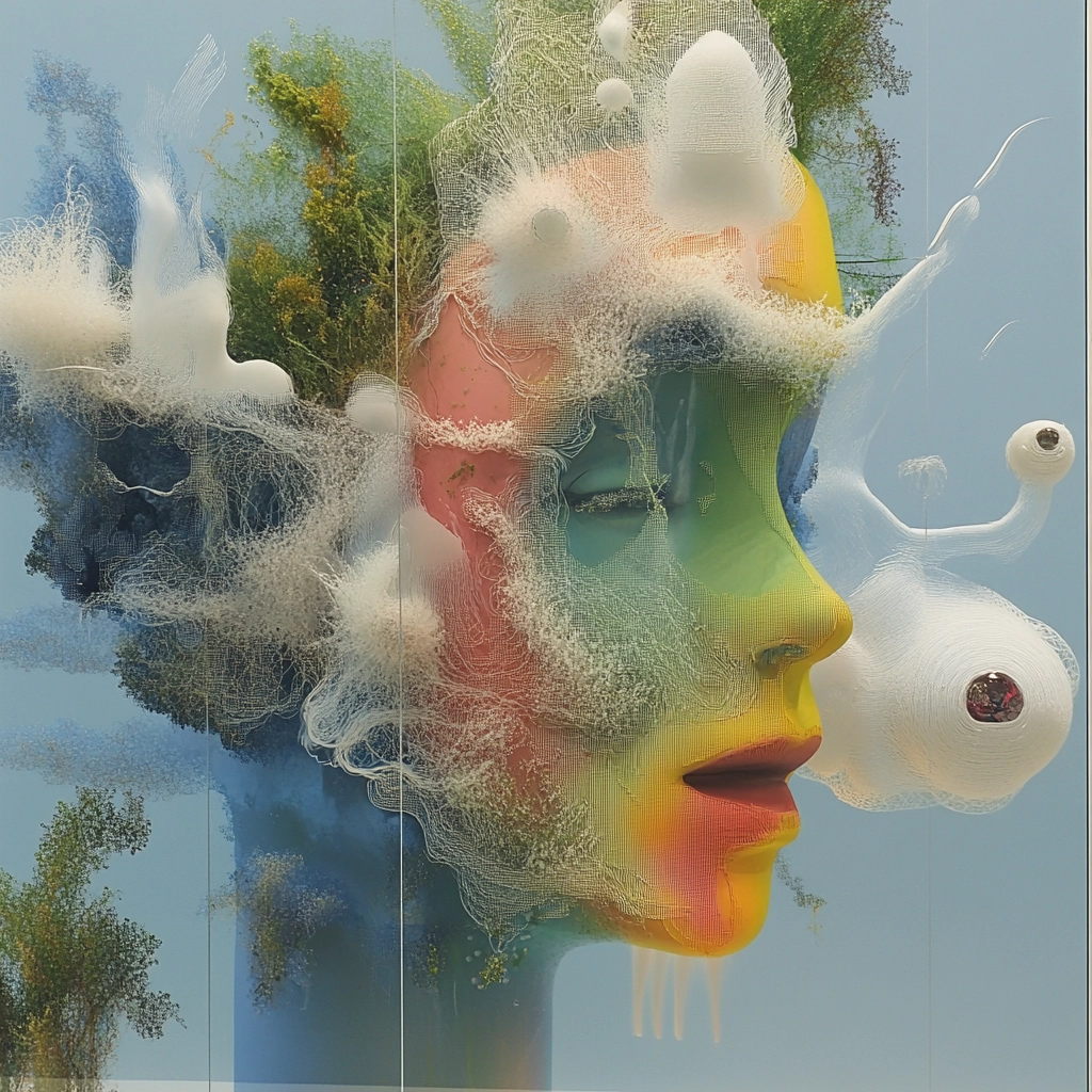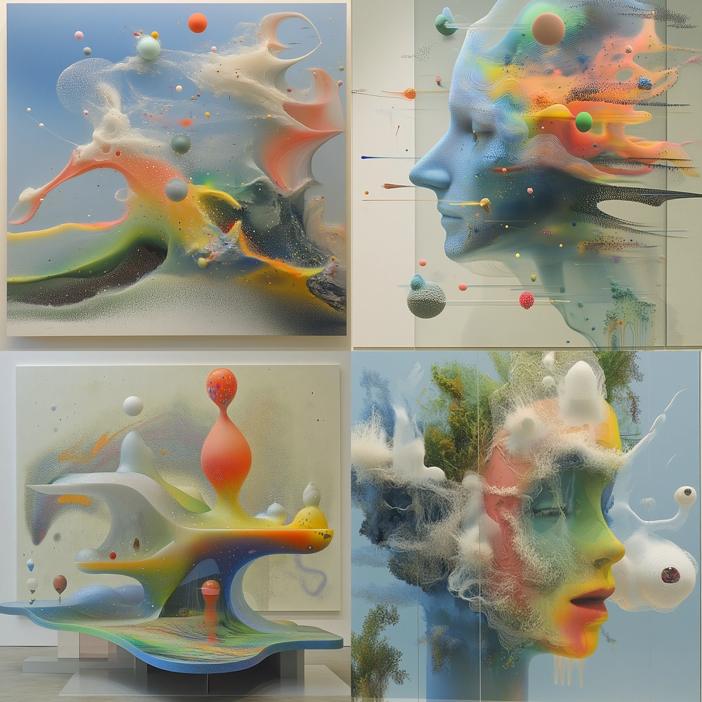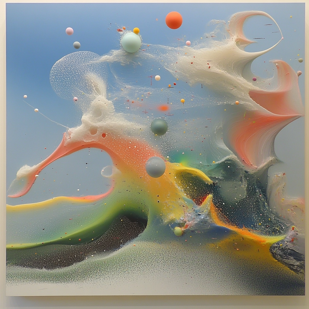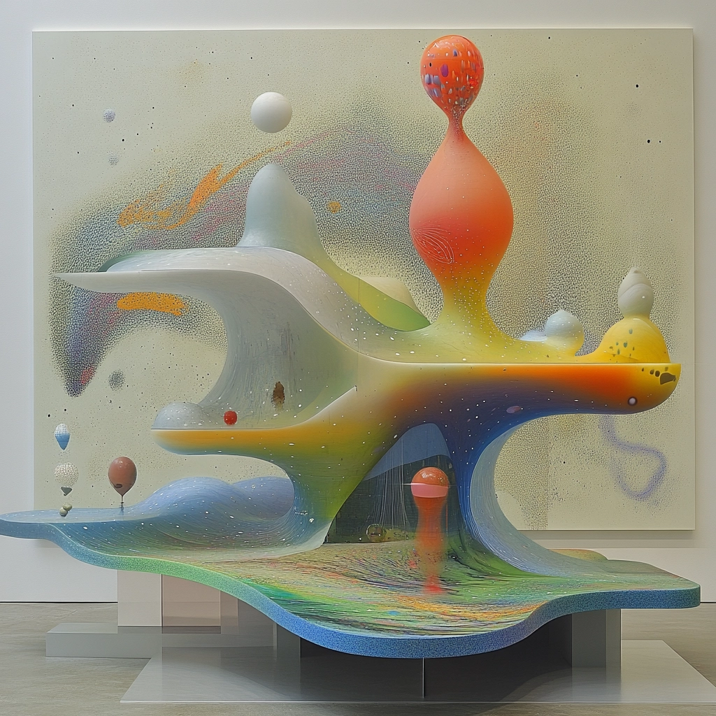 The use of vibrant, flowing hues combined with smooth textures creates a sense of depth and movement. Lighting highlights forms and details, drawing attention to transitions and contrasts between colors. The sense of space is enhanced by the interplay of shadow and light, offering a visual dynamism.