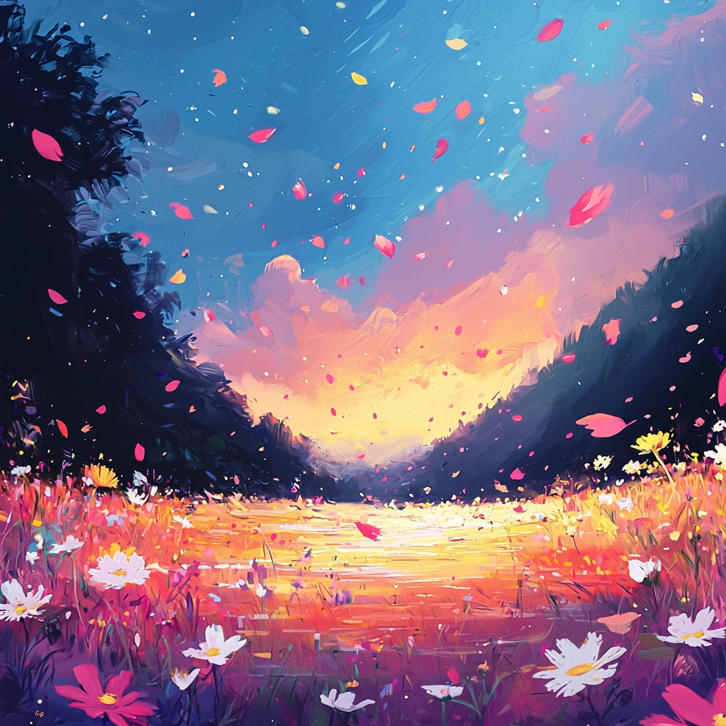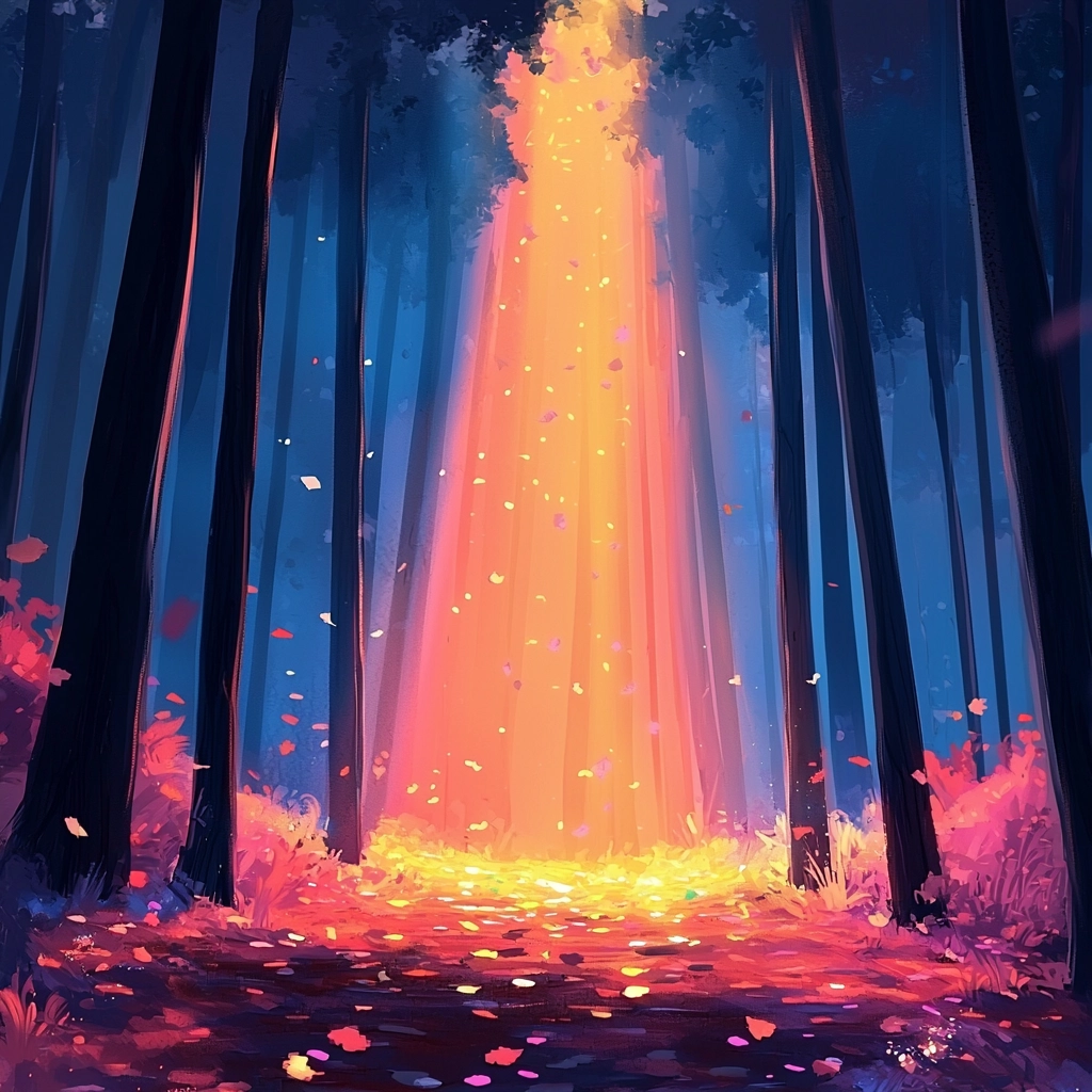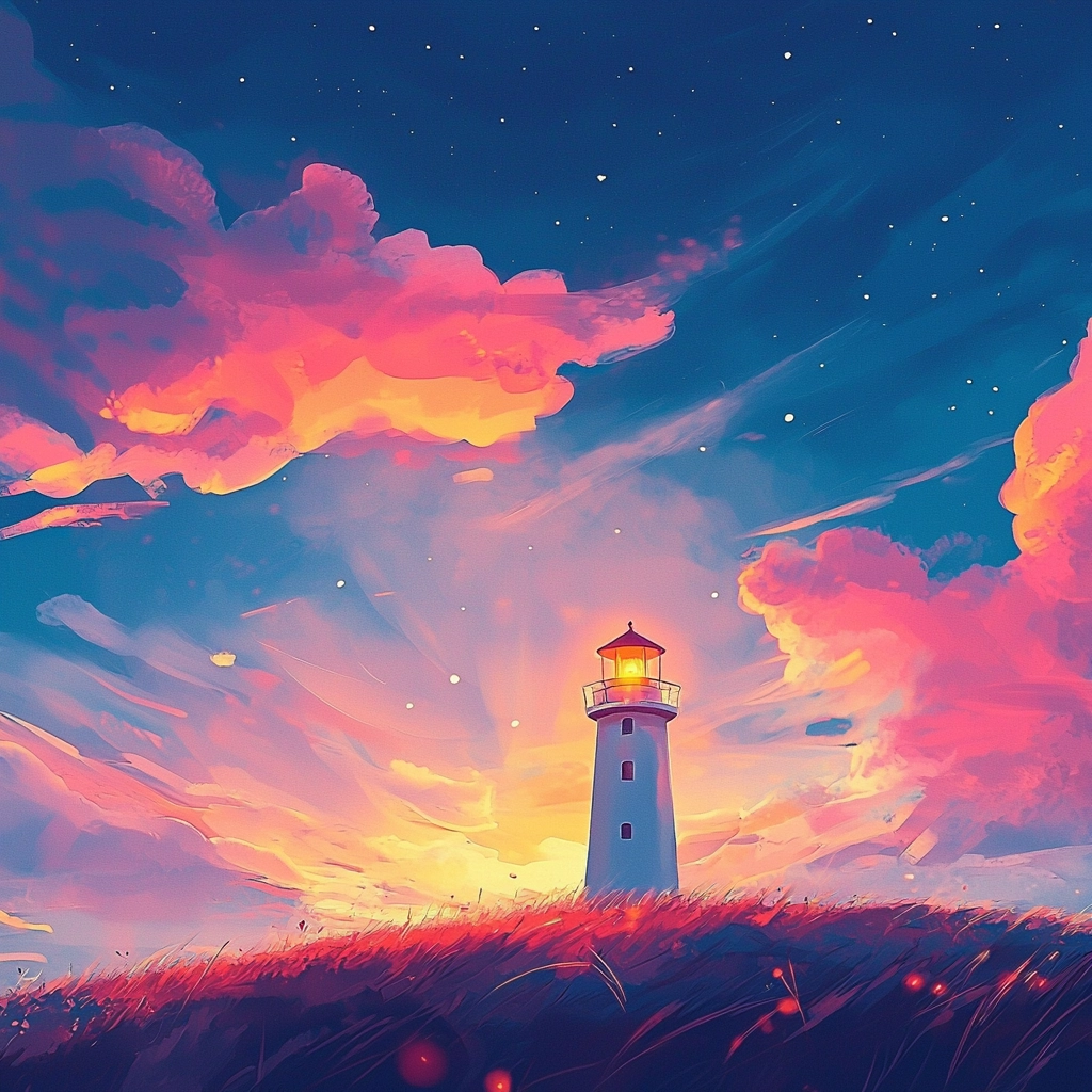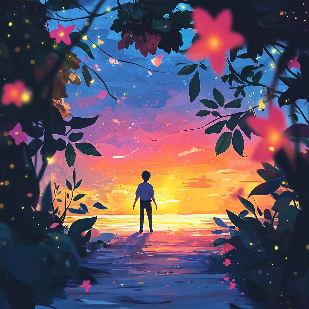 Dynamic use of bold and contrasting colors evokes vibrant twilight.