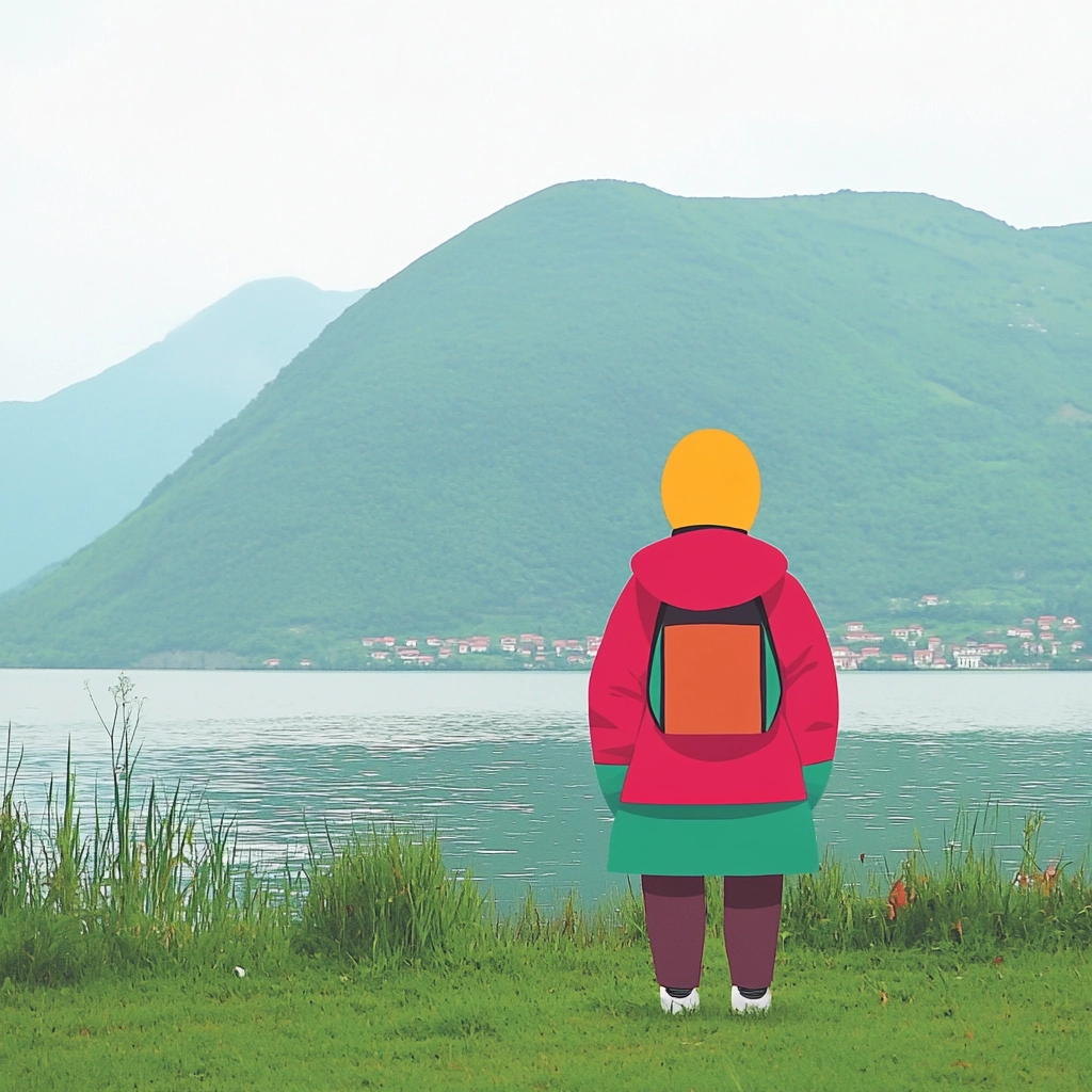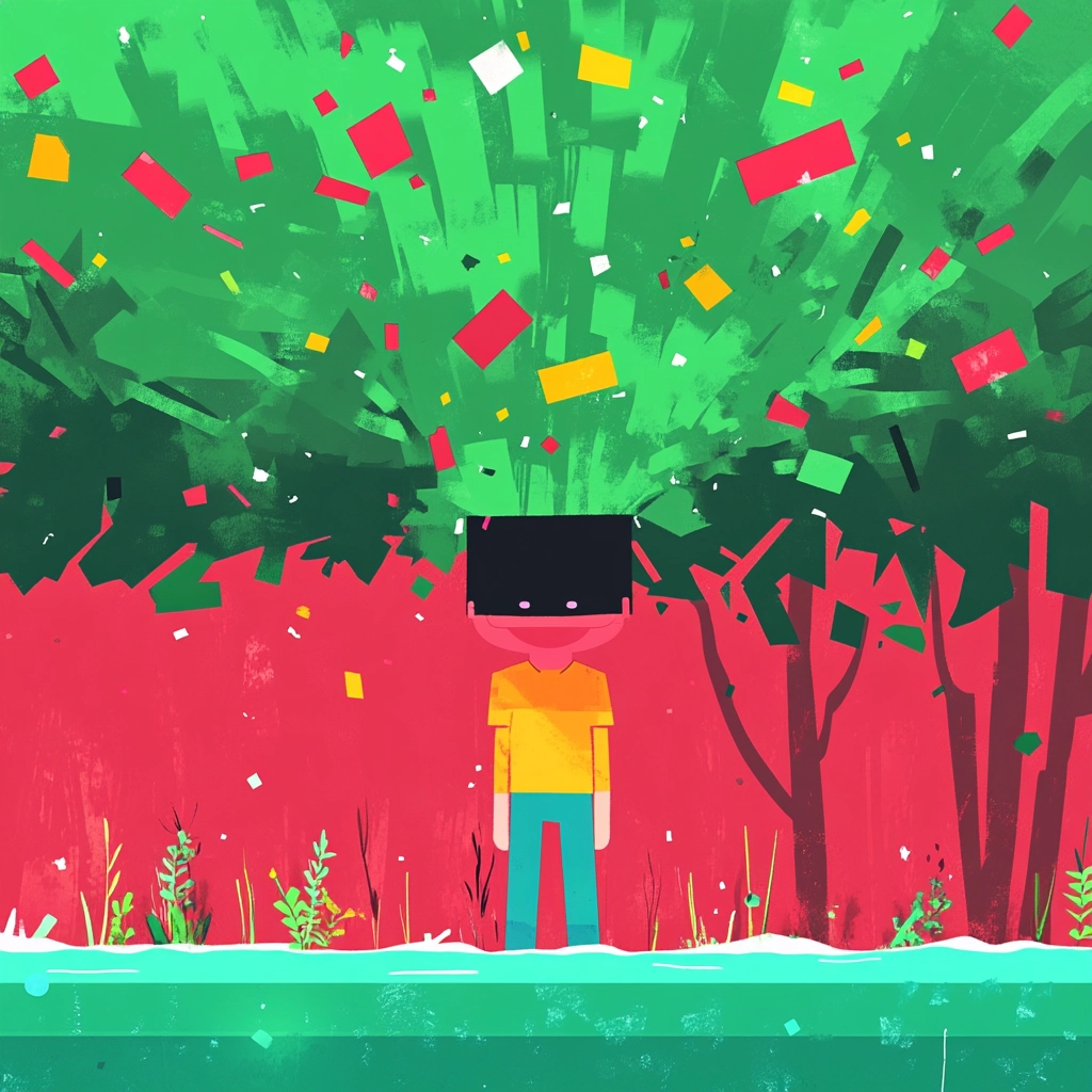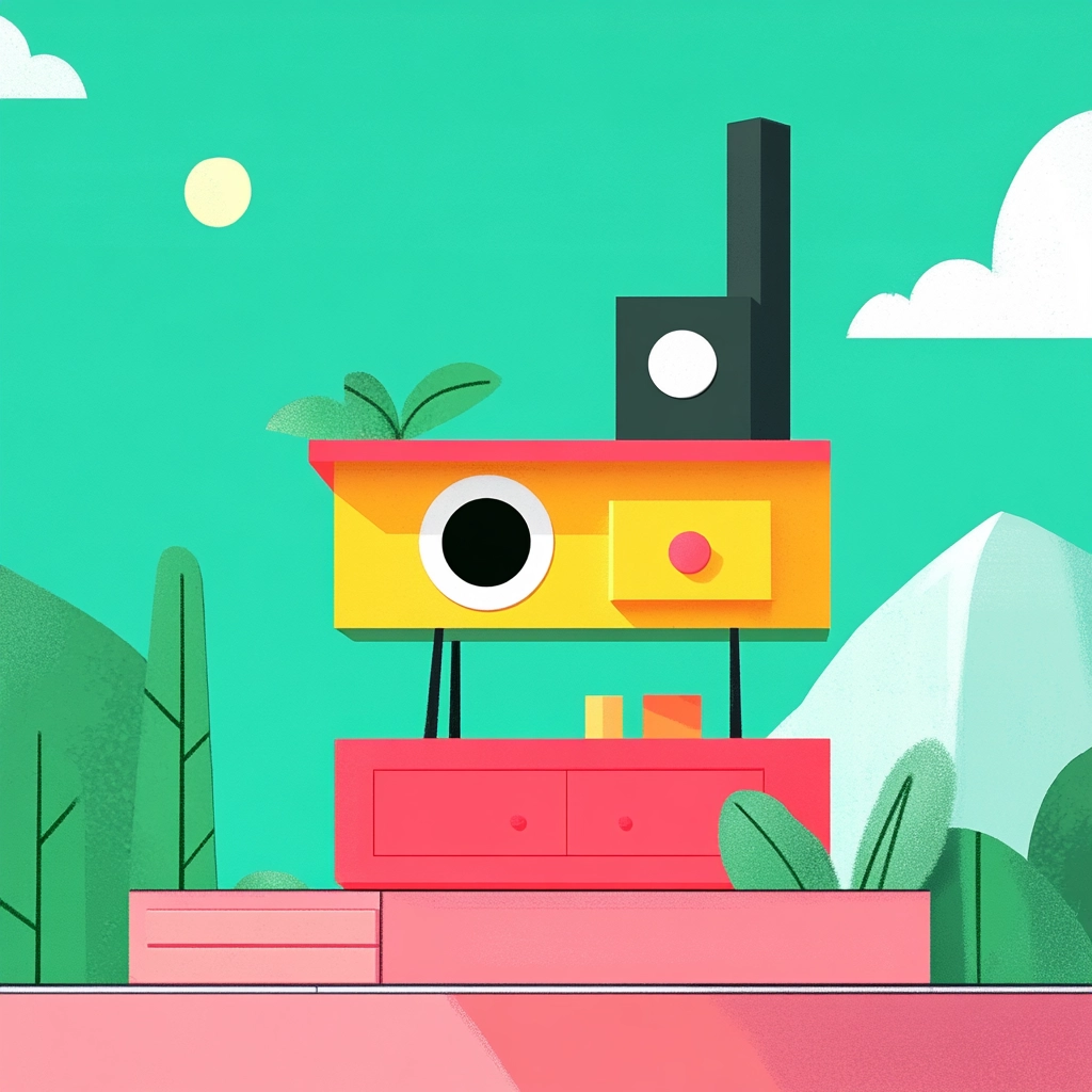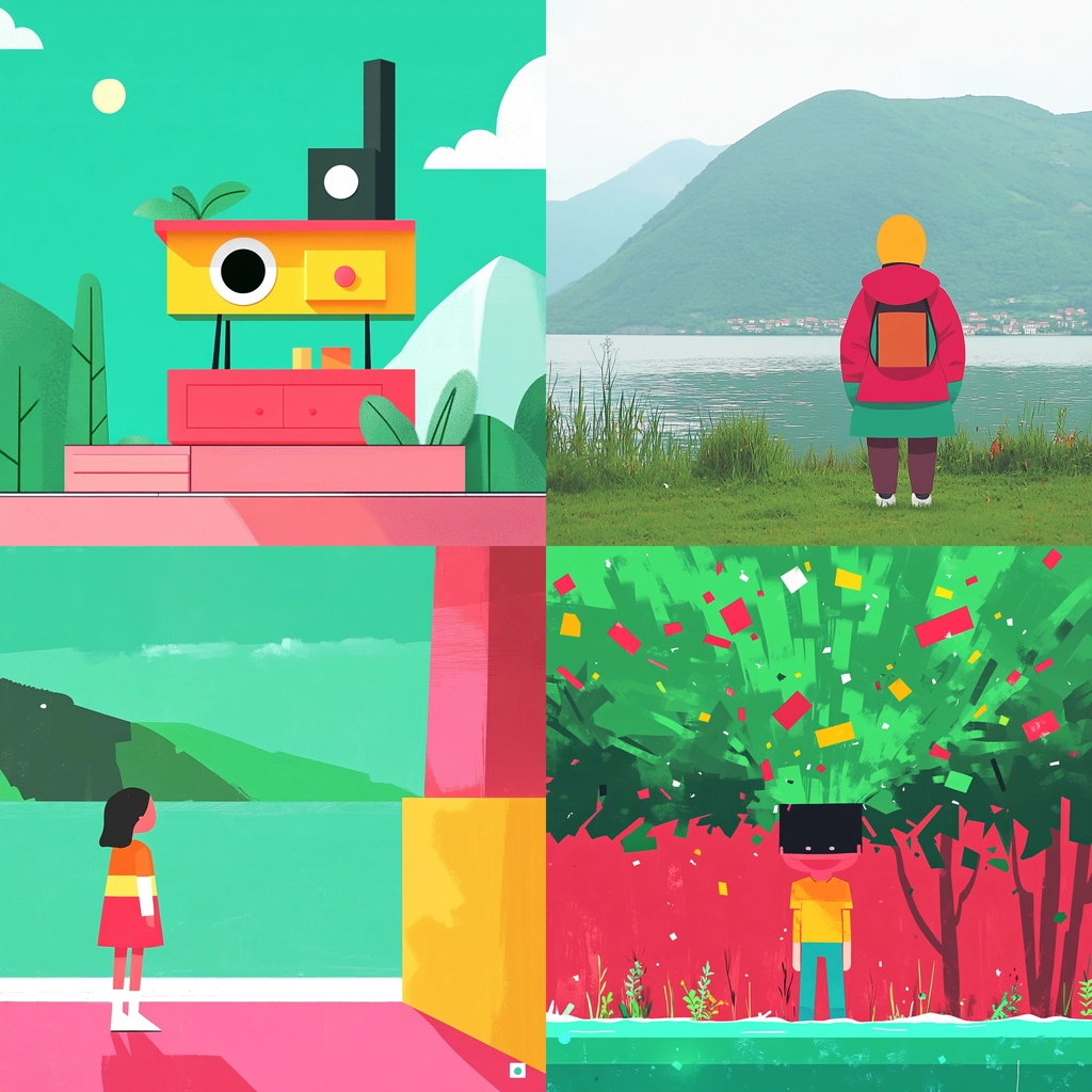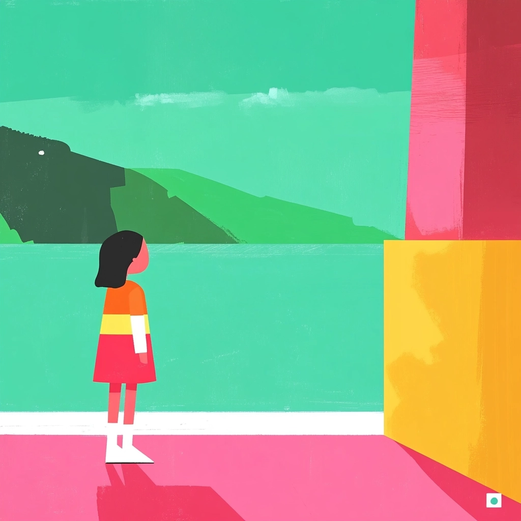 Bright lighting accents the high saturation of colors, enhancing a flat spatial arrangement that simplifies details. The smooth texture and bold blocks of color are visually distinct, creating a playful rhythm.