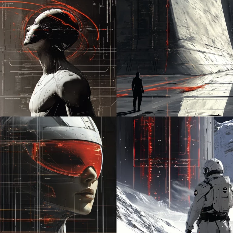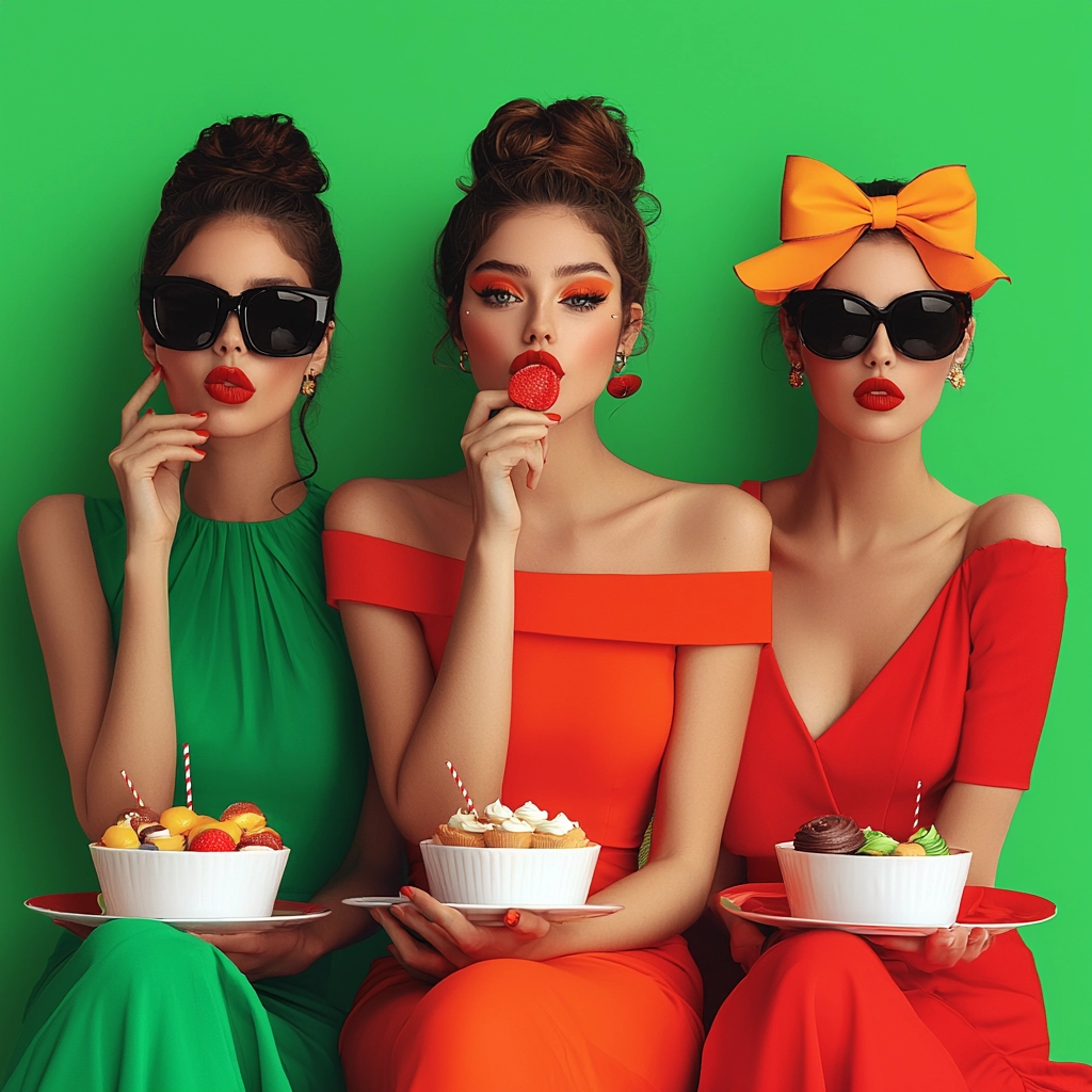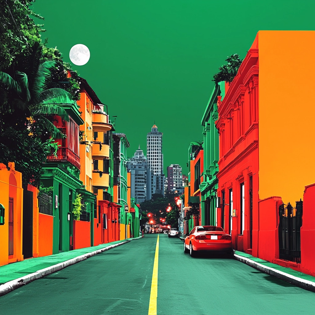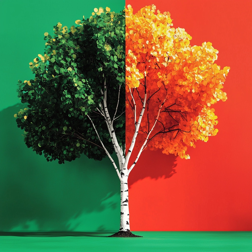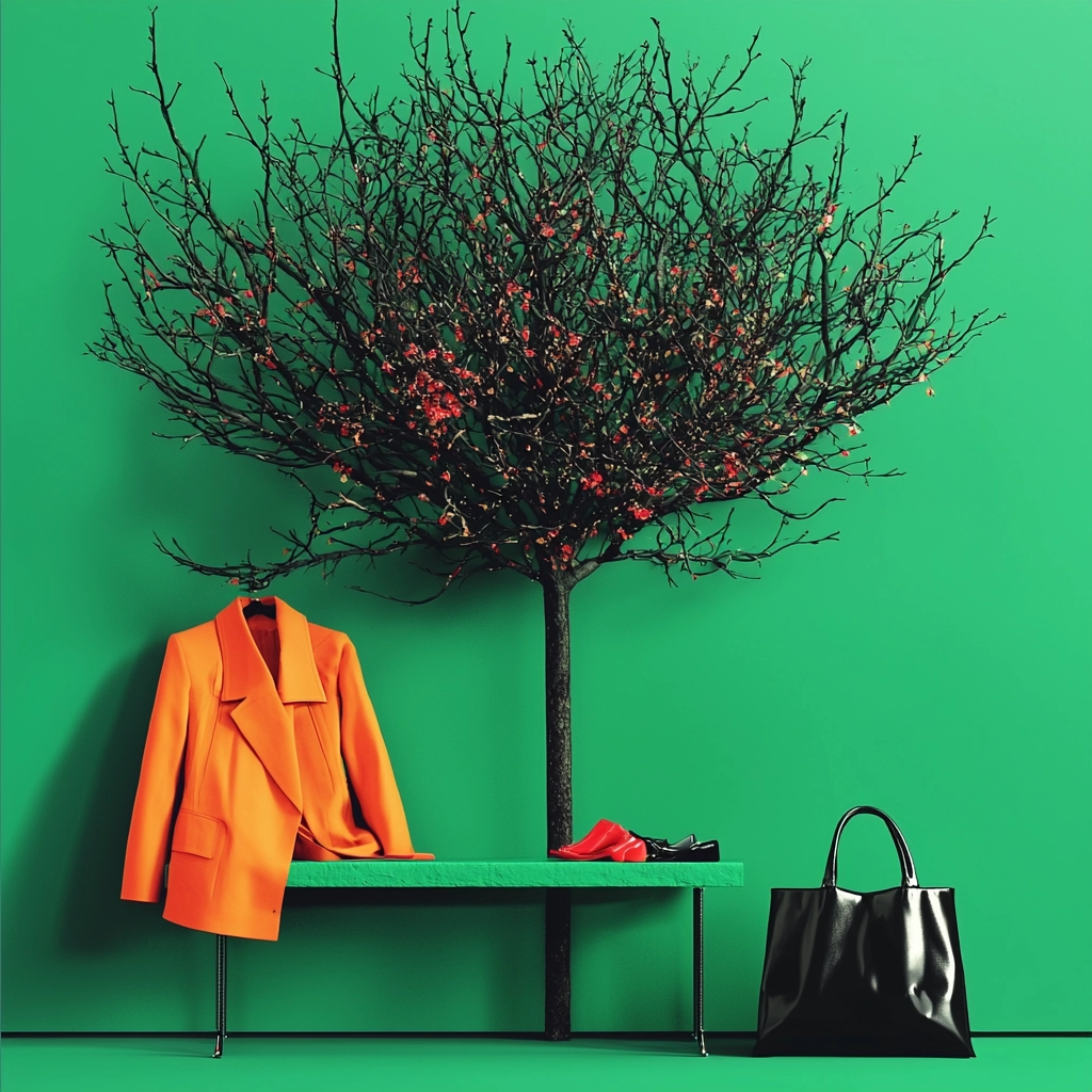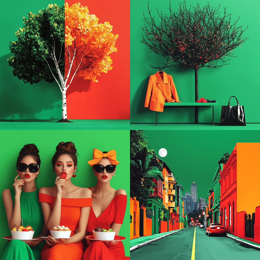 The lighting is vibrant and even, showcasing a marked contrast between the saturated greens and reds. The compositions employ a sense of spatial harmony, often juxtaposing natural textures with flat surfaces to highlight variance in depth perception.
