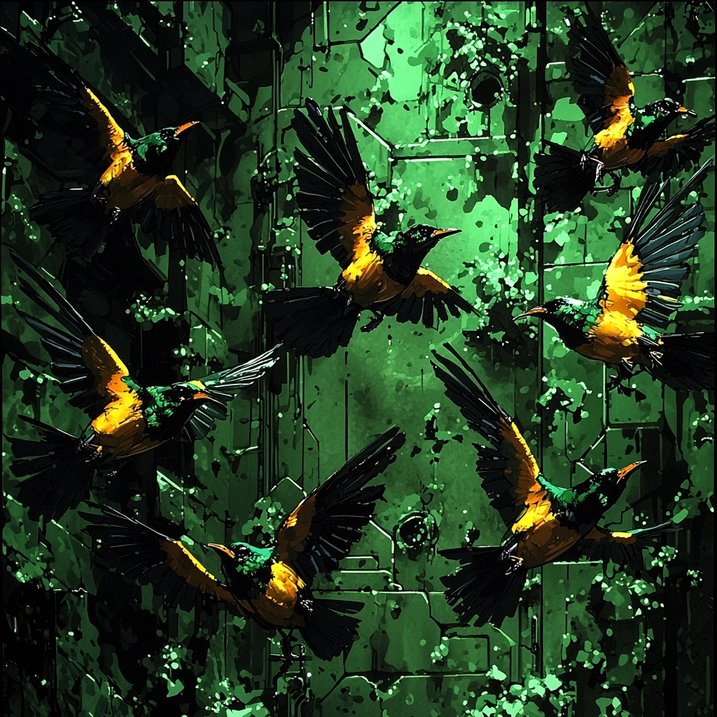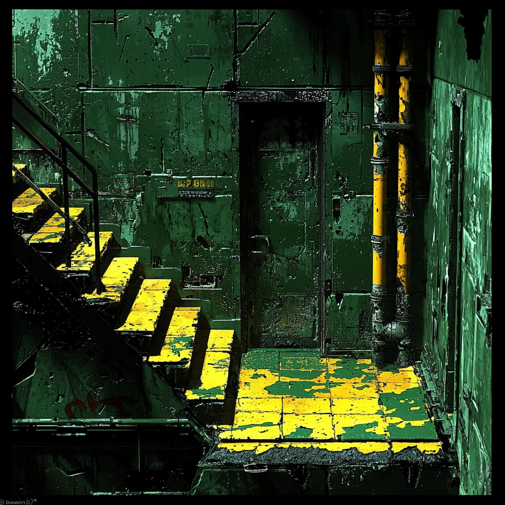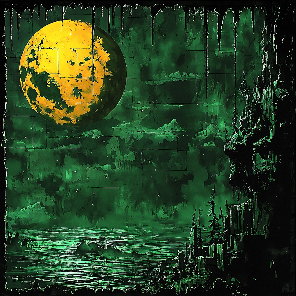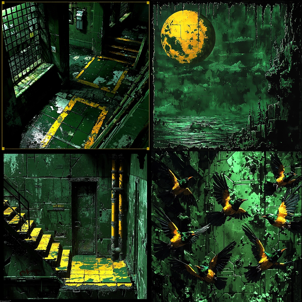 Rich green tones punctuated by striking yellow elements create a dynamic visual impact, utilizing stark contrasts and bold highlights for a captivating sensory experience.