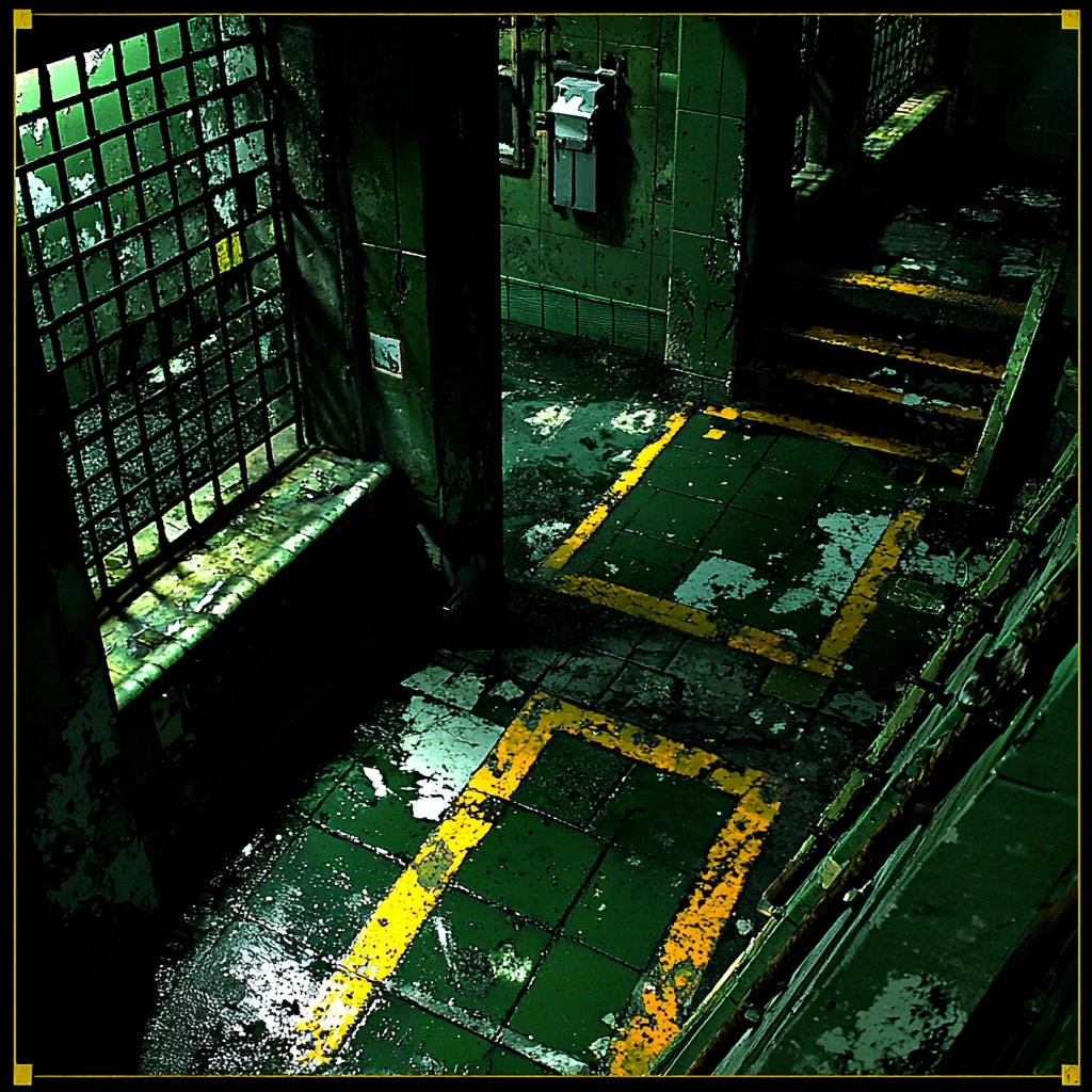 The interplay of deep shadows and intense highlights produces a dramatic light effect. Green dominates the palette, providing a textured, organic feel, while yellow introduces sharp visual dynamism. The composition relies on spatial tension, enhanced by the deliberate placement of contrasting colors.