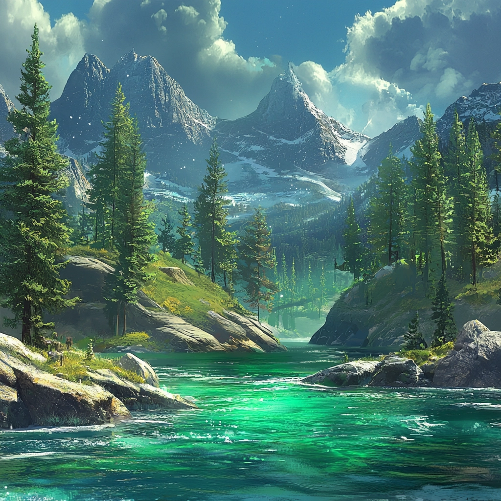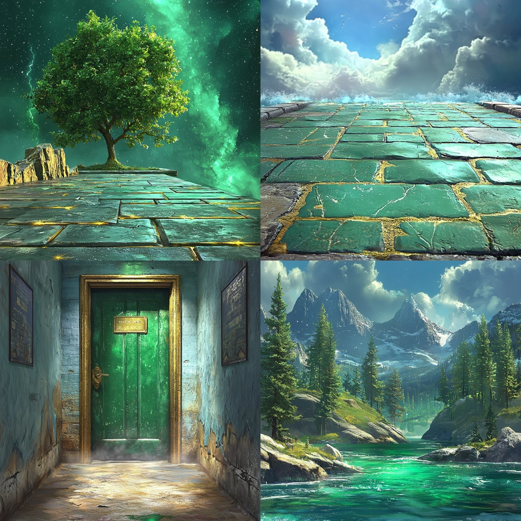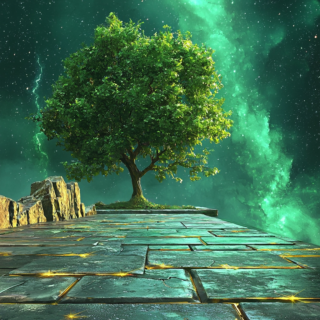 High contrast with glowing green and blue, featuring dynamic light that enhances depth and dimension. Textures are palpable and conspicuous, suggesting a tactile quality within the visuals.