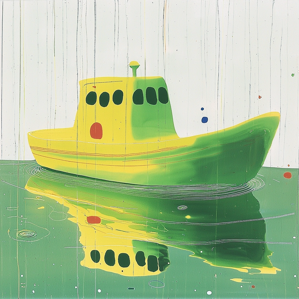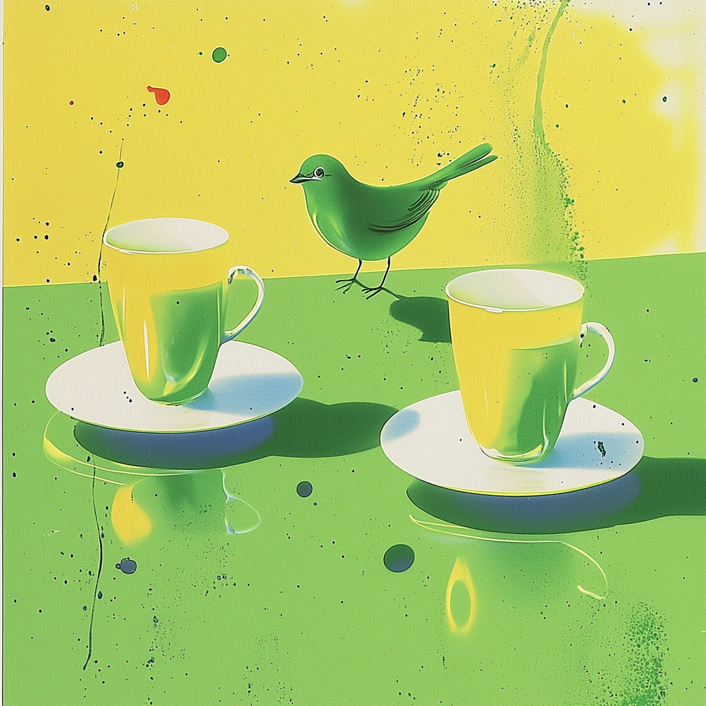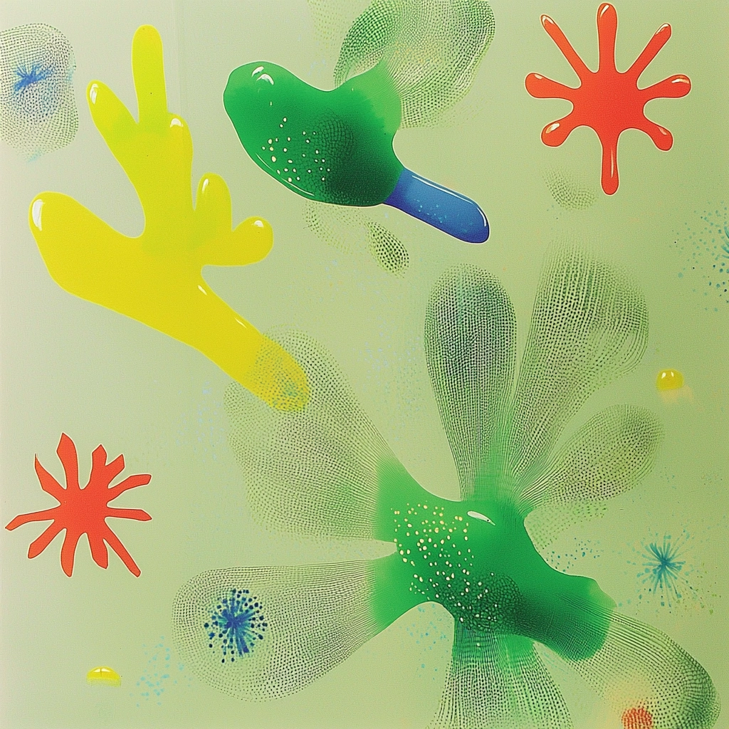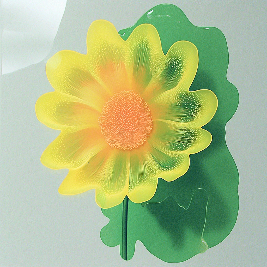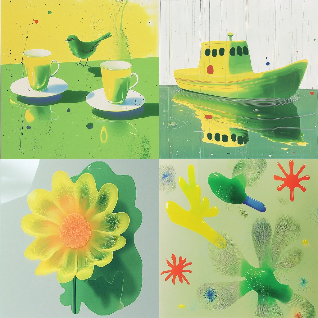 The artwork features a vivid interplay of green and yellow with a glossy texture that enhances reflectivity. Lighting effects emphasize high contrast, creating distinct separation of space with a modern pop aesthetic.