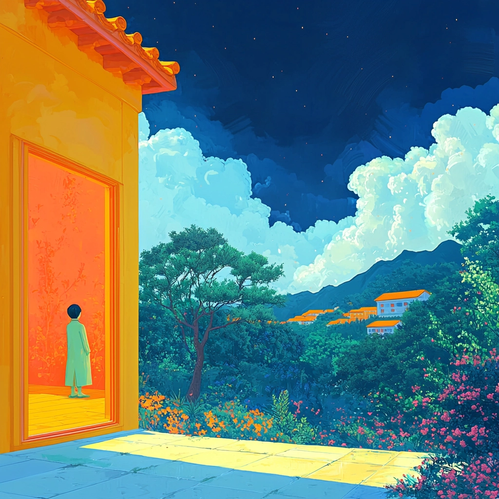 Illuminating contrasts highlight textures and spatial depth with harmonized hues. Lighting effects create a sense of dimension, emphasizing transitions between illuminated and shaded areas. Layers of color space seamlessly integrate, enhancing depth perception.