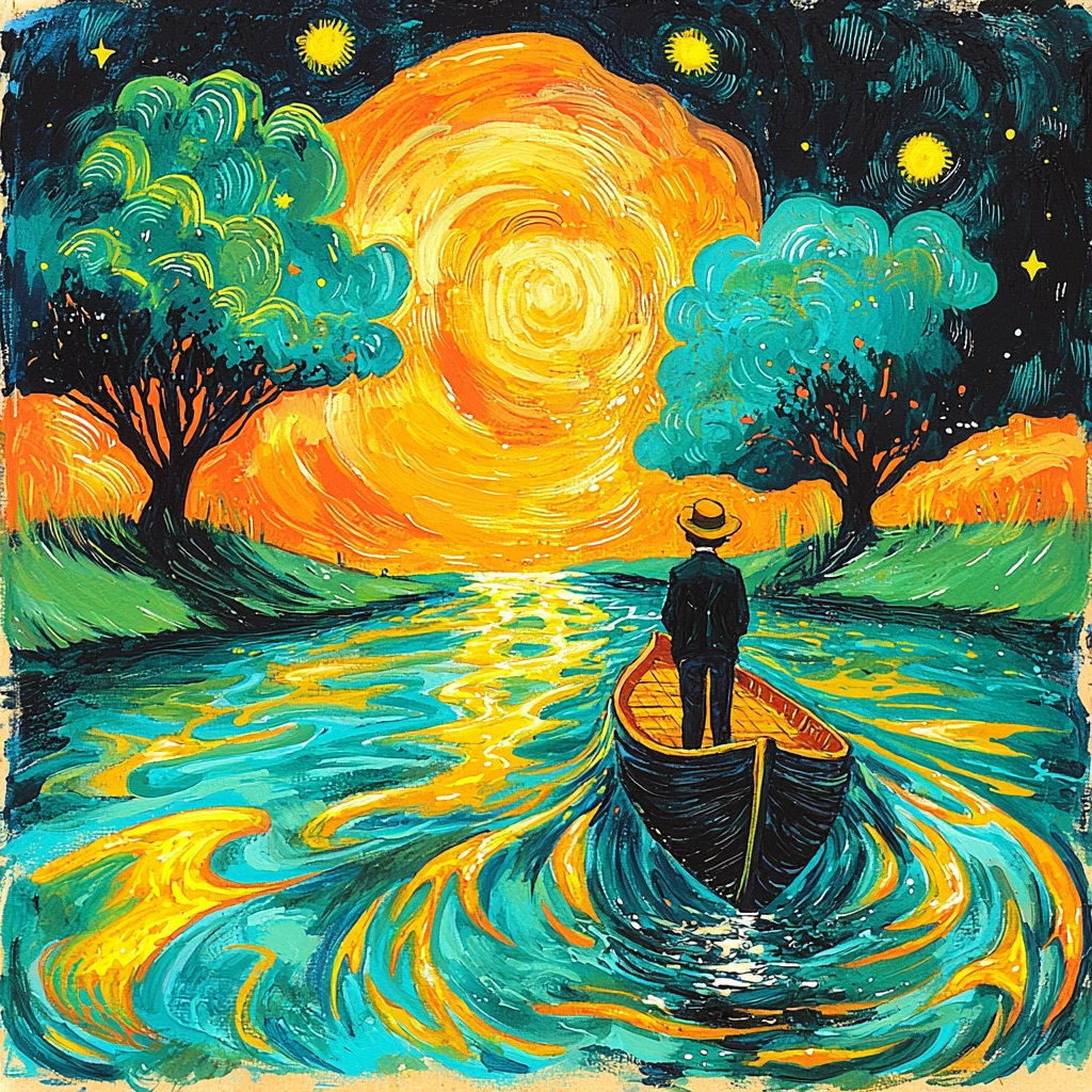 The lighting appears intense, casting vivid highlights and shadows against heavily textured surfaces. Colors are applied with high saturation, enhancing the spatial dynamics and creating a vibrant depth. The brushwork suggests energetic movement, emphasizing dynamic visual flow.