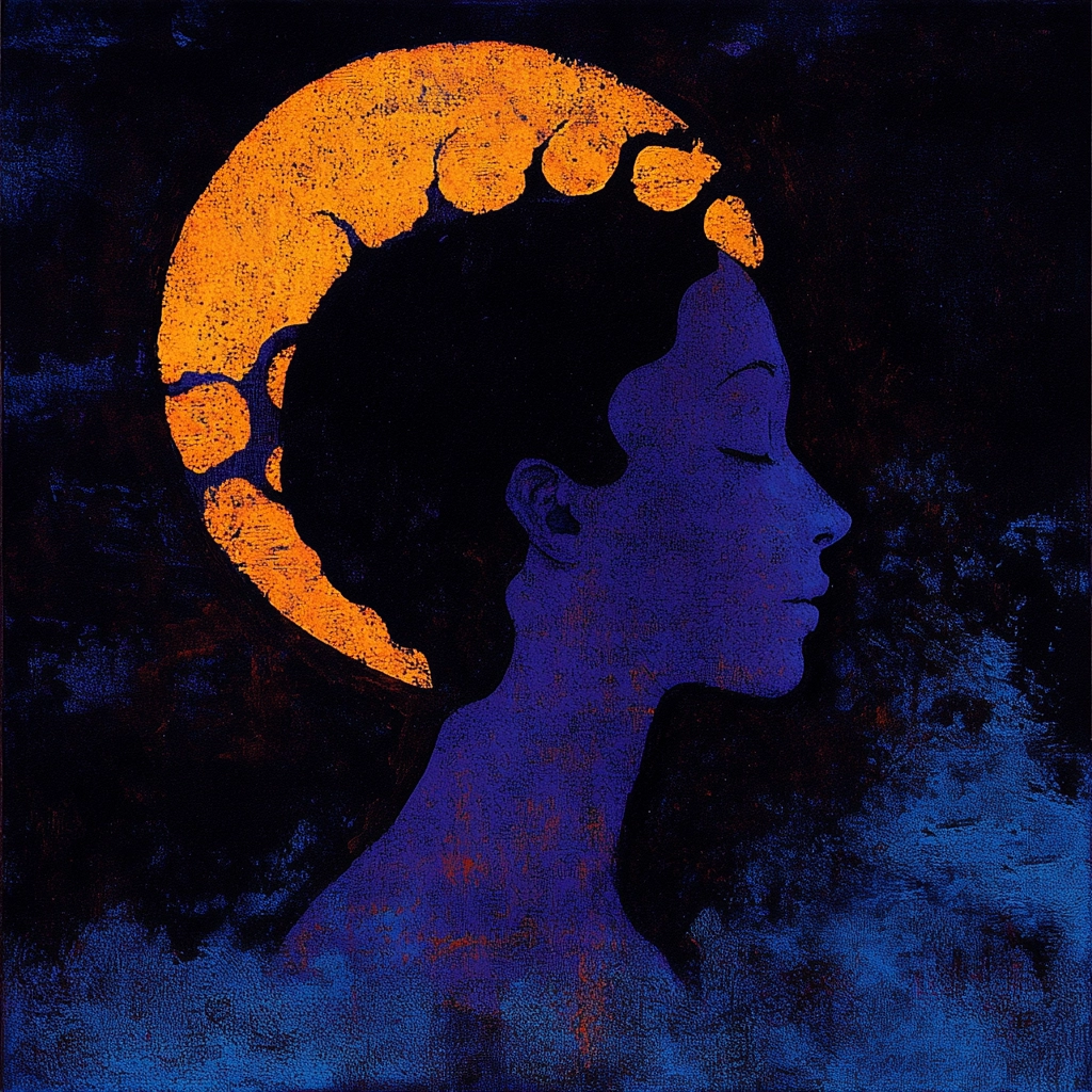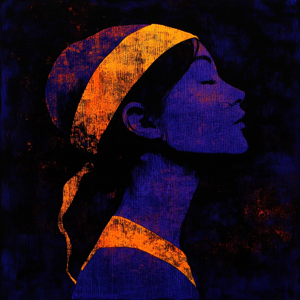 The composition features bold indigo backgrounds contrasted with bright orange highlights, creating a dynamic interplay of colors.
