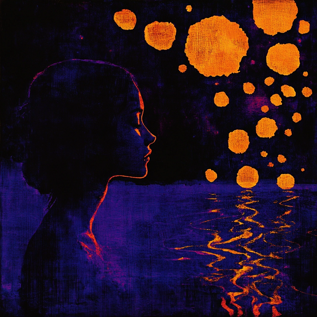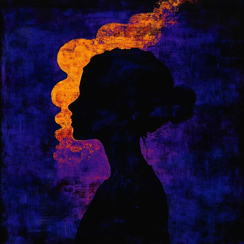 Strong lighting effects highlight the bright orange areas against deep indigo backgrounds, creating a striking color contrast. The texture appears smooth but has a subtle layered feel, adding depth to the spatial perception.