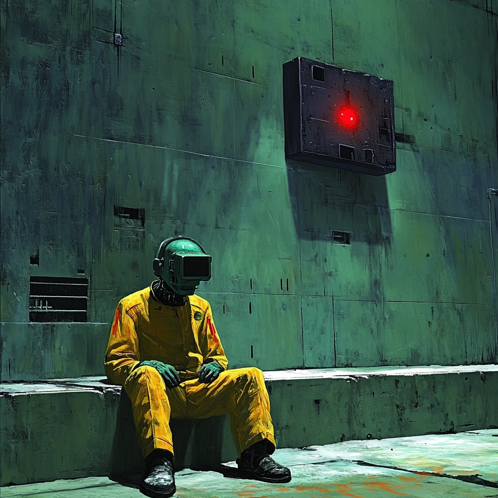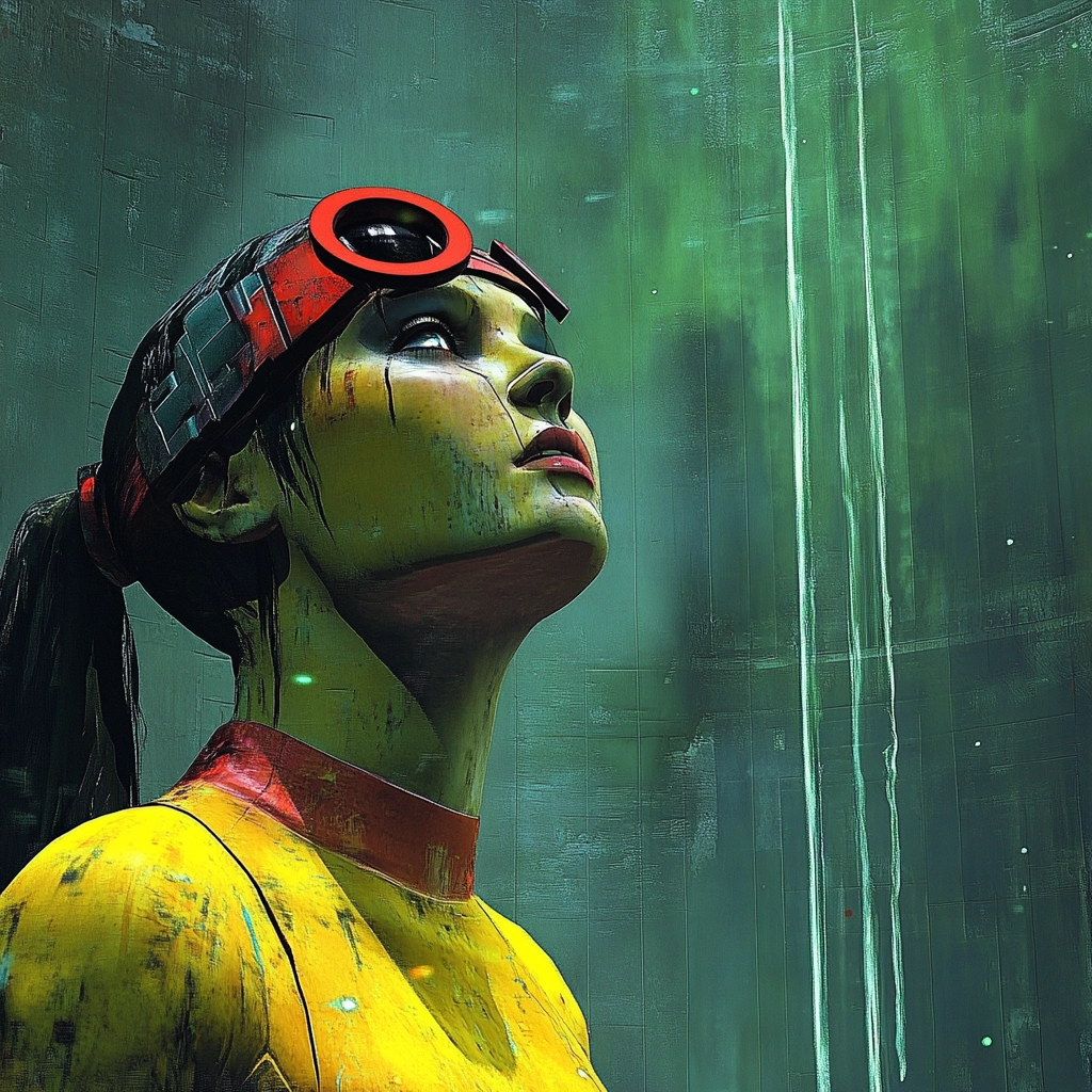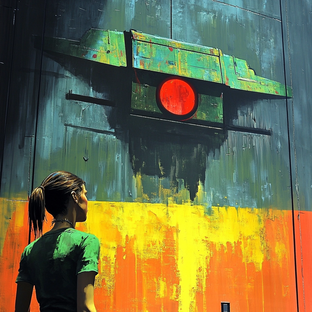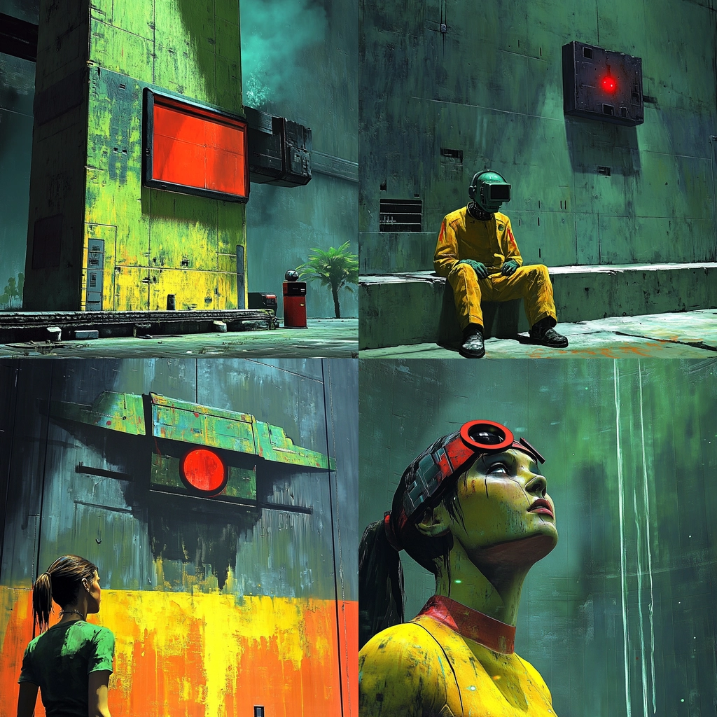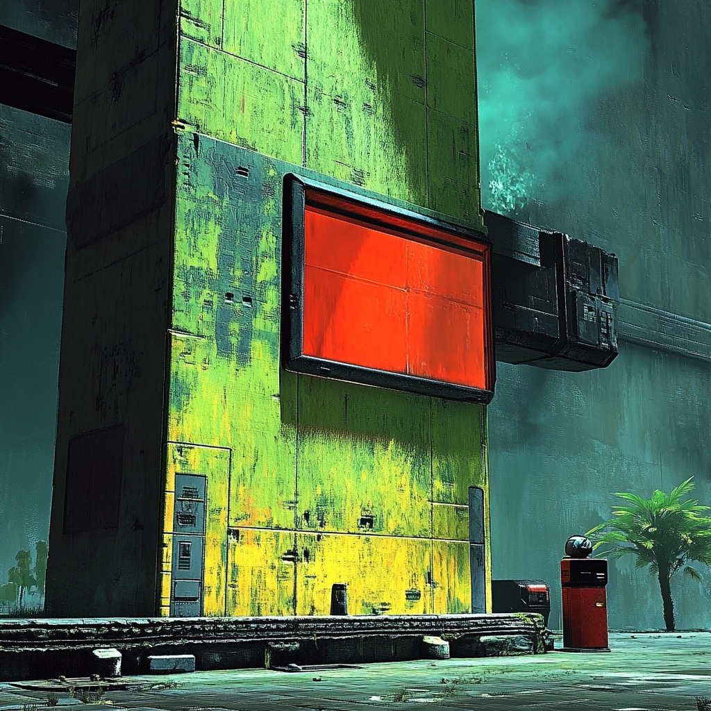 Dramatic lighting highlights the vivid colors, creating a high visual impact. The use of red accents against green and yellow backgrounds draws the eye, enhancing the sharp contrasts. The textural details and the rigidity of forms create a strong sense of space and structure.