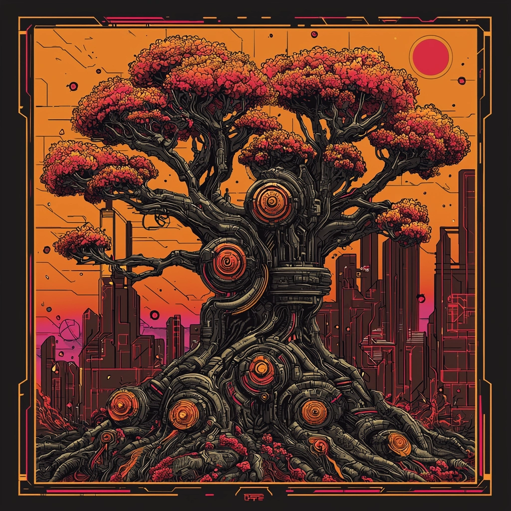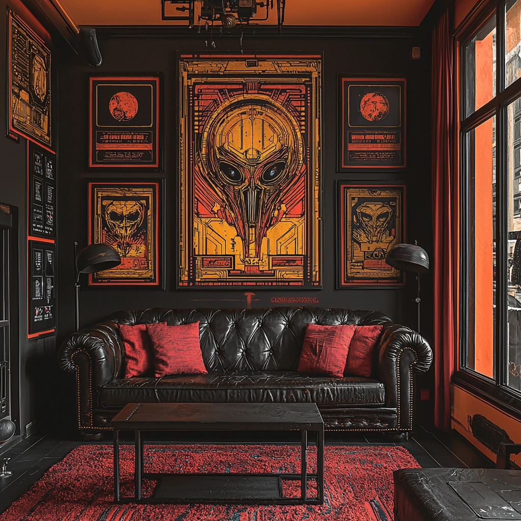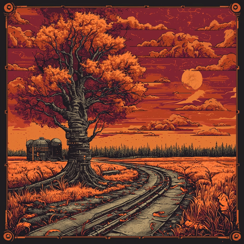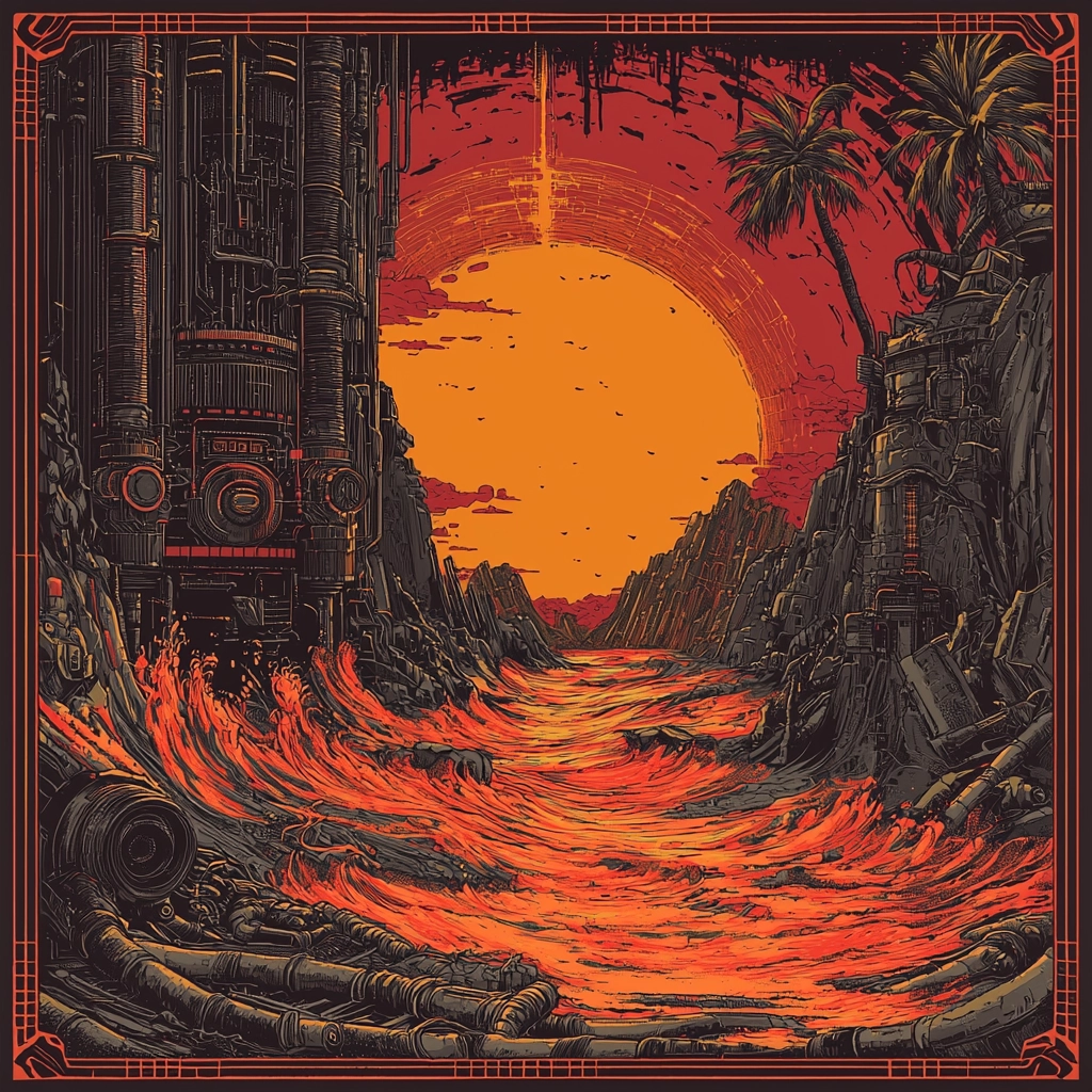 The lighting highlights a rich orangish glow, enhancing structural shadows and vivid reds. The spatial configuration draws the eye across the frame, complemented by textured layering and bold outlines.