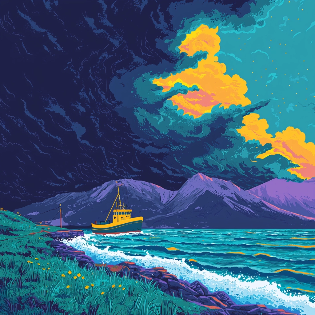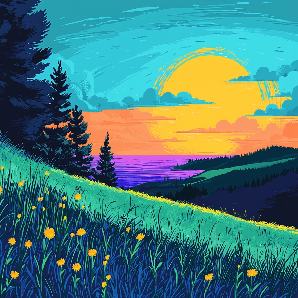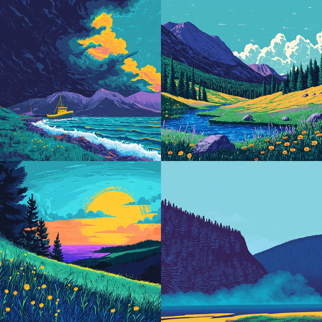 Strong lighting delineates features, creating a stark juxtaposition between light and shadow. The use of vibrant, saturated colors accentuates the dynamism of the scenic settings. The sense of space is enhanced through gradients and varied color intensity, lending depth to the visual narrative.