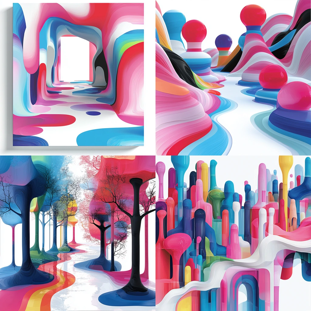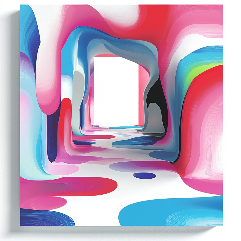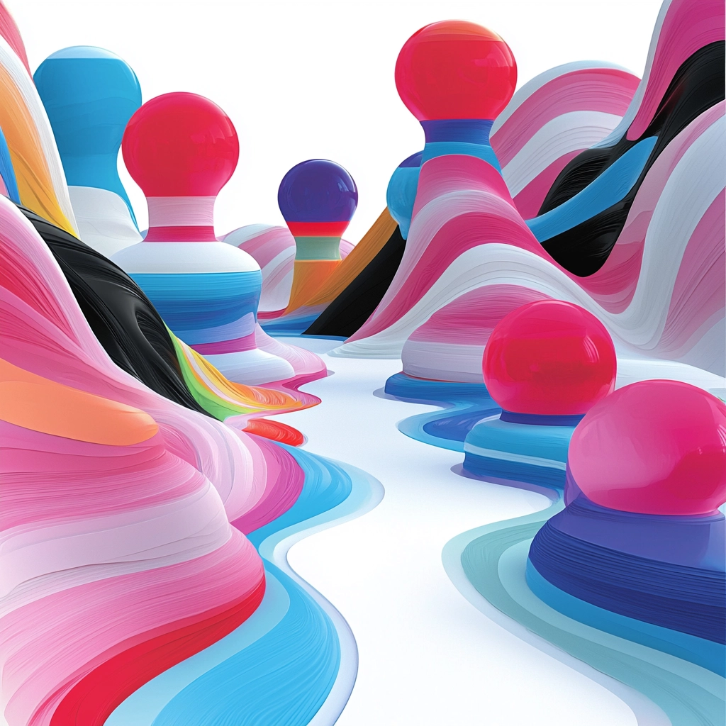 Smooth, precise color transitions dominate, with light creating a luminous, almost glossy appearance. Spatial depth is emphasized through overlapping layers and a polished surface texture.
