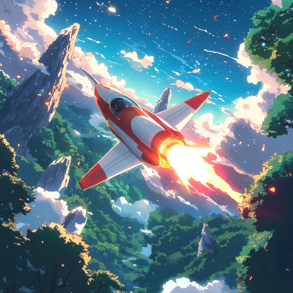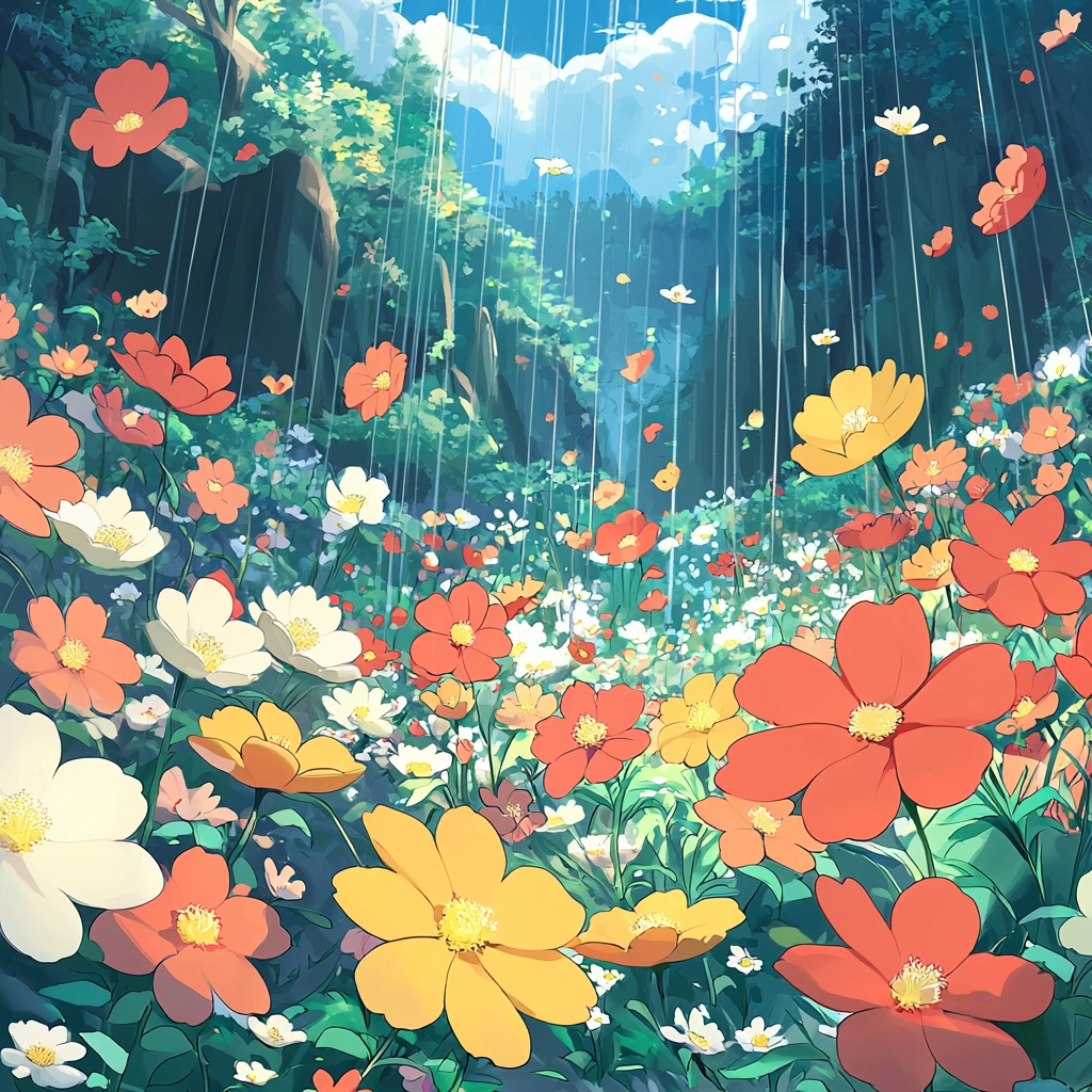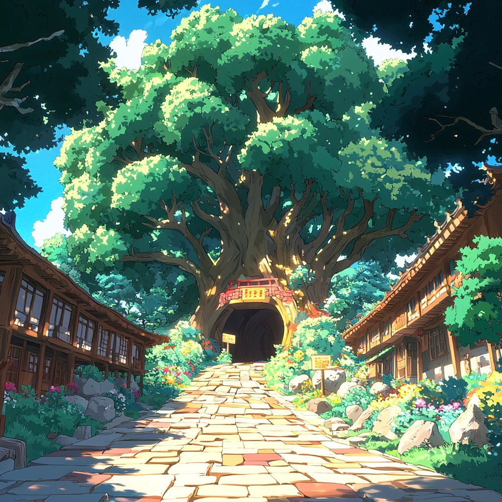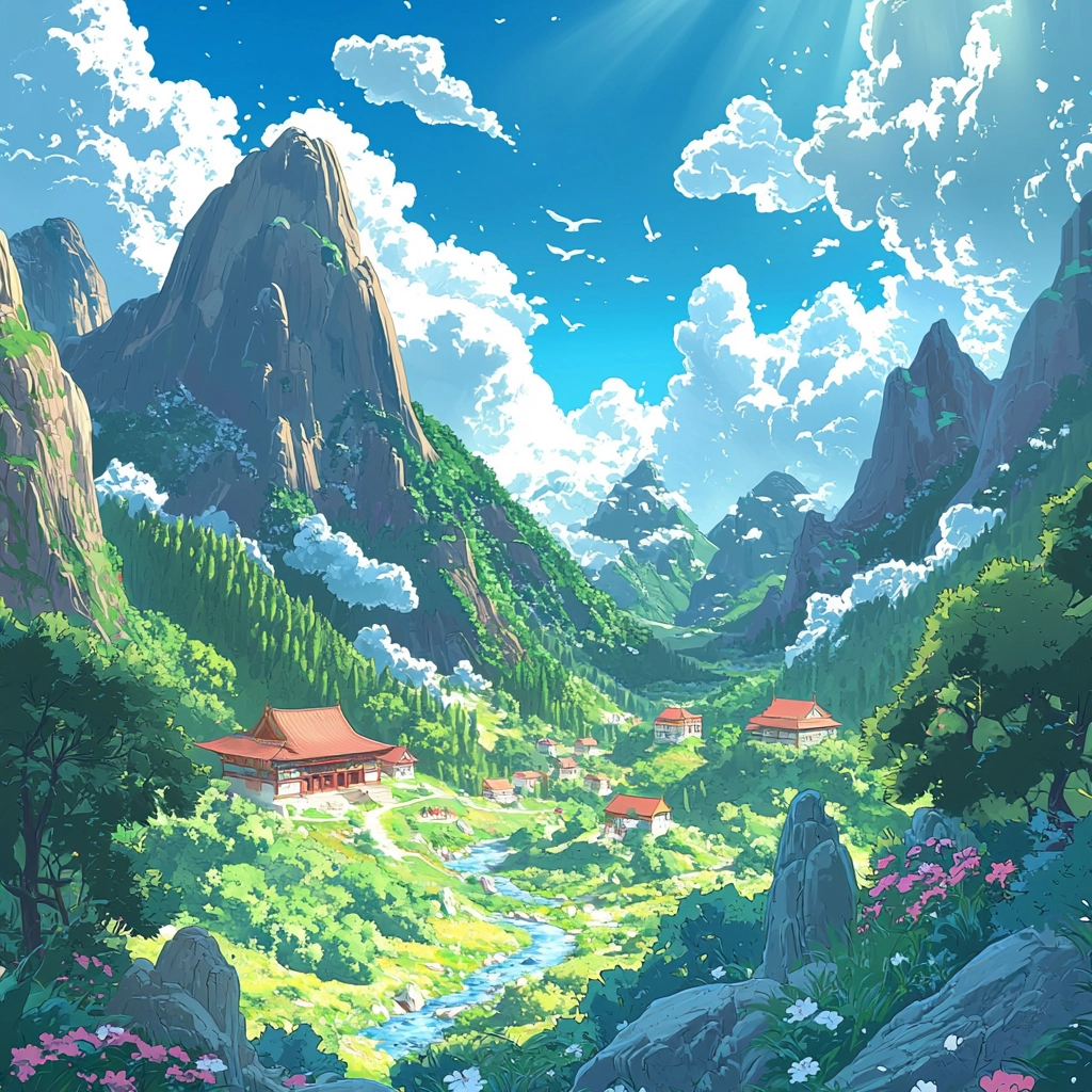 The lighting effects play a vital role, with strong contrasts between light and shadow. The colors are rich and vibrant, emphasizing the lush greenery and blues of the sky. The spatial sense is expansive, offering a wide perspective that draws the viewer in. Textures are detailed, giving a tactile quality to each element depicted.