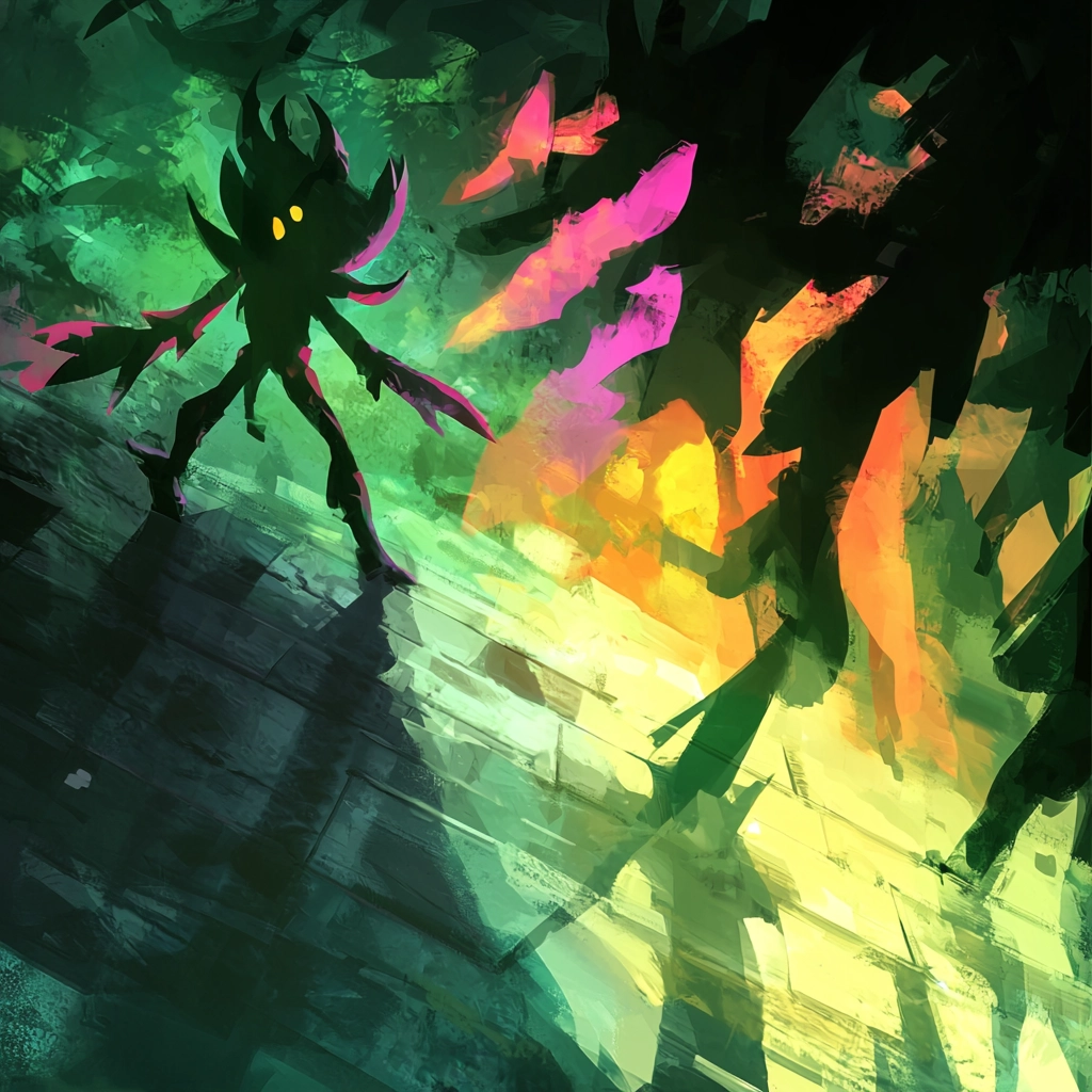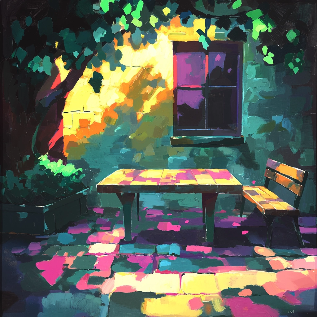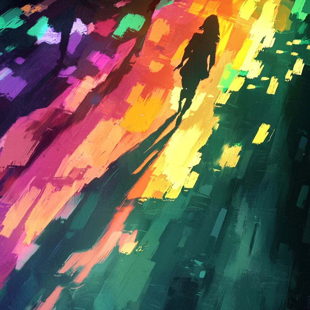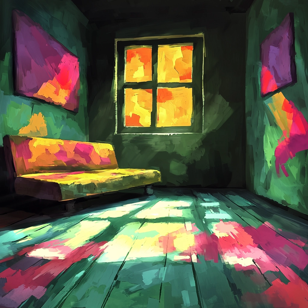 Lighting sharply contrasts with vivid colors that blend smoothly, enhancing spatial dimensions. The playful texture arises from bold, sweeping brushstrokes and intricate detailing, amplifying the sense of lively movement within the space.