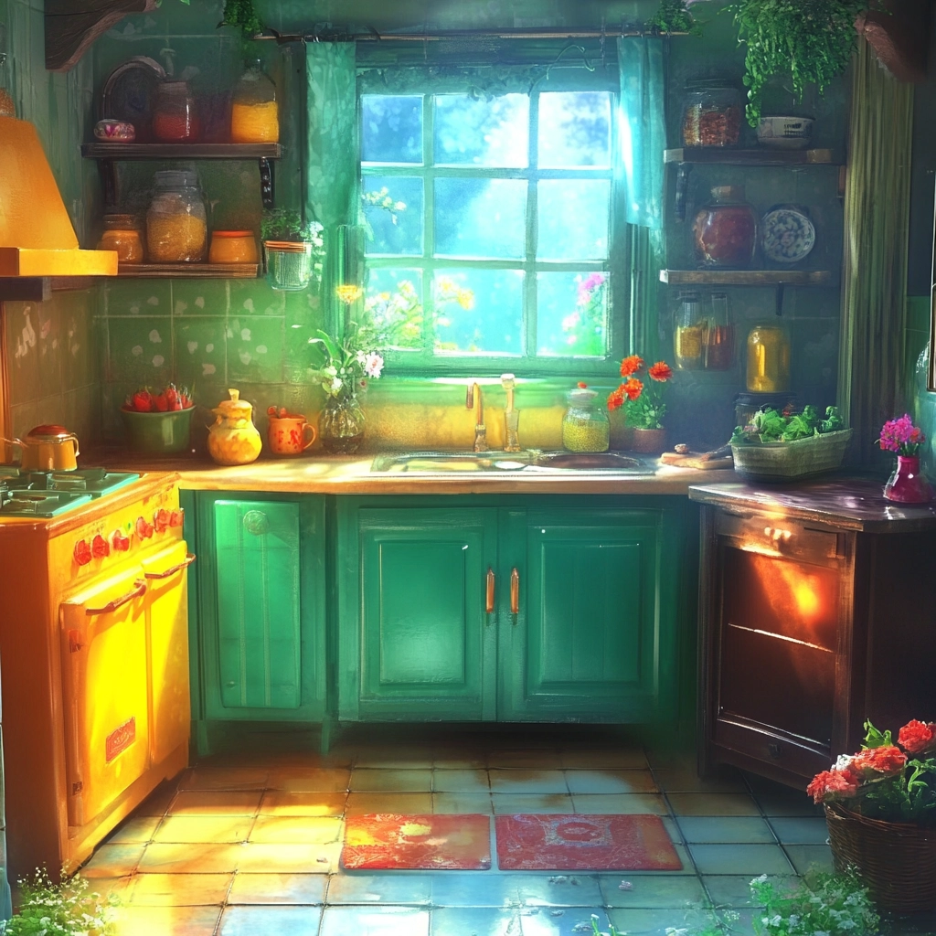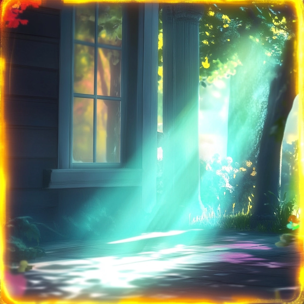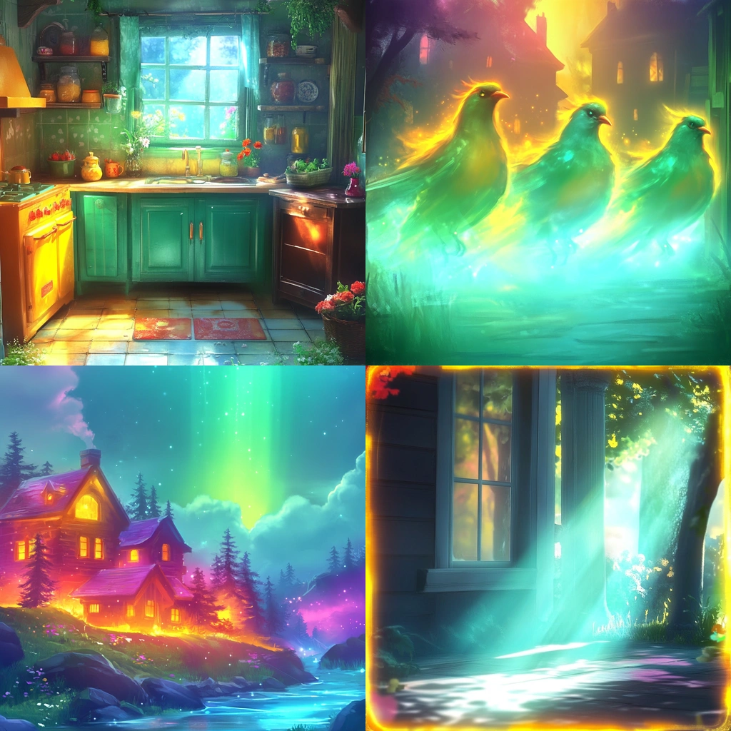 Lighting in the composition animates the colors, casting dynamic shadows and reflections. Rich greens and vibrant cyans contrast against the warm oranges, creating a sense of radiant movement with detailed textural depth.