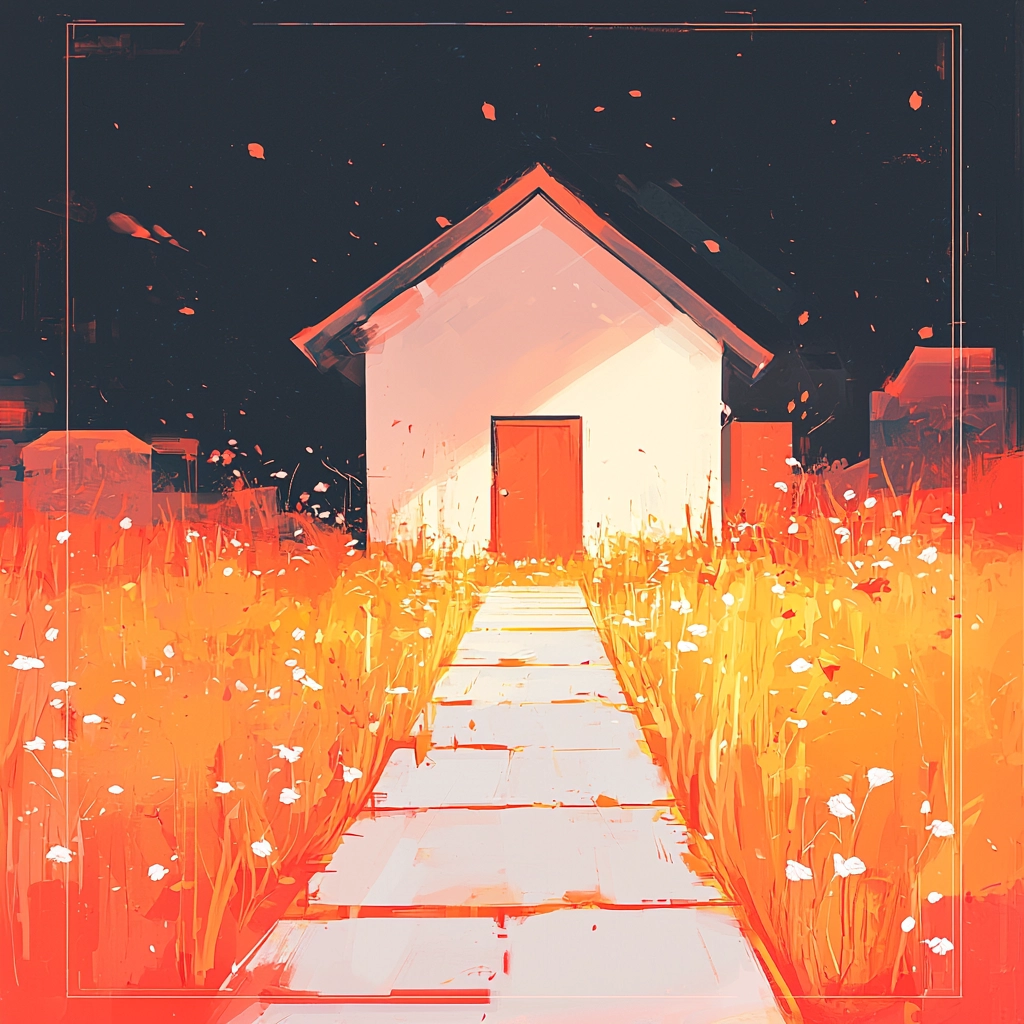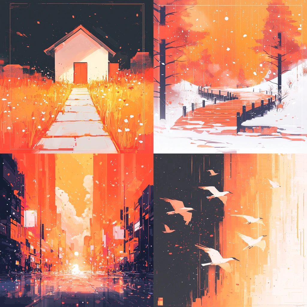 The lighting effects are striking, casting dramatic shadows and highlights against the vivid orange tones. The textures have a layered quality, creating depth and richness. The spatial arrangement draws the eye with dynamic pathways and open expanses, emphasizing color transitions.