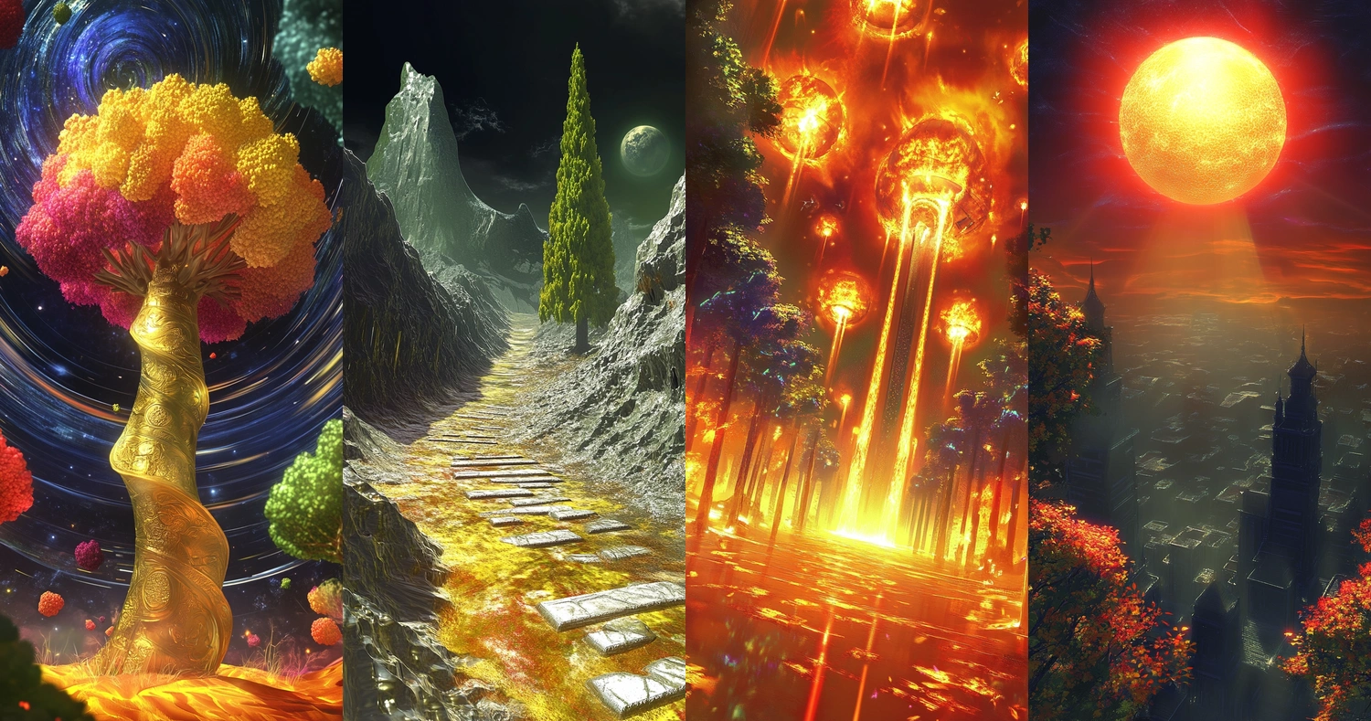Illuminated contrasts with dominant vibrant yellows and oranges set against a profound dark backdrop, creating dramatic lighting effects and dimensional depth with varied textures.