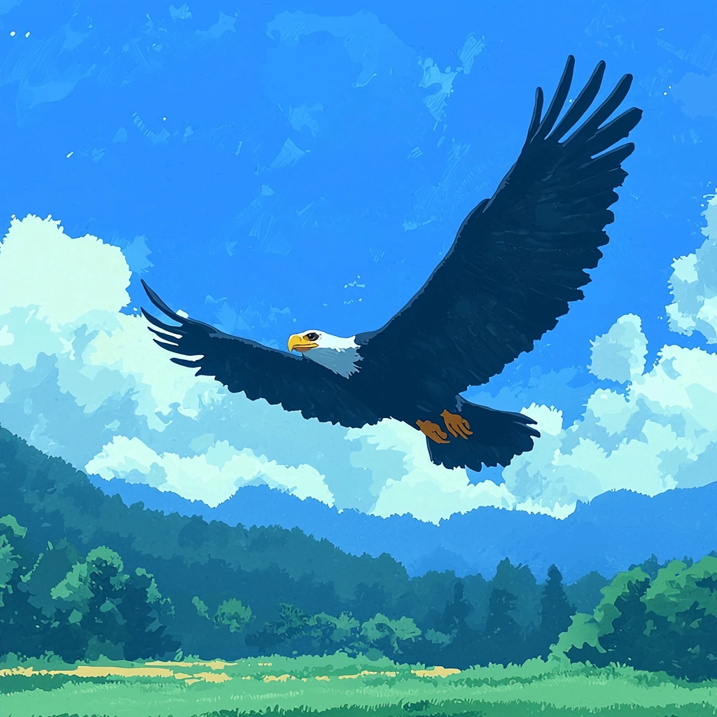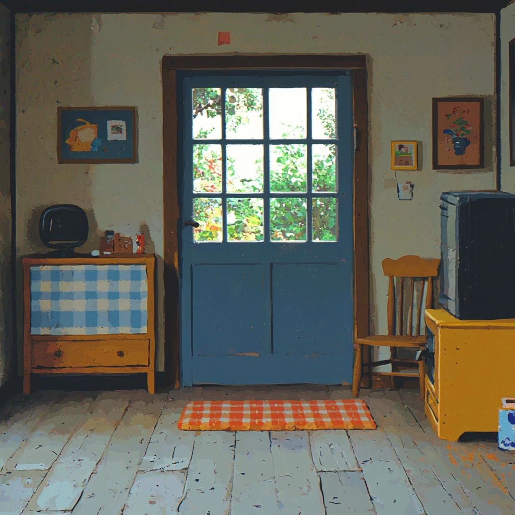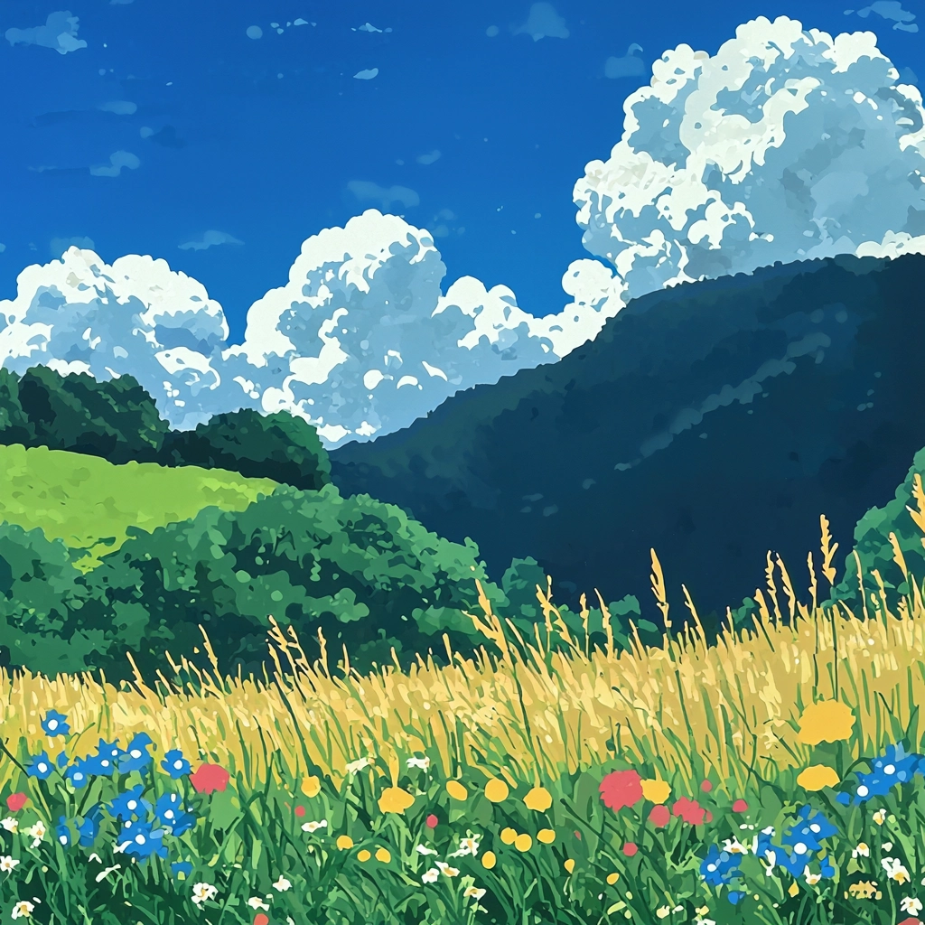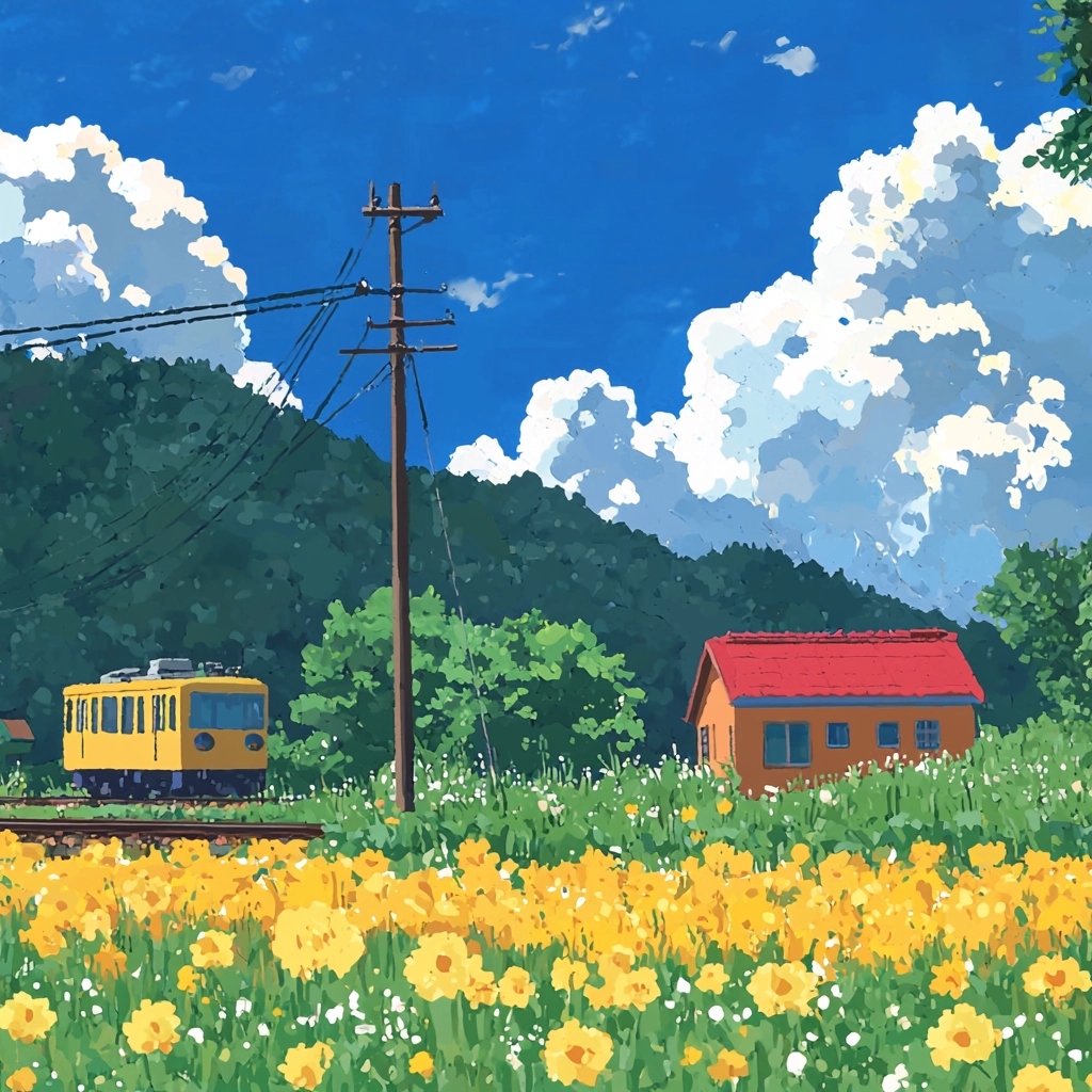 This art utilizes strong blue tones that dominate the sky, contrasting vividly with the vibrant yellows of natural elements. Textures are rendered with smooth brushwork, adding depth and a sense of tangible reality to the spaces depicted.