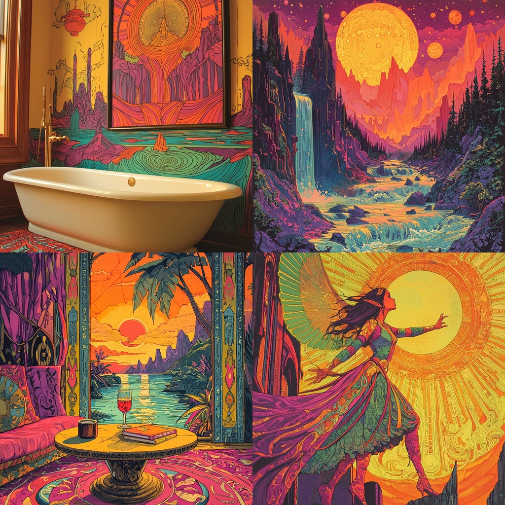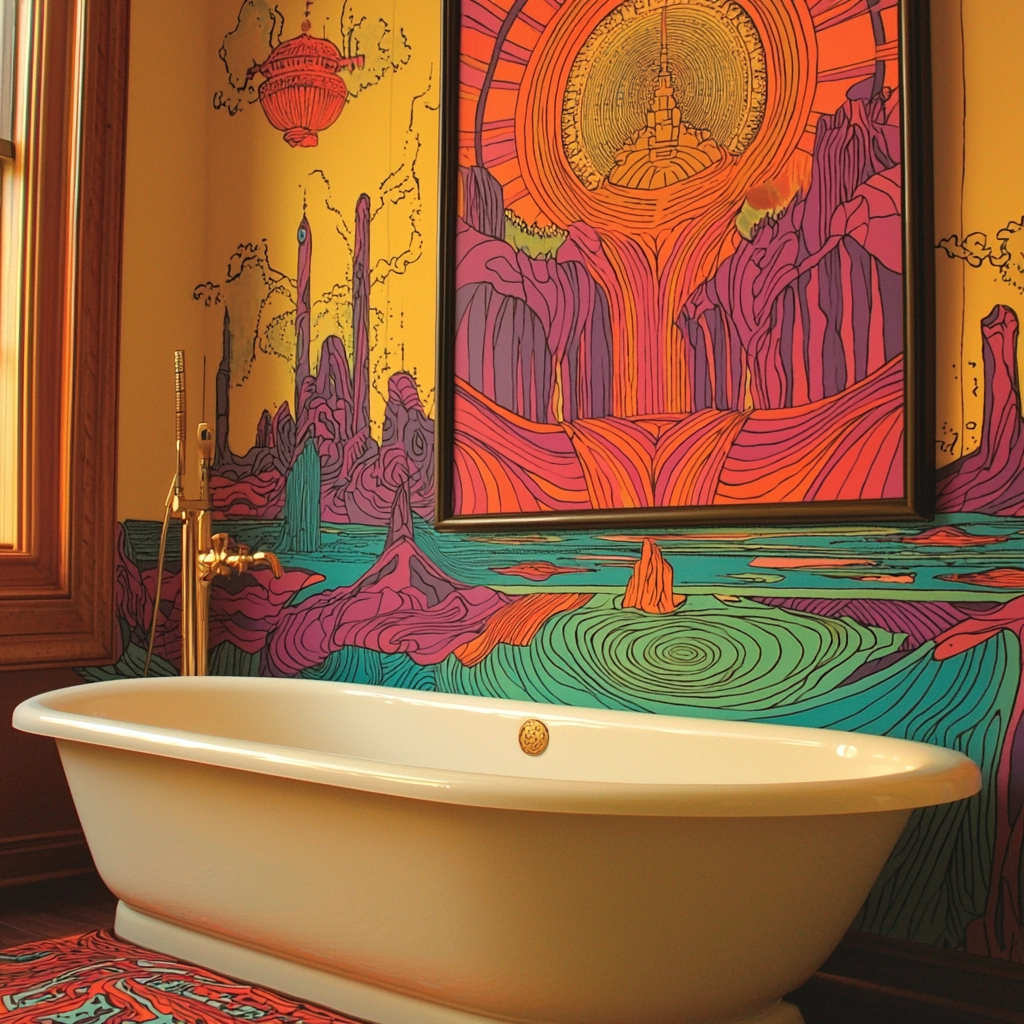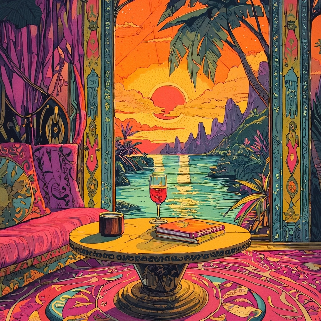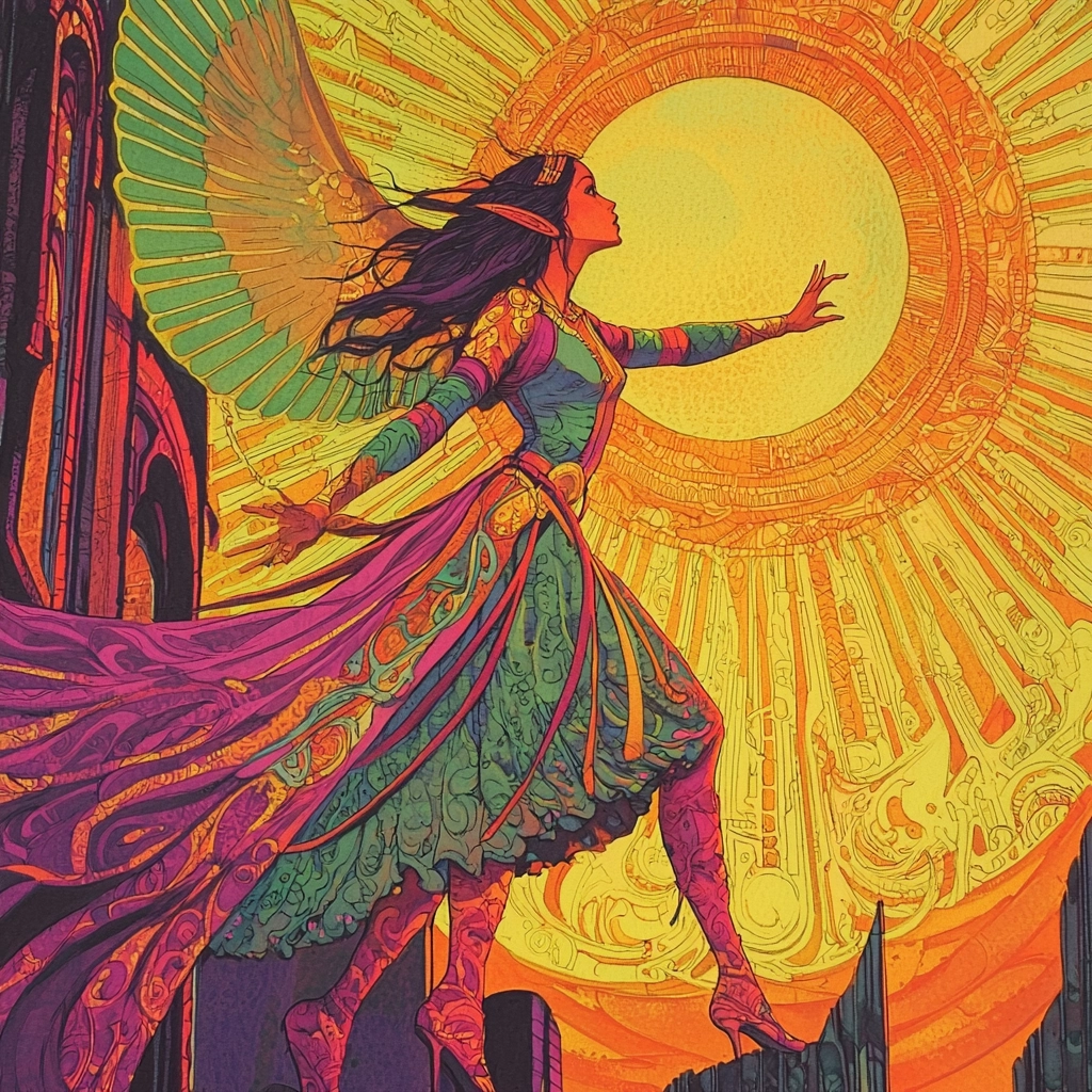 Dynamic use of vibrant colors with intricate patterning creates an exuberant visual rhythm.