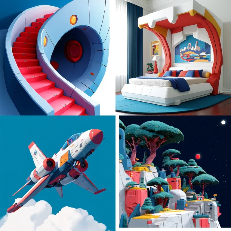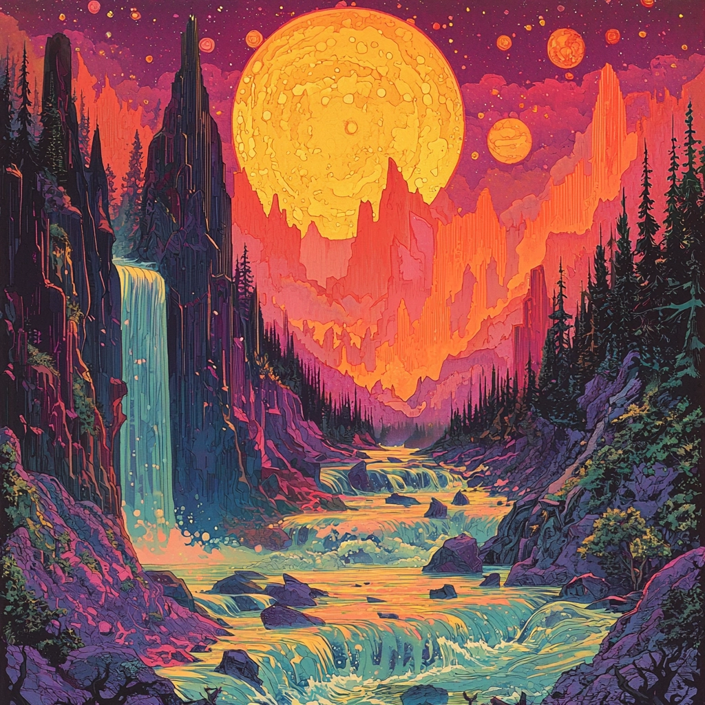 Bold lighting and saturated colors dominate the space, evoking a sense of swirling movement. Complex textures and layered patterns contribute to a richly woven visual tapestry that implies depth. The bold compositional structure enhances the vibrant color contrasts.