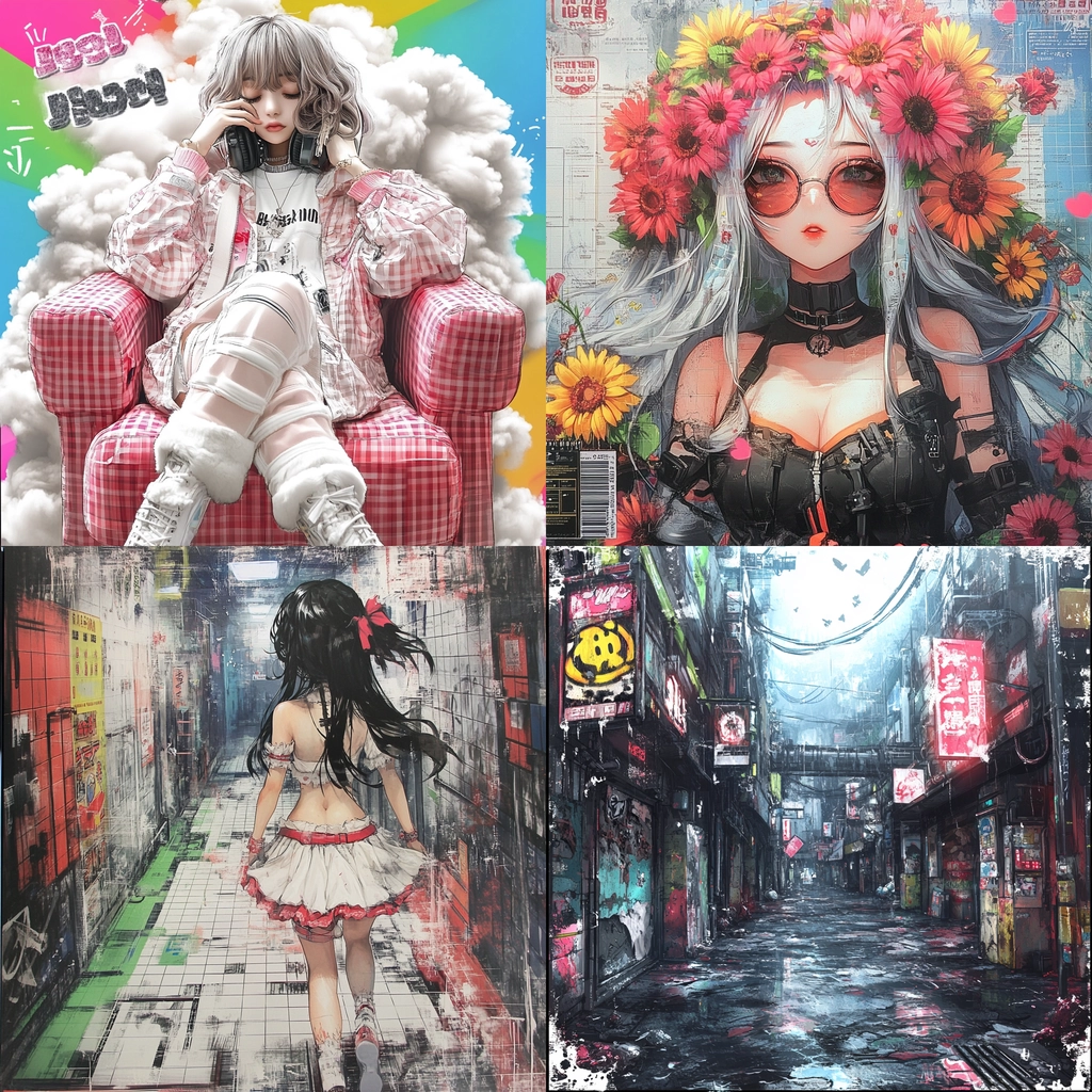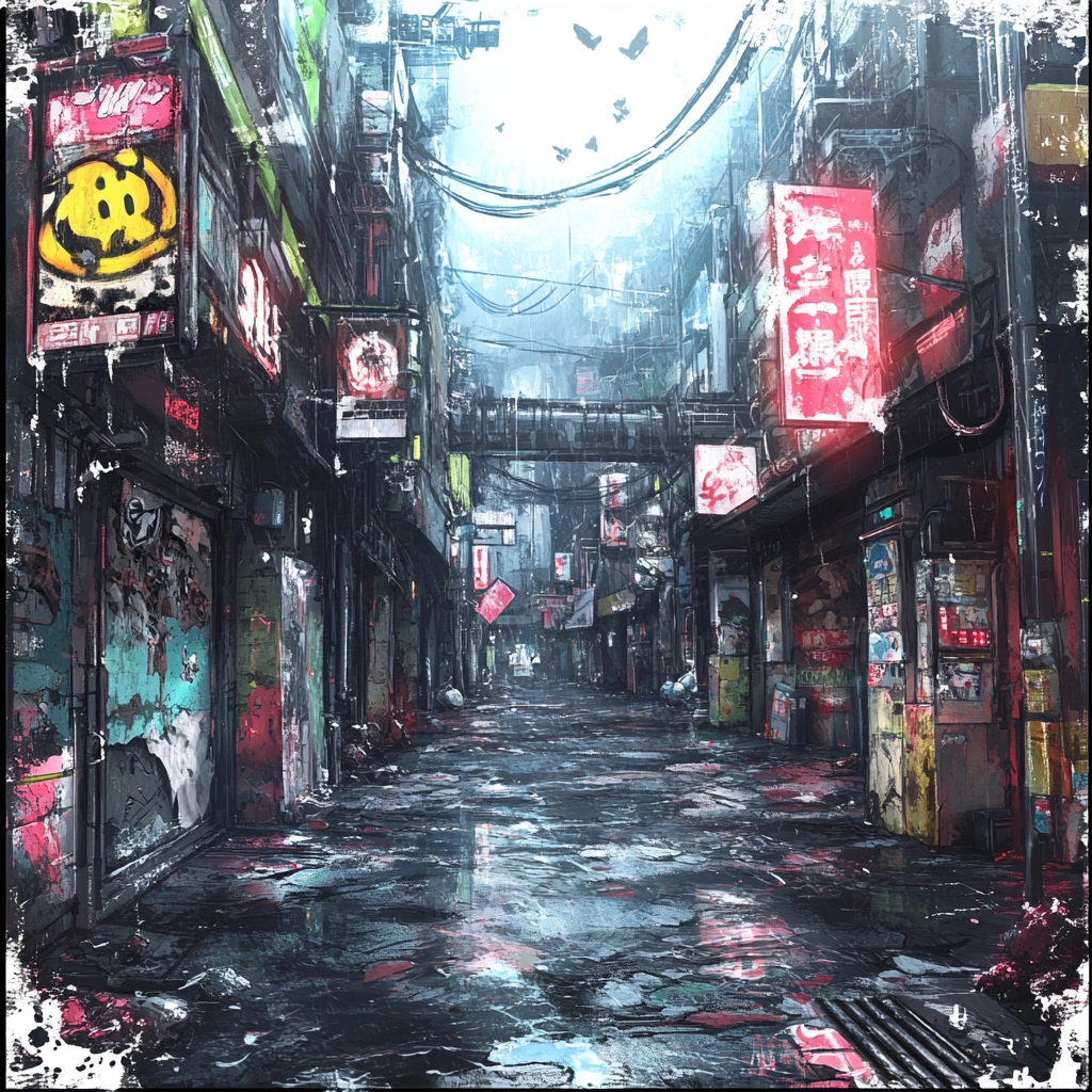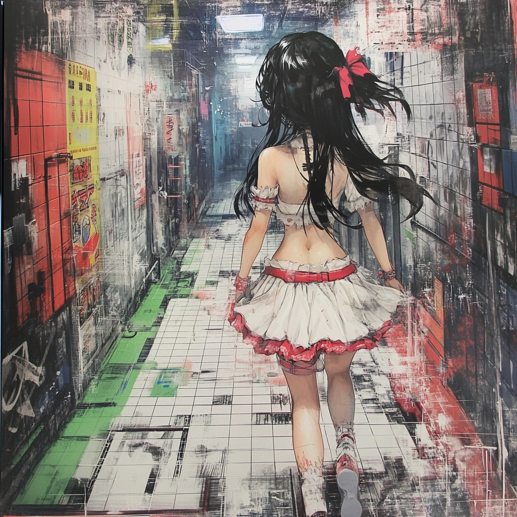 The lighting varies from bright neons to subdued shadows, emphasizing stark contrast. Red and pink hues dominate the visuals, creating depth and texture. Space is filled with intricate details enhancing dimensionality.