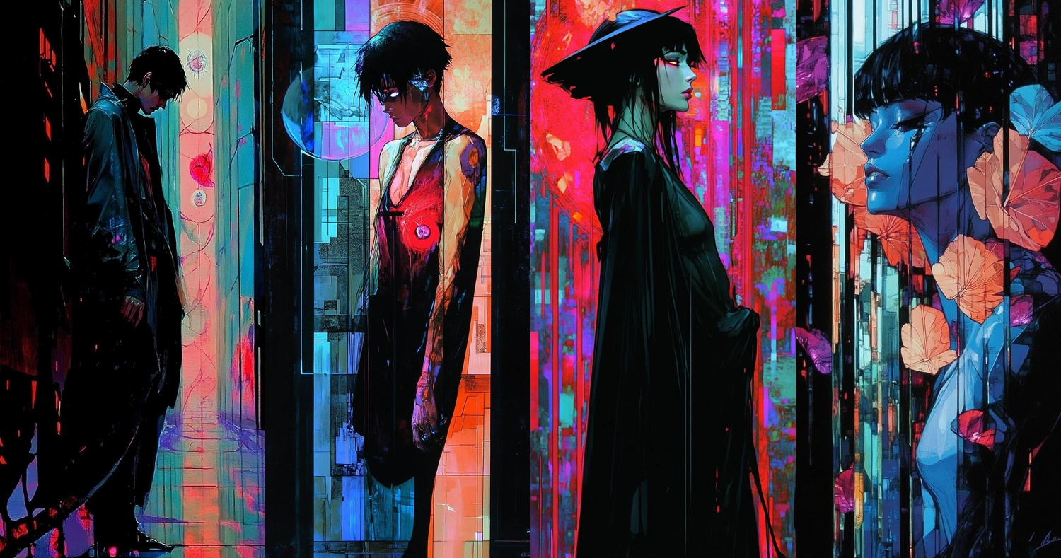 Dynamic and intense lighting effects enhance the vivid colors, creating a strong contrast between light and shadow, while textures appear smooth and sleek, adding depth to the spatial composition.