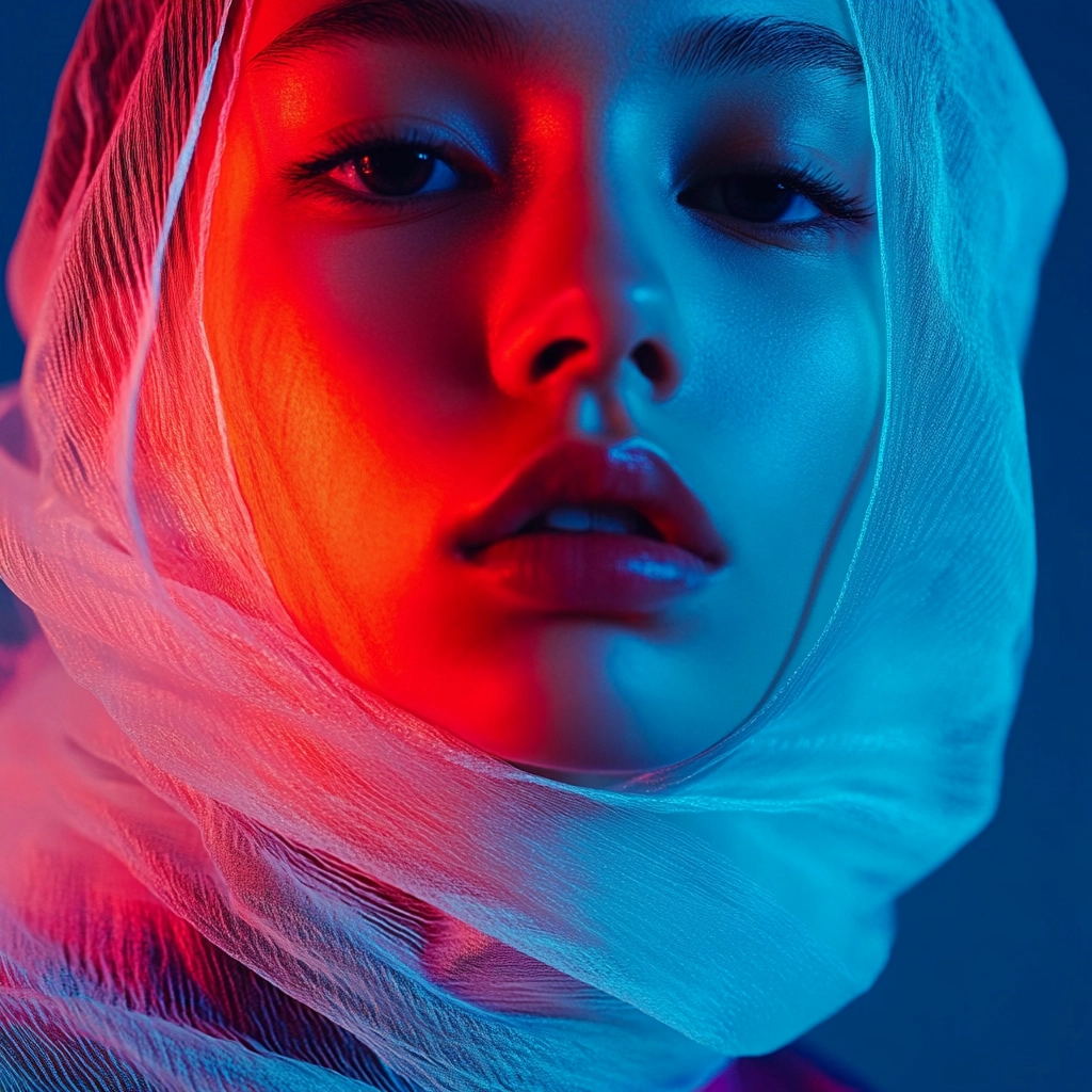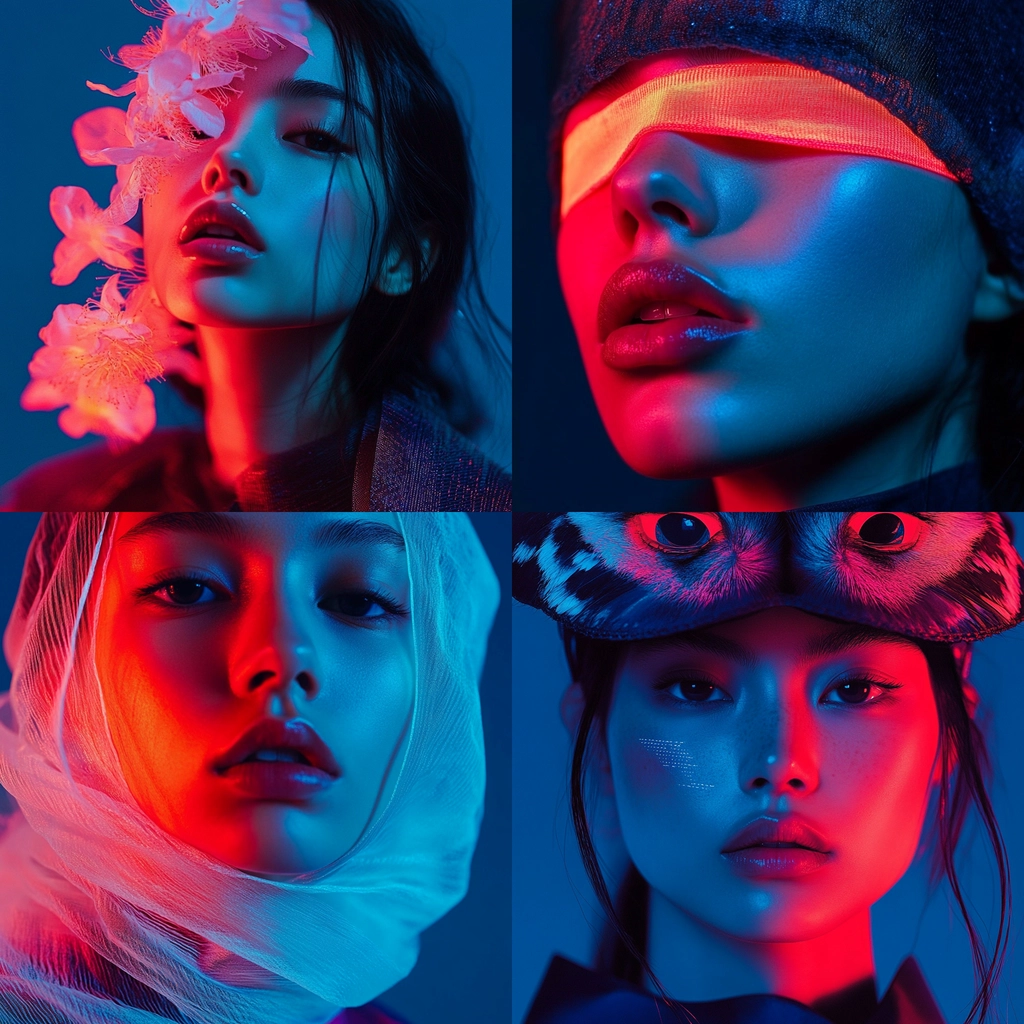 Utilizes dynamic lighting, creating high-intensity contrasts between vivid colors. Spatial arrangement emphasizes depth through color layering and lighting effects, highlighting textures with glowing outlines and shadows.
