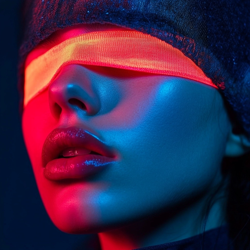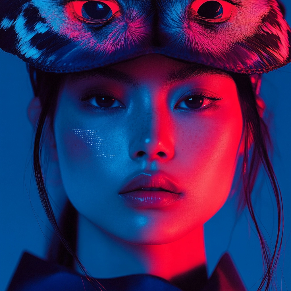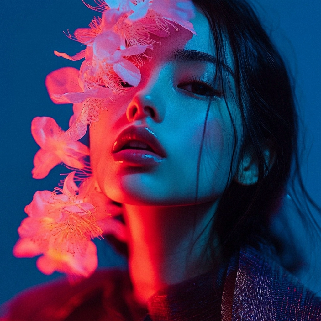 The composition uses strong neon lighting with vivid red and blue tones contrasting sharply.