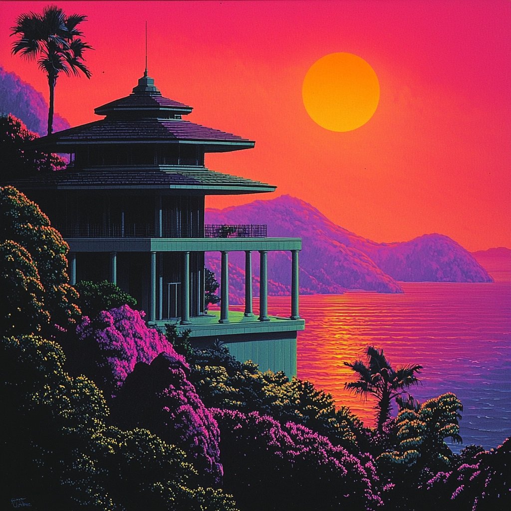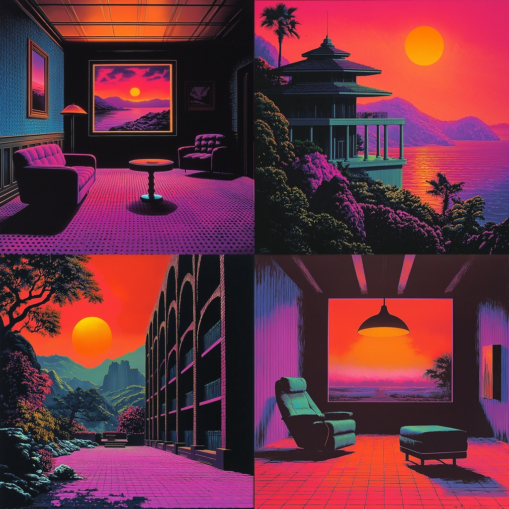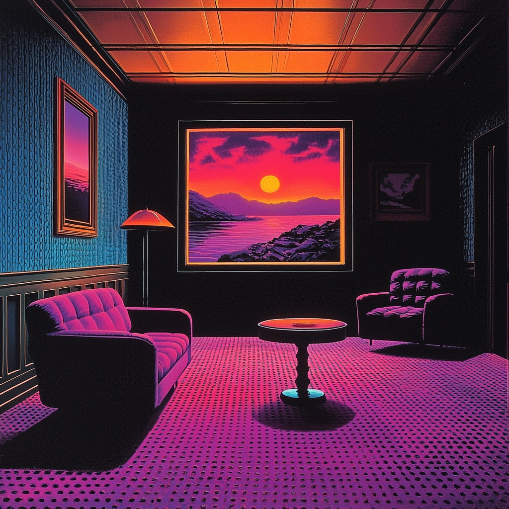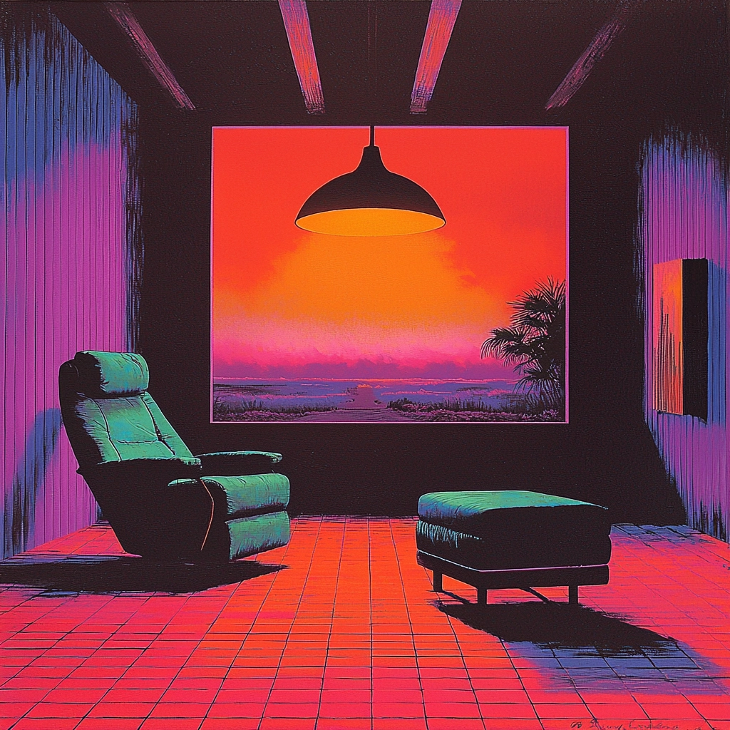 Focused lighting heightens contrasts between warm neon tones and cooler shadows. Rich, saturated colors dominate, creating depth within defined spatial compositions. Surfaces exhibit smooth, polished textures.
