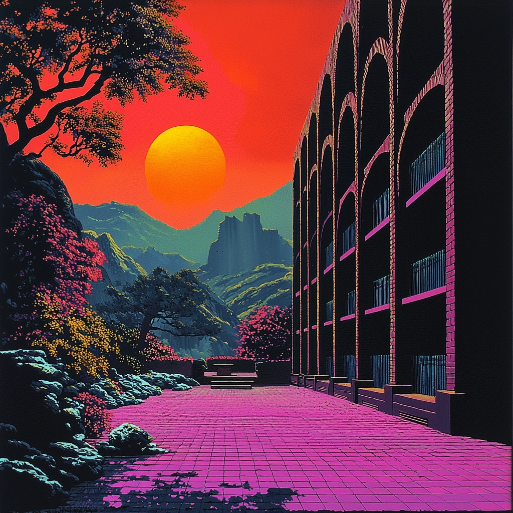 Dramatic neon hues emphasize contrasts and structured spaces.